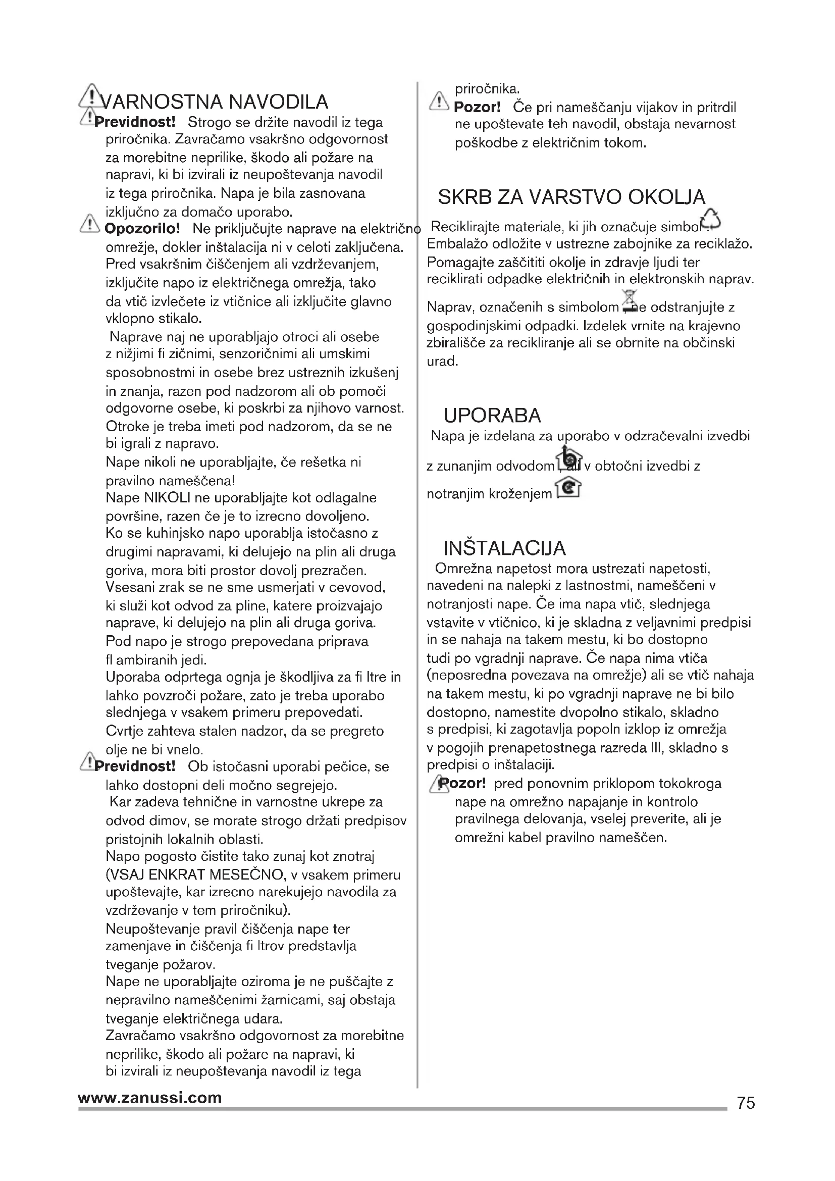 Reciklirajte materiale, ki jih označuje simbol . Embalažo odložite v ustrezne zabojnike za reciklažo. Pomagajte zaščititi okolje in zdravje ljudi ter reciklirati odpadke električnih in elektronskih naprav. Naprav, označenih s simbolom , ne odstranjujte z gospodinjskimi odpadki. Izdelek vrnite na krajevno zbirališče za recikliranje ali se obrnite na občinski urad. UPORABA Napa je izdelana za uporabo v odzračevalni izvedbi z zunanjim odvodom , ali v obtočni izvedbi z notranjim kroženjem . INŠTALACIJA Omrežna napetost mora ustrezati napetosti, navedeni na nalepki z lastnostmi, nameščeni v notranjosti nape. Če ima napa vtič, slednjega vstavite v vtičnico, ki je skladna z veljavnimi predpisi in se nahaja na takem mestu, ki bo dostopno tudi po vgradnji naprave. Če napa nima vtiča (neposredna povezava na omrežje) ali se vtič nahaja na takem mestu, ki po vgradnji naprave ne bi bilo dostopno, namestite dvopolno stikalo, skladno s predpisi, ki zagotavlja popoln izklop iz omrežja v pogojih prenapetostnega razreda III, skladno s predpisi o inštalaciji. Pozor! pred ponovnim priklopom tokokroga nape na omrežno napajanje in kontrolo pravilnega delovanja, vselej preverite, ali je omrežni kabel pravilno nameščen.76 www.zanussi.com Minimalna razdalja med podporno površino posod na kuhalni površini in spodnjim delom nape za kuhinjske prostore ne sme biti manjša od 43cm pri električnih štedilnikih in 65cm pri plinskih ali mešanih štedilnikih. Če je v navodilih za instalacijo plinskega kuhalnika napisana večja razdalja, jo je treba tudi upoštevati. VZDRŽEVANJE Pozor! Pred vsakršnim čiščenjem ali vzdrževanjem izključite električno napajanje nape, tako da vtič izvlečete iz vtičnice ali izklopite glavno stikalo. Napa zahteva pogosto čiščenje, tako zunaj kot znotraj. Za čiščenje uporabljajte krpo, navlaženo s tekočimi nevtralnimi detergenti. Izogibajte se uporabi izdelkov, ki vsebujejo abrazivne snovi. NE UPOBLJAJTE ALKOHOLA! Pozor! Neupoštevanje pravil za čiščenje naprave in zamenjavo fi ltrov predstavlja tveganje požarov. Zato vam svetujemo, da sledite priporočenim navodilom. Zavračamo vsakršno odgovornost za morebitno škodo na motorju in požare, ki bi bili posledica neprimernega vzdrževanja ali neupoštevanja zgornjih opozoril. Maščobni fi lter - Očistiti ga je treba enkrat mesečno z ne agresivnimi čistilnimi sredstvi, ročno ali v pomivalnem stroju pri nizki temperaturi in kratkim ciklom pranja. S pranjem v pomivalnem stroju se maščobni fi lter lahko razbarva, toda njegove fi ltrirne značilnosti ostanejo nespremenjene. Nepralni fi lter z aktivnim ogljem Ogleni fi lter je potrebno zamenjati po daljši uporabi, glede na tip kuhe ter redno čiščenje maščobnega fi ltra. Vsekakor je potrebno zamenjati vložek najmanj vsake štiri mesece. Filter ni niti pralen niti obnovljiv. Clack!