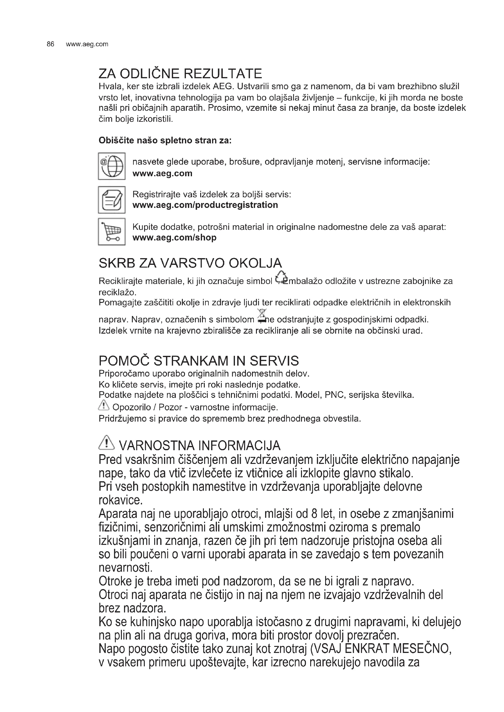 VARNOSTNA NAVODILA Kar zadeva tehnične in varnostne ukrepe za odvod dimov, morate strogo upoštevati določbe pristojnih krajevnih organov. Vsesani zrak se ne sme usmerjati v cevovod, ki služi kot odvod za pline, katere proizvajajo naprave, ki delujejo na plin ali druga goriva. Nape ne uporabljajte oziroma je ne puščajte z nepravilno nameščenimi žarnicami, saj obstaja tveganje električnega udara. Nape nikoli ne uporabljajte, če rešetka ni pravilno nameščena! Nape NIKOLI ne uporabljajte kot odlagalne površine, razen če je to izrecno dovoljeno. Za nameščanje izdelka uporabite le priložene pritrdilne vijake. Če jih ni na voljo, pa kupite pravo vrsto vijakov. Uporabite vijake prave dolžine, ki so navedeni v navodilih za namestitev. V primeru dvomov se posvetujte s pooblaščenim servisnim centrom ali s podobno usposobljeno osebo. Pozor! Če pri montaži vijakov in pritrdilnih elementov ne upoštevate teh navodil, obstaja nevarnost električnega udara. 2.UPORABA Napa odsesava dimne pline in pare, ki nastajajo med kuhanjem. V priloženem priročniku z navodili za namestitev je navedeno, katero različico lahko uporabite pri vašem modelu nape: odzračevalno ali obtočno . 3.INŠTALACIJA Omrežna napetost mora ustrezati napetosti, navedeni na nalepki z lastnostmi, nameščeni v notranjosti nape. Če ima napa vtič, slednjega vstavite v vtičnico, ki je skladna z veljavnimi predpisi in se nahaja na takem mestu, ki bo dostopno tudi po vgradnji naprave. Če napa nima vtiča (neposredna povezava na omrežje) ali se vtič nahaja na takem mestu, ki po vgradnji naprave ne bi bilo dostopno, namestite dvopolno stikalo, skladno s predpisi, ki zagotavlja popoln izklop iz omrežja v pogojih prenapetostnega razreda III, skladno s predpisi o inštalaciji. Pozor! pred ponovnim priklopom tokokroga nape na omrežno napajanje in kontrolo pravilnega delovanja, vselej preverite, ali je omrežni kabel pravilno nameščen.www.aeg.com