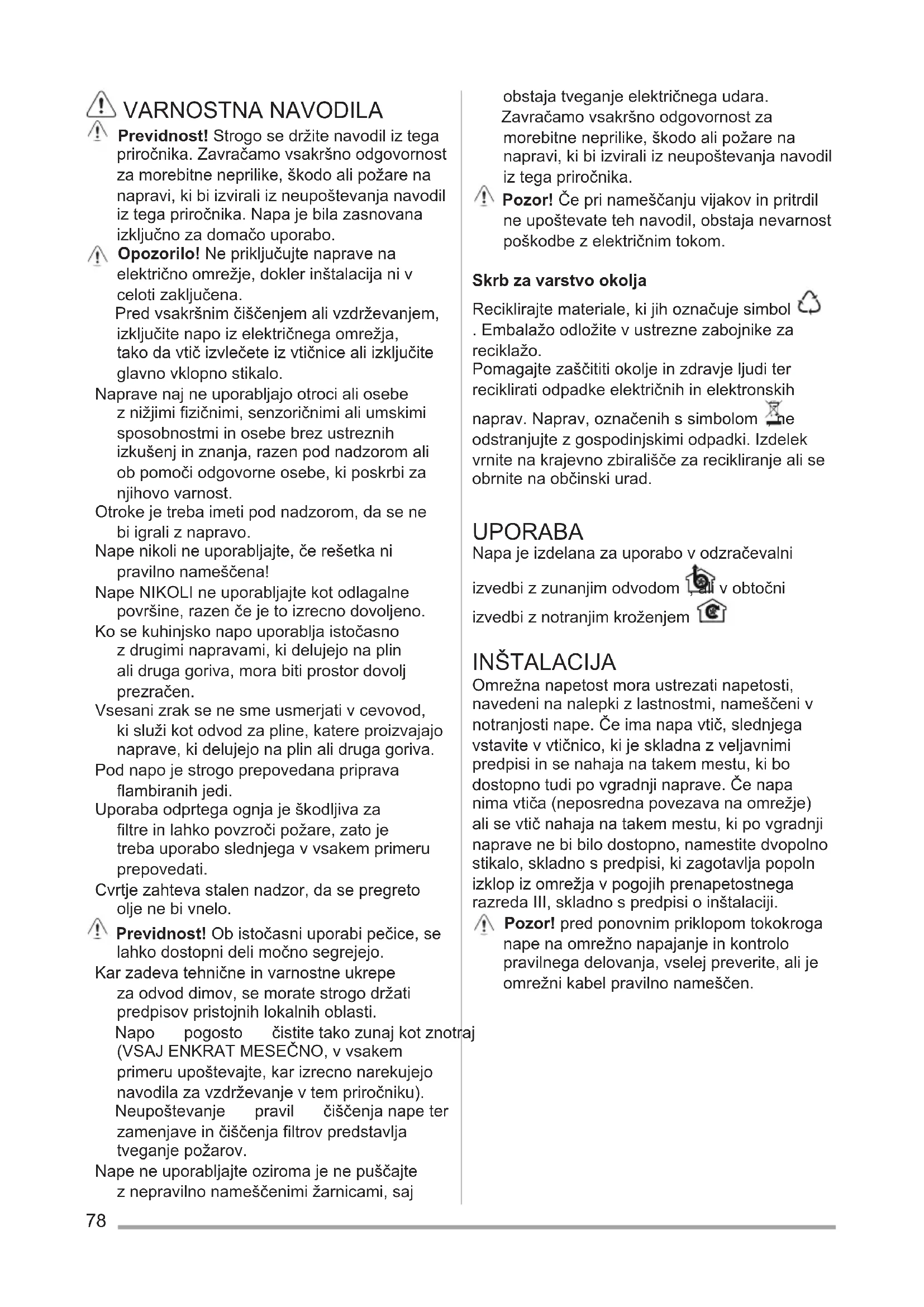 srednja (4.), maksimalna (5.). RASVJETA Iskopčajte aparat s električne mreže. Pozor! Prije nego što dodirnete lampe provjerite jesu li se ohladile. Koristite samo halogene lampe od 12V - 20W maks - G4, i pripazite da ih ne dirate rukama.78 VARNOSTNA NAVODILA Previdnost! Strogo se držite navodil iz tega priročnika. Zavračamo vsakršno odgovornost za morebitne neprilike, škodo ali požare na napravi, ki bi izvirali iz neupoštevanja navodil iz tega priročnika. Napa je bila zasnovana izključno za domačo uporabo. Opozorilo! Ne priključujte naprave na električno omrežje, dokler inštalacija ni v celoti zaključena. Pred vsakršnim čiščenjem ali vzdrževanjem, izključite napo iz električnega omrežja, tako da vtič izvlečete iz vtičnice ali izključite glavno vklopno stikalo. Naprave naj ne uporabljajo otroci ali osebe z nižjimi fizičnimi, senzoričnimi ali umskimi sposobnostmi in osebe brez ustreznih izkušenj in znanja, razen pod nadzorom ali ob pomoči odgovorne osebe, ki poskrbi za njihovo varnost. Otroke je treba imeti pod nadzorom, da se ne bi igrali z napravo. Nape nikoli ne uporabljajte, če rešetka ni pravilno nameščena! Nape NIKOLI ne uporabljajte kot odlagalne površine, razen če je to izrecno dovoljeno. Ko se kuhinjsko napo uporablja istočasno z drugimi napravami, ki delujejo na plin ali druga goriva, mora biti prostor dovolj prezračen. Vsesani zrak se ne sme usmerjati v cevovod, ki služi kot odvod za pline, katere proizvajajo naprave, ki delujejo na plin ali druga goriva. Pod napo je strogo prepovedana priprava flambiranih jedi. Uporaba odprtega ognja je škodljiva za filtre in lahko povzroči požare, zato je treba uporabo slednjega v vsakem primeru prepovedati. Cvrtje zahteva stalen nadzor, da se pregreto olje ne bi vnelo. Previdnost! Ob istočasni uporabi pečice, se lahko dostopni deli močno segrejejo. Kar zadeva tehnične in varnostne ukrepe za odvod dimov, se morate strogo držati predpisov pristojnih lokalnih oblasti. Napo pogosto čistite tako zunaj kot znotraj (VSAJ ENKRAT MESEČNO, v vsakem primeru upoštevajte, kar izrecno narekujejo navodila za vzdrževanje v tem priročniku). Neupoštevanje pravil čiščenja nape ter zamenjave in čiščenja filtrov predstavlja tveganje požarov. Nape ne uporabljajte oziroma je ne puščajte z nepravilno nameščenimi žarnicami, saj obstaja tveganje električnega udara. Zavračamo vsakršno odgovornost za morebitne neprilike, škodo ali požare na napravi, ki bi izvirali iz neupoštevanja navodil iz tega priročnika. Pozor! Če pri nameščanju vijakov in pritrdil ne upoštevate teh navodil, obstaja nevarnost poškodbe z električnim tokom. Skrb za varstvo okolja Reciklirajte materiale, ki jih označuje simbol . Embalažo odložite v ustrezne zabojnike za reciklažo. Pomagajte zaščititi okolje in zdravje ljudi ter reciklirati odpadke električnih in elektronskih naprav. Naprav, označenih s simbolom , ne odstranjujte z gospodinjskimi odpadki. Izdelek vrnite na krajevno zbirališče za recikliranje ali se obrnite na občinski urad. UPORABA Napa je izdelana za uporabo v odzračevalni izvedbi z zunanjim odvodom , ali v obtočni izvedbi z notranjim kroženjem . INŠTALACIJA Omrežna napetost mora ustrezati napetosti, navedeni na nalepki z lastnostmi, nameščeni v notranjosti nape. Če ima napa vtič, slednjega vstavite v vtičnico, ki je skladna z veljavnimi predpisi in se nahaja na takem mestu, ki bo dostopno tudi po vgradnji naprave. Če napa nima vtiča (neposredna povezava na omrežje) ali se vtič nahaja na takem mestu, ki po vgradnji naprave ne bi bilo dostopno, namestite dvopolno stikalo, skladno s predpisi, ki zagotavlja popoln izklop iz omrežja v pogojih prenapetostnega razreda III, skladno s predpisi o inštalaciji. Pozor! pred ponovnim priklopom tokokroga nape na omrežno napajanje in kontrolo pravilnega delovanja, vselej preverite, ali je omrežni kabel pravilno nameščen.79 Minimalna razdalja med podporno površino posod na kuhalni površini in spodnjim delom nape za kuhinjske prostore ne sme biti manjša od 50cm pri električnih štedilnikih in 65cm pri plinskih ali mešanih štedilnikih. Če je v navodilih za instalacijo plinskega kuhalnika napisana večja razdalja, jo je treba tudi upoštevati. VZDRŽEVANJE Pozor! Pred vsakršnim čiščenjem ali vzdrževanjem izključite električno napajanje nape, tako da vtič izvlečete iz vtičnice ali izklopite glavno stikalo. Napa zahteva pogosto čiščenje, tako zunaj kot znotraj. Za čiščenje uporabljajte krpo, navlaženo s tekočimi nevtralnimi detergenti. Izogibajte se uporabi izdelkov, ki vsebujejo abrazivne snovi. NE UPOBLJAJTE ALKOHOLA! Pozor! Neupoštevanje pravil za čiščenje naprave in zamenjavo filtrov predstavlja tveganje požarov. Zato vam svetujemo, da sledite priporočenim navodilom. Zavračamo vsakršno odgovornost za morebitno škodo na motorju in požare, ki bi bili posledica neprimernega vzdrževanja ali neupoštevanja zgornjih opozoril. Maščobni filter - Očistiti ga je treba enkrat mesečno z ne agresivnimi čistilnimi sredstvi, ročno ali v pomivalnem stroju pri nizki temperaturi in kratkim ciklom pranja. S pranjem v pomivalnem stroju se maščobni filter lahko razbarva, toda njegove filtrirne značilnosti ostanejo nespremenjene. Type 20 LONG LIFE - Pralni filter z aktivnim ogljem Ogleni filter se lahko opere vsake dva meseca v topli vodi in ustreznimi čistilnimi sredstvi ali v pomivalnem stroju pri 65°C (v primeru pranja v pomivalnem stroju izvedite popoln pralni cikel brez posode v stroju). Odstranite odvečno vodo, ne da bi pri tem poškodovali filter, nato snemite vložek, ki se nahaja v notranjosti plastičnega ogrodja in ga dajte v peč za 10 minut na temperaturi 100°C, da ga v celoti posušite. Vložek zamenjajte vsaka 3 leta in vsakič, ko na njem odkrijete poškodbe. Type 15 - Nepralni filter z aktivnim ogljem Ogleni filter je potrebno zamenjati po daljši uporabi, glede na tip kuhe ter redno čiščenje 