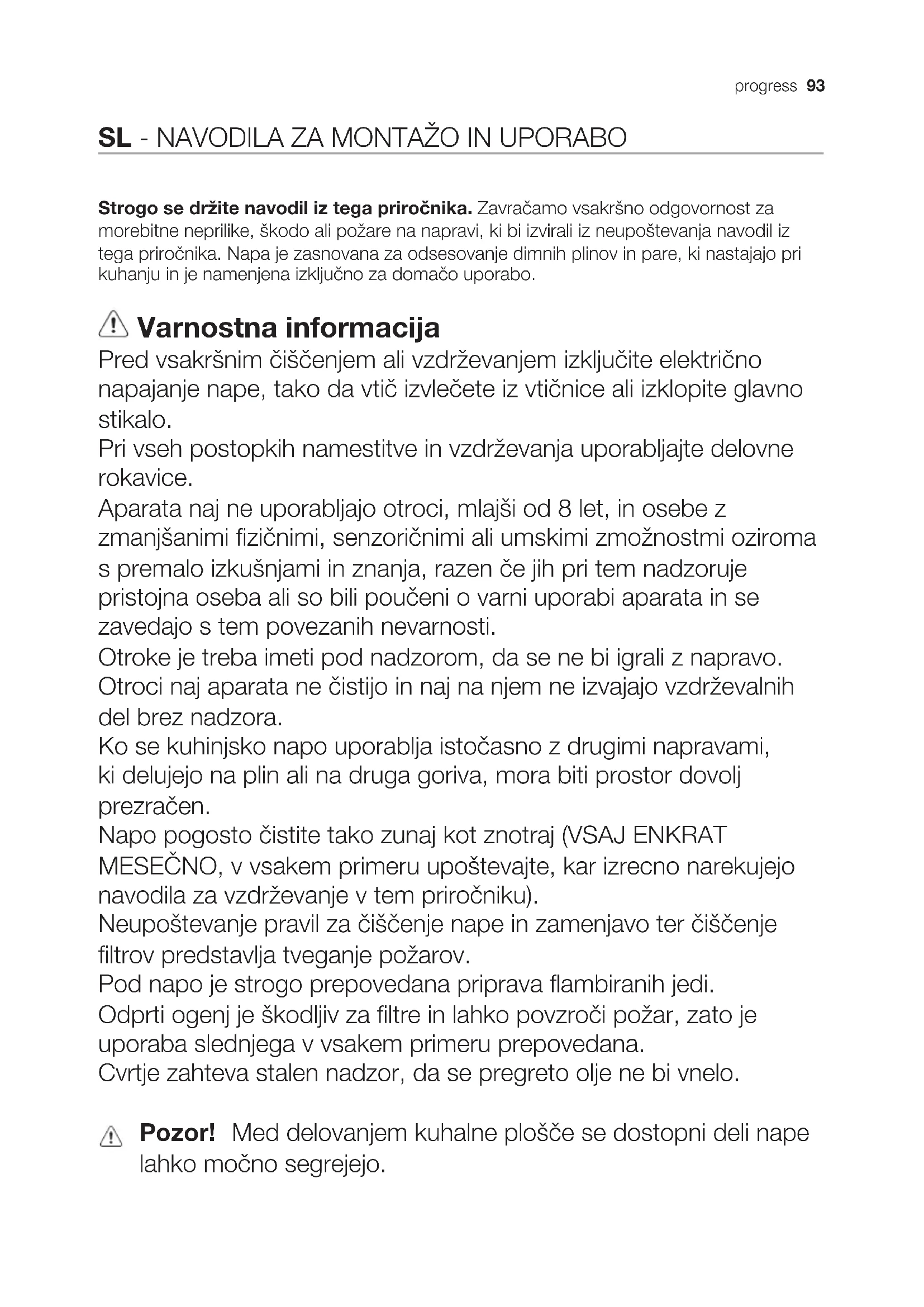 E14 Napětí (V) Rozměry (mm) 220-240 35x102 (Průměr x Délka) Označení ILCOS D (podle normy IEC 61231) DRBB/C3220240E1435/102progress 93 SL NAVODILA ZA MONTAŽO IN UPORABO Strogo se držite navodil iz tega priročnika. Zavračamo vsakršno odgovornost za morebitne neprilike, škodo ali požare na napravi, ki bi izvirali iz neupoštevanja navodil iz tega priročnika. Napa je zasnovana za odsesovanje dimnih plinov in pare, ki nastajajo pri kuhanju in je namenjena izključno za domačo uporabo. Varnostna informacija Pred vsakršnim čiščenjem ali vzdrževanjem izključite električno napajanje nape, tako da vtič izvlečete iz vtičnice ali izklopite glavno stikalo. Pri vseh postopkih namestitve in vzdrževanja uporabljajte delovne rokavice. Aparata naj ne uporabljajo otroci, mlajši od 8 let, in osebe z zmanjšanimi fizičnimi, senzoričnimi ali umskimi zmožnostmi oziroma s premalo izkušnjami in znanja, razen če jih pri tem nadzoruje pristojna oseba ali so bili poučeni o varni uporabi aparata in se zavedajo s tem povezanih nevarnosti. Otroke je treba imeti pod nadzorom, da se ne bi igrali z napravo. Otroci naj aparata ne čistijo in naj na njem ne izvajajo vzdrževalnih del brez nadzora. Ko se kuhinjsko napo uporablja istočasno z drugimi napravami, ki delujejo na plin ali na druga goriva, mora biti prostor dovolj prezračen. Napo pogosto čistite tako zunaj kot znotraj (VSAJ ENKRAT MESEČNO, v vsakem primeru upoštevajte, kar izrecno narekujejo navodila za vzdrževanje v tem priročniku). Neupoštevanje pravil za čiščenje nape in zamenjavo ter čiščenje filtrov predstavlja tveganje požarov. Pod napo je strogo prepovedana priprava flambiranih jedi. Odprti ogenj je škodljiv za filtre in lahko povzroči požar, zato je uporaba slednjega v vsakem primeru prepovedana. Cvrtje zahteva stalen nadzor, da se pregreto olje ne bi vnelo. Pozor! Med delovanjem kuhalne plošče se dostopni deli nape lahko močno segrejejo.94 progress Varnostna navodila Pri menjavi uporabite le tip žarnice, ki je naveden v poglavju o vzdrževanju/ zamenjavi žarnice v teh navodilih. Pozor! Naprave ne priključujte na električno omrežje, dokler inštalacija ni v celoti zaključena. Kar zadeva tehnične in varnostne ukrepe za odvod dimov, morate strogo upoštevati določbe pristojnih krajevnih organov. Vsesani zrak se ne sme usmerjati v cevovod, ki služi kot odvod za pline, katere proizvajajo naprave, ki delujejo na plin ali druga goriva. Nape ne uporabljajte oziroma je ne puščajte z nepravilno nameščenimi žarnicami, saj obstaja tveganje električnega udara. Nape nikoli ne uporabljajte, če rešetka ni pravilno nameščena! Nape NIKOLI ne uporabljajte kot odlagalne površine, razen če je to izrecno dovoljeno. Za nameščanje izdelka uporabite le priložene pritrdilne vijake. Če jih ni na voljo, pa kupite pravo vrsto vijakov. Uporabite vijake prave dolžine, ki so navedeni v navodilih za namestitev. V primeru dvomov se posvetujte s pooblaščenim servisnim centrom ali s podobno usposobljeno osebo. Pozor! Če pri montaži vijakov in pritrdilnih elementov ne upoštevate teh navodil, obstaja nevarnost električnega udara. Skrb za varstvo okolja Reciklirajte materiale, ki jih označuje simbol . Embalažo odložite v ustrezne zabojnike za reciklažo. Pomagajte zaščititi okolje in zdravje ljudi ter reciklirati odpadke električnih in elektronskih naprav. Naprav, označenih s simbolom , ne odstranjujte z gospodinjskimi odpadki. Izdelek vrnite na krajevno zbirališče za recikliranje ali se obrnite na občinski urad. Uporaba Napa je izdelana za uporabo v odzračevalni izvedbi z zunanjim odvodom , ali v obtočni izvedbi z notranjim kroženjem . Inštalacija Omrežna napetost mora ustrezati napetosti, navedeni na nalepki z lastnostmi, nameščeni v notranjosti nape. Če ima napa vtič, slednjega vstavite v vtičnico, ki je skladna z veljavnimi predpisi in se nahaja na takem mestu, ki bo dostopno tudi po vgradnji naprave. Če napa nima vtiča (neposredna povezava na omrežje) ali se vtič nahaja na takem mestu, ki po vgradnji naprave ne bi bilo dostopno, namestite dvopolno stikalo, skladno s predpisi, ki zagotavlja popoln izklop iz omrežja v pogojih prenapetostnega razreda III, skladno s predpisi o inštalaciji. Pozor! pred ponovnim priklopom tokokroga nape na omrežno napajanje in kontrolo pravilnega delovanja, vselej preverite, ali je omrežni kabel pravilno nameščen.progress 95 Napa ima poseben napajalni kabel. V primeru poškodb kabla lahko novega naročite pri servisni službi. Minimalna razdalja med podporno površino posod na kuhalni površini in spodnjim delom nape za kuhinjske prostore ne sme biti manjša od 50cm pri električnih štedilnikih in 65cm pri plinskih ali mešanih štedilnikih. Če je v navodilih za instalacijo plinskega kuhalnika napisana večja razdalja, jo je treba tudi upoštevati. Delovanje V primeru posebno visoke koncentracije dimov v kuhinji uporabite najvišjo hitrost. Priporočamo vam, da prezračevanje vključite 5 minut pred pričetkom kuhanja in ga pustite delovati še približno 15 minut po končanem kuhanju.