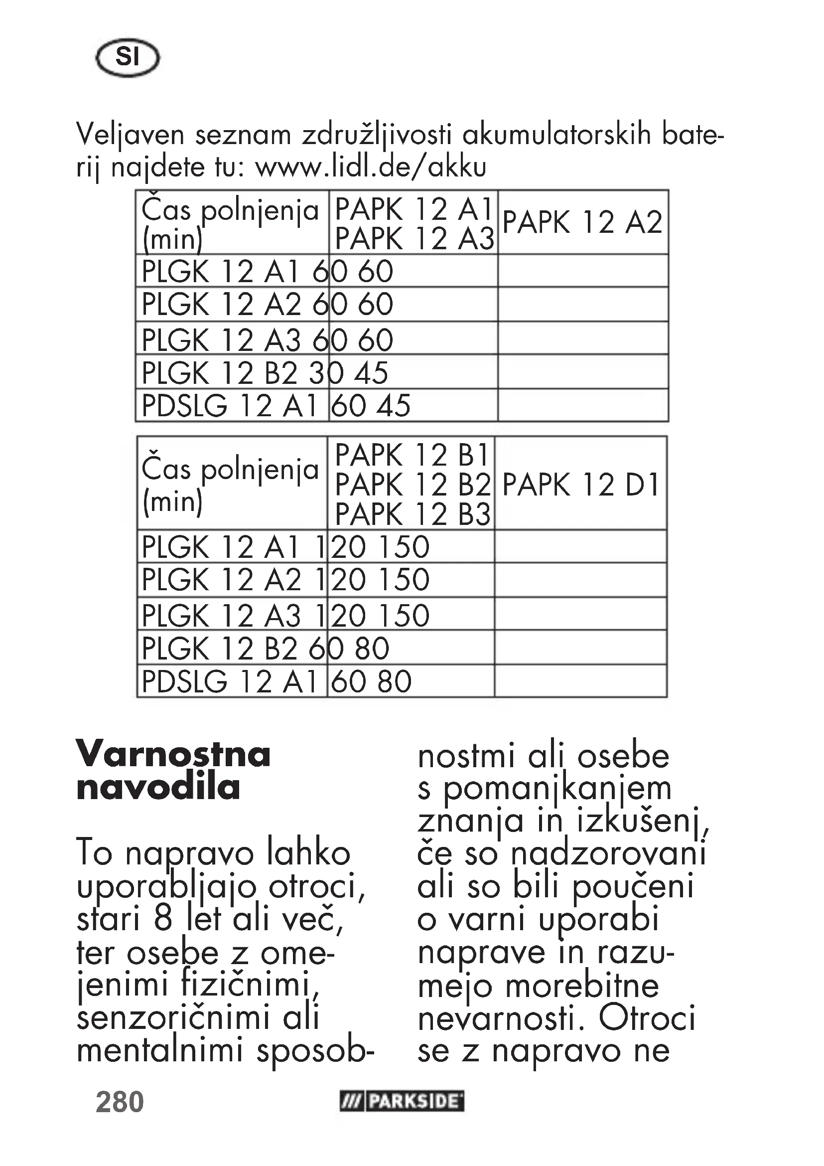 Veljaven seznam združljivosti akumulatorskih bate- rij najdete tu: www.lidl.de/akku Čas polnjenja (min) PAPK12A1 PAPK12A3 PAPK12A2 PLGK12A1 60 60 PLGK12A2 60 60 PLGK12A3 60 60 PLGK12B2 30 45 PDSLG12A1 60 45 Čas polnjenja (min) PAPK12B1 PAPK12B2 PAPK12B3 PAPK12D1 PLGK12A1 120 150 PLGK12A2 120 150 PLGK12A3 120 150 PLGK12B2 60 80 PDSLG12A1 60 80 Varnostna navodila To napravo lahko uporabljajo otroci, stari 8 let ali več, ter osebe z ome- jenimi zičnimi, senzoričnimi ali mentalnimi sposob- nostmi ali osebe s pomanjkanjem znanja in izkušenj, če so nadzorovani ali so bili poučeni o varni uporabi naprave in razu- mejo morebitne nevarnosti. Otroci se z napravo ne281