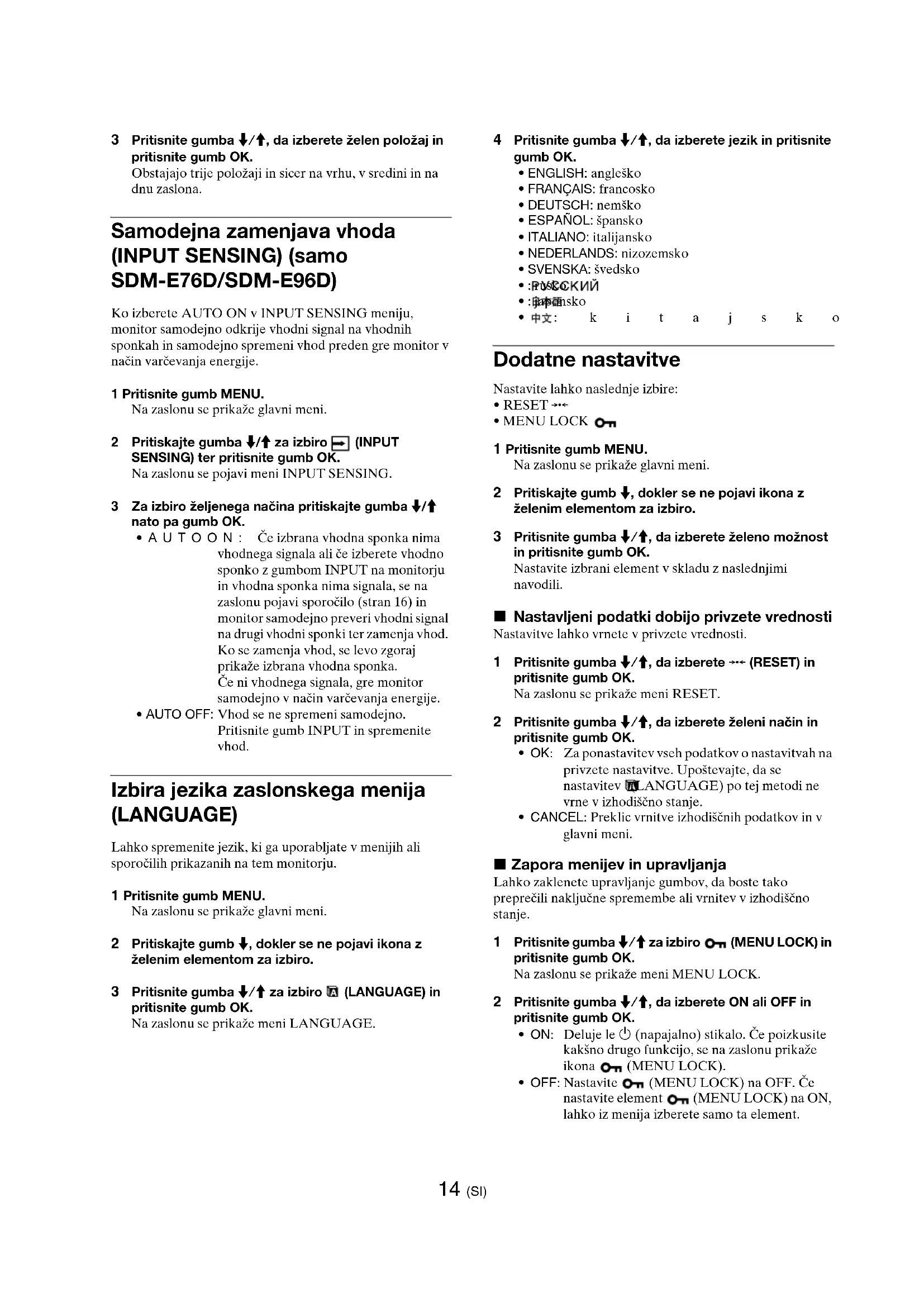 - Če se na zaslonu pojavi OUT OF RANGE: Priključite star monitor. Nato nastavite računalniško grafično kartico v naslednjih območjih. Za nadaljnje informacije o sporočilih na zaslonu, glej »Simptomi težav in njihovo odpravljanje« na strani 17. Ni potrebe po dodatnih gonilnikih Monitor je skladen z »DDC« Plug & Play standardom in samodejno zazna vse informacije o monitorju. Na računalnik ni potrebno namestiti dodatnega gonilnika. Ko boste prvič vključili vaš računalnik, potem ko ste priklopili monitor, se na zaslonu lahko prikaže čarovnik za nastavitev. V tem primeru sledite navodilom na zaslonu. Samodejno se izbere monitor Plug & Play, tako da je možna takojšnja uporaba tega monitorja. Vertikalna frekvenca se nastavi na 60 Hz. Ker migetanje monitorja ni opazno, ga lahko uporabite takšnega kot je. Ni potrebno nastavljati vertikalne frekvence na kakšno posebno visoko vrednost. v AC IN v vtičnico napajalni kabel (priložen) Kabelska vezica (priložen) Ilustracija zadnjega dela monitorja, ki je prikazana na tem mestu, prikazuje SDM-E76D. Isto velja za ostale modele. Analogni RGB Digitalni RGB (samo SDM-E76D/ SDM-E96D) Horizontalna frekvenca 28–80 kHz 28–64 kHz Vertikalna frekvenca 56–75 Hz 60 Hz Resolucija 1280 × 1024 ali manj 1280 × 1024 ali manj8 (SI) Nastavitev naklona Ta zaslon lahko nastavljamo med kotoma, ki sta navedena spodaj. Primite spodnji del LCD zaslona in nato nastavite naklon. Za udobno uporabo zaslona Ta zaslon je oblikovan tako, da lahko nastavite ustrezen kot gledanja. Nastavite kot gledanja vašega zaslona glede na višino mize in stola tako, da se zaslon ne blešči. OpozoriloPri nastavljanju naklona ekrana zagotovite, da prikazovalnika ne spustite ali da vam ne pade z mize. Izbira vhodnega signala (gumb INPUT) (samo SDM-E76D/SDM-E96D) Pritisnite gumb INPUT . Vstopni signal se spremeni vsakič, ko pritisnete ta gumb. Pribl. 5°–25° Sporočilo na zaslonu (se pojavi za okoli 5 s v levem zgornjem kotu.) Konfiguracija vhodnega signala INPUT1 : DVI-D DVI-D vhodni konektor (digitalni RGB) za INPUT1 INPUT2 : HD15 vhodni konektor HD15 (analogni RGB) za INPUT2 OK / INPUT9 (SI) Prilagajanje vašega monitorja Številne nastavitve lahko opravite s pomočjo menijev na zaslonu. Pomikanje po meniju Pritisnite gumb MENU za prikaz glavnega menija na vašem zaslonu. Glej stran 10 za dodatne informacije o uporabi gumba MENU. Uporabite tipki m/M in OK, da izberete ikone v zgornji ilustraciji glavnega menija. Prikaže se naslednji 1~0 meni. Pritiskajte navzdol m, dokler se pokažejo ikone v meniju 9 in 0. Poglejte stran 10 za več informacij o uporabi tipk m/M in OK. Pred prilagajanjem Povežite monitor in računalnik in ju vklopite. Počakajte najmanj 30 minut preden pričnete z nastavljanjem. 1 BACKLIGHT (stran 10) Izberite BACKLIGHT za nastavitev osvetlitve ozadja. 2 CONTRAST 6 (stran 10) Izberite CONTRAST za nastavitev kontrasta slike. 3 BRIGHTNESS 8 (stran 11) Izberite BRIGHTNESS za nastavitev osvetlitve (nivo črne barve). MENU
