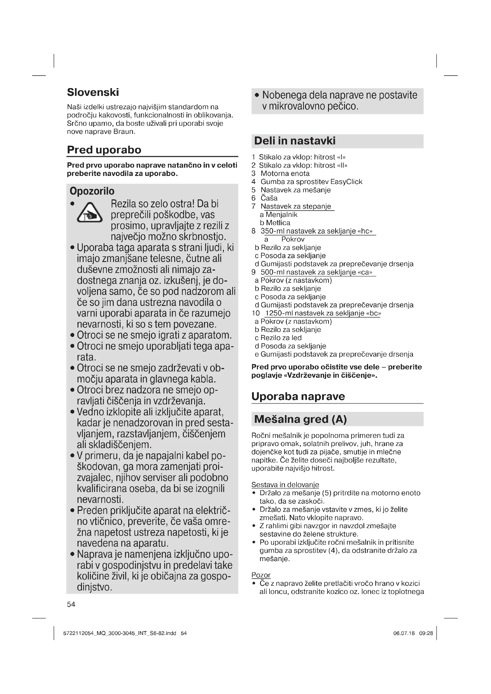 - Nastavkov za sekljanje (8/9/10) z rezili za sekljanje ne uporabljajte za pripravo izjemno trdih živil, kot so neoluščeni oreščki, ledene kocke, kavna zrna, žitarice, ali trde začimbe, npr. muškatni orešček. Če želite pripraviti takšne vrste živil, lahko poškodujete rezila. 5722112054_MQ_3000-3045_INT_S6-82.indd 555722112054_MQ_3000-3045_INT_S6-82.indd 55 06.07.16 09:2806.07.16 09:2856