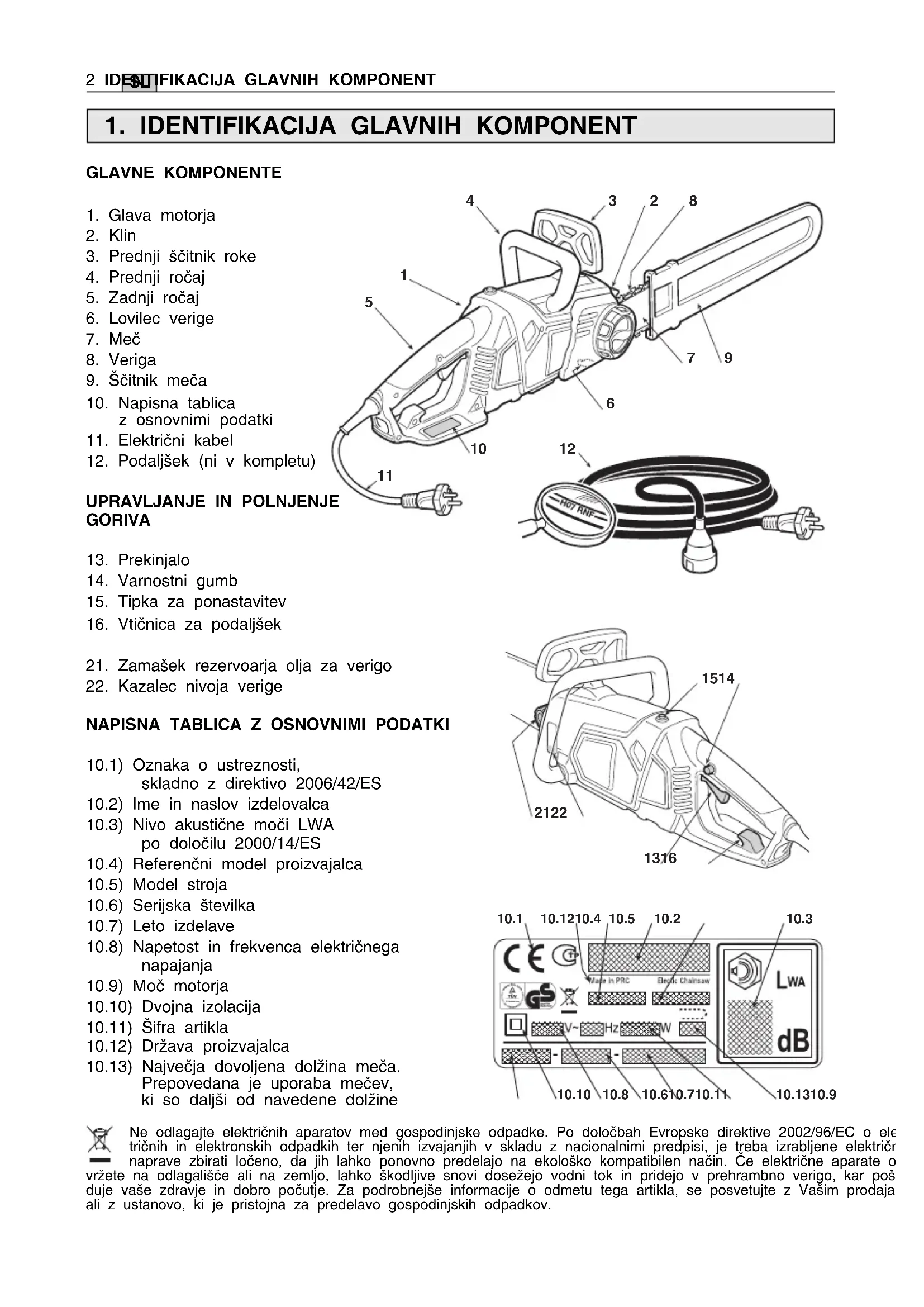 10.1) Oznaka o ustreznosti, skladno z direktivo 2006/42/ES 10.2) Ime in naslov izdelovalca 10.3) Nivo akustične moči LWA po določilu 2000/14/ES 10.4) Referenčni model proizvajalca 10.5) Model stroja 10.6) Serijska številka 10.7) Leto izdelave 10.8) Napetost in frekvenca električnega napajanja 10.9) Moč motorja 10.10) Dvojna izolacija 10.11) Šifra artikla 10.12) Država proizvajalca 10.13) Največja dovoljena dolžina meča. Prepovedana je uporaba mečev, ki so daljši od navedene dolžine Ne odlagajte električnih aparatov med gospodinjske odpadke. Po določbah Evropske direktive 2002/96/EC o elek- tričnih in elektronskih odpadkih ter njenih izvajanjih v skladu z nacionalnimi predpisi, je treba izrabljene električne naprave zbirati ločeno, da jih lahko ponovno predelajo na ekološko kompatibilen način. Če električne aparate od- vržete na odlagališče ali na zemljo, lahko škodljive snovi dosežejo vodni tok in pridejo v prehrambno verigo, kar poško- duje vaše zdravje in dobro počutje. Za podrobnejše informacije o odmetu tega artikla, se posvetujte z Vašim prodajalcem ali z ustanovo, ki je pristojna za predelavo gospodinjskih odpadkov.