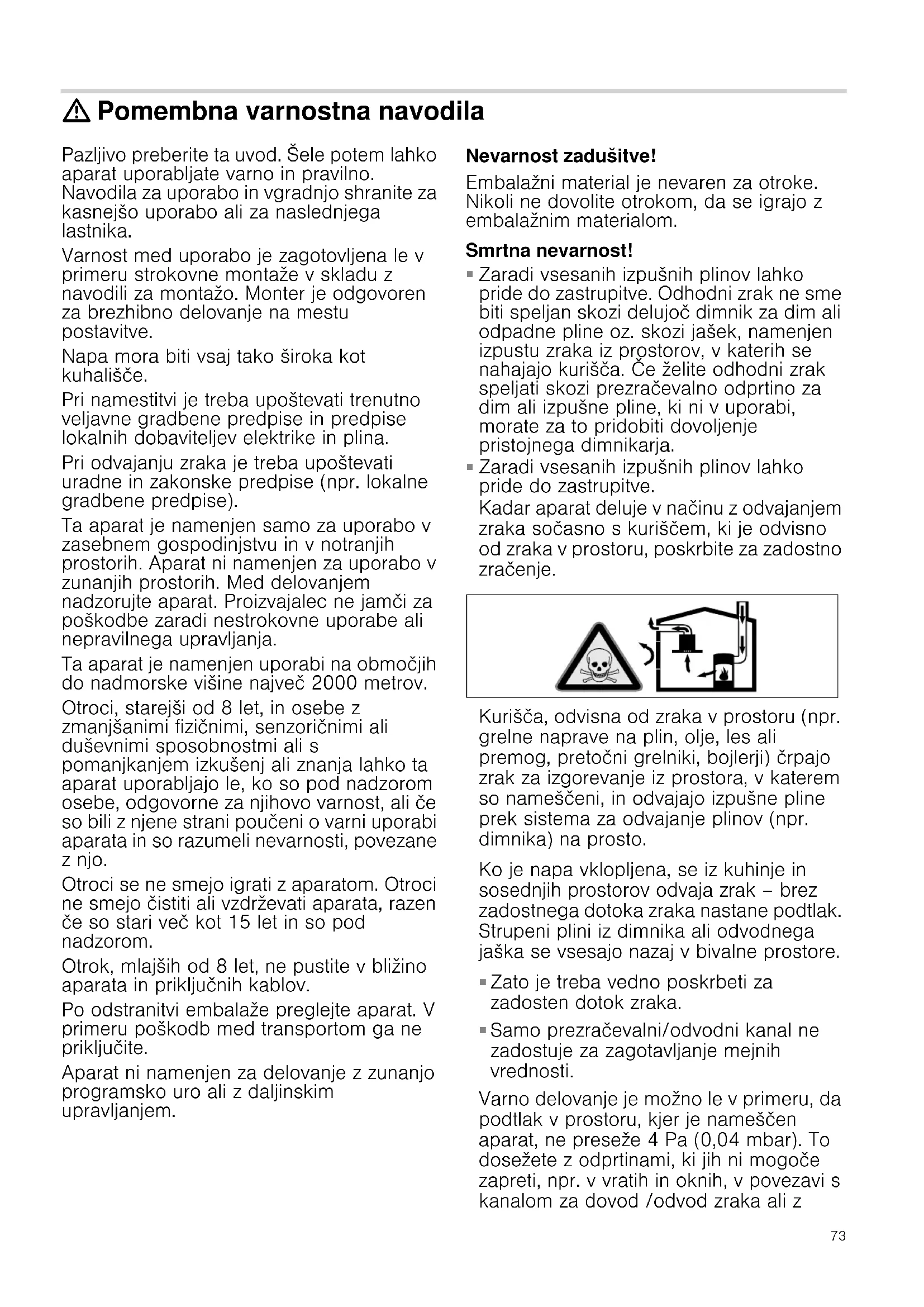 Samo prezračevalni/odvodni kanal ne zadostuje za zagotavljanje mejnih vrednosti. Varno delovanje je možno le v primeru, da podtlak v prostoru, kjer je nameščen aparat, ne preseže 4 Pa (0,04 mbar). To dosežete z odprtinami, ki jih ni mogoče zapreti, npr. v vratih in oknih, v povezavi s kanalom za dovod /odvod zraka ali z74 drugimi tehničnimi ukrepi, ki omogočajo dotok zraka, potrebnega za izgorevanje, v prostor. V vsakem primeru se posvetujte s pristojnim dimnikarjem, ki lahko oceni stanje celotnega prezračevalnega sistema v hiši in vam lahko priporoči ustrezne prezračevalne ukrepe. Če napo uporabljate izključno v načinu delovanja z recirkulacijo zraka, jo lahko uporabljate brez omejitev. Smrtna nevarnost!