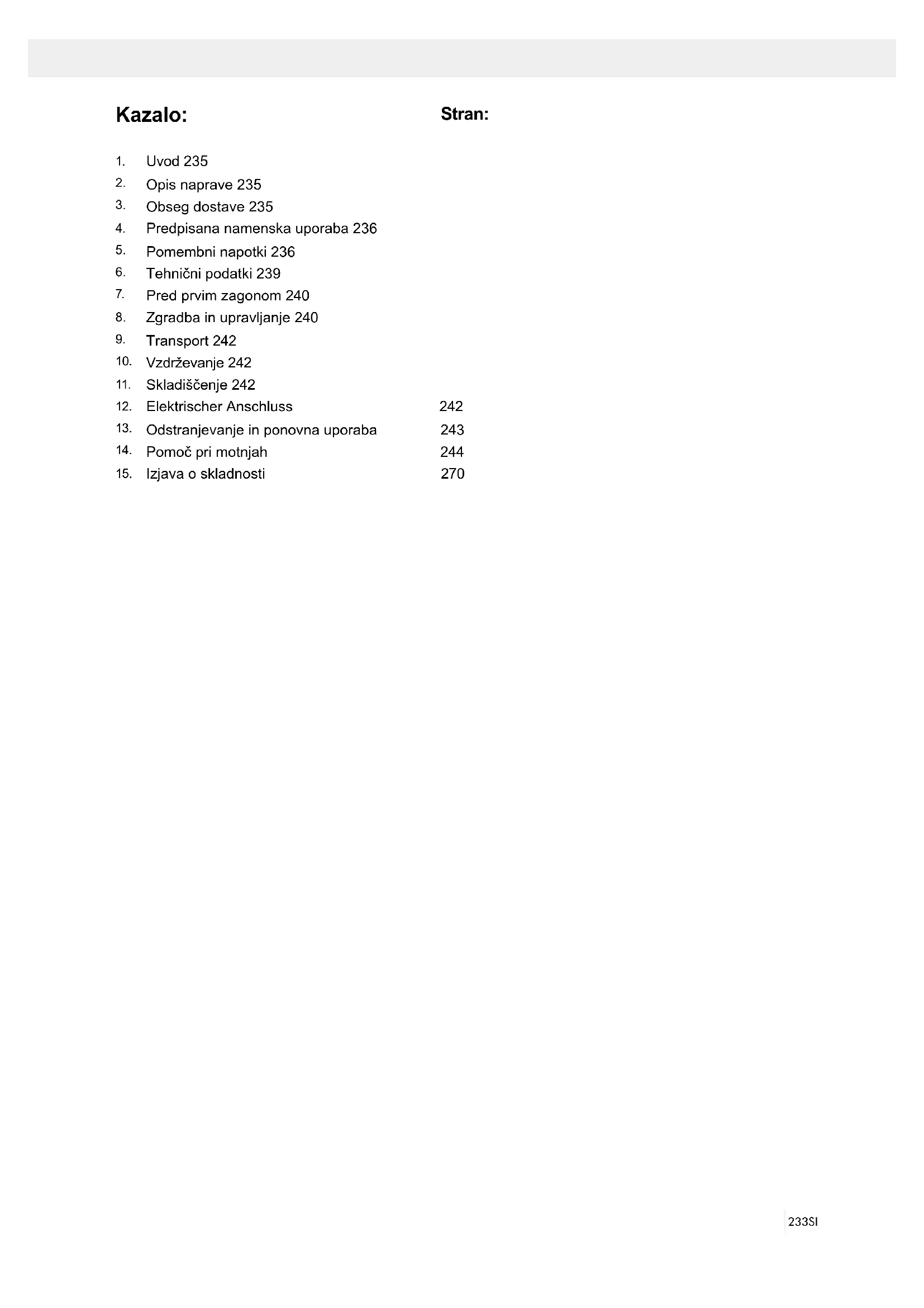 Naprava se nahaja v embalaži, da ne bi prišlo do po- škodb med transportom. Ta embalaža je surovina in s tem ponovno uporabna ali pa jo je možno reciklirati. Na- prava in njen pribor sta izdelana iz različnih materialov kot npr. kovine in plastika. Pokvarjene sestavne dele od- stranite med posebne odpadke. V ta namen povprašajte v tehnični trgovini ali na občinski upravi!244 SI