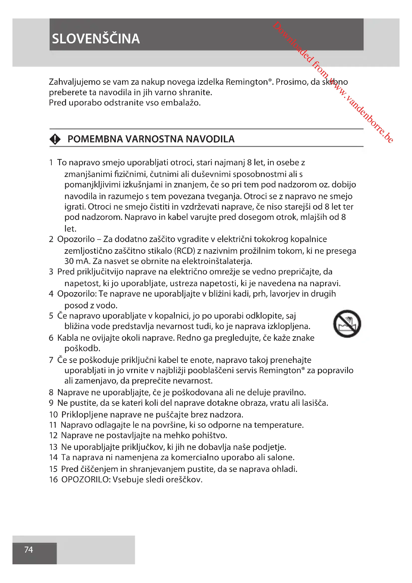 1 To napravo smejo uporabljati otroci, stari najmanj 8 let, in osebe z zmanjšanimi fizičnimi, čutnimi ali duševnimi sposobnostmi ali s pomanjkljivimi izkušnjami in znanjem, če so pri tem pod nadzorom oz. dobijo navodila in razumejo s tem povezana tveganja. Otroci se z napravo ne smejo igrati. Otroci ne smejo čistiti in vzdrževati naprave, če niso starejši od 8 let ter pod nadzorom. Napravo in kabel varujte pred dosegom otrok, mlajših od 8 let. 2 Opozorilo – Za dodatno zaščito vgradite v električni tokokrog kopalnice zemljostično zaščitno stikalo (RCD) z nazivnim prožilnim tokom, ki ne presega 30 mA. Za nasvet se obrnite na elektroinštalaterja. 3 Pred priključitvijo naprave na električno omrežje se vedno prepričajte, da napetost, ki jo uporabljate, ustreza napetosti, ki je navedena na napravi. 4 Opozorilo: Te naprave ne uporabljajte v bližini kadi, prh, lavorjev in drugih posod z vodo. 5 Če napravo uporabljate v kopalnici, jo po uporabi odklopite, saj bližina vode predstavlja nevarnost tudi, ko je naprava izklopljena. 6 Kabla ne ovijajte okoli naprave. Redno ga pregledujte, če kaže znake poškodb. 7 Če se poškoduje priključni kabel te enote, napravo takoj prenehajte uporabljati in jo vrnite v najbližji pooblaščeni servis Remington® za popravilo ali zamenjavo, da preprečite nevarnost. 8 Naprave ne uporabljajte, če je poškodovana ali ne deluje pravilno. 9 Ne pustite, da se kateri koli del naprave dotakne obraza, vratu ali lasišča. 10 Priklopljene naprave ne puščajte brez nadzora. 11 Napravo odlagajte le na površine, ki so odporne na temperature. 12 Naprave ne postavljajte na mehko pohištvo. 13 Ne uporabljajte priključkov, ki jih ne dobavlja naše podjetje. 14 Ta naprava ni namenjena za komercialno uporabo ali salone. 15 Pred čiščenjem in shranjevanjem pustite, da se naprava ohladi. 16 OPOZORILO: Vsebuje sledi oreščkov. Downloaded from www.vandenborre.be75 SLOVENŠČINA GBDNLFEIDKSFINPSKCZ HUN PLRUTRROGRSIBG HRUAAE