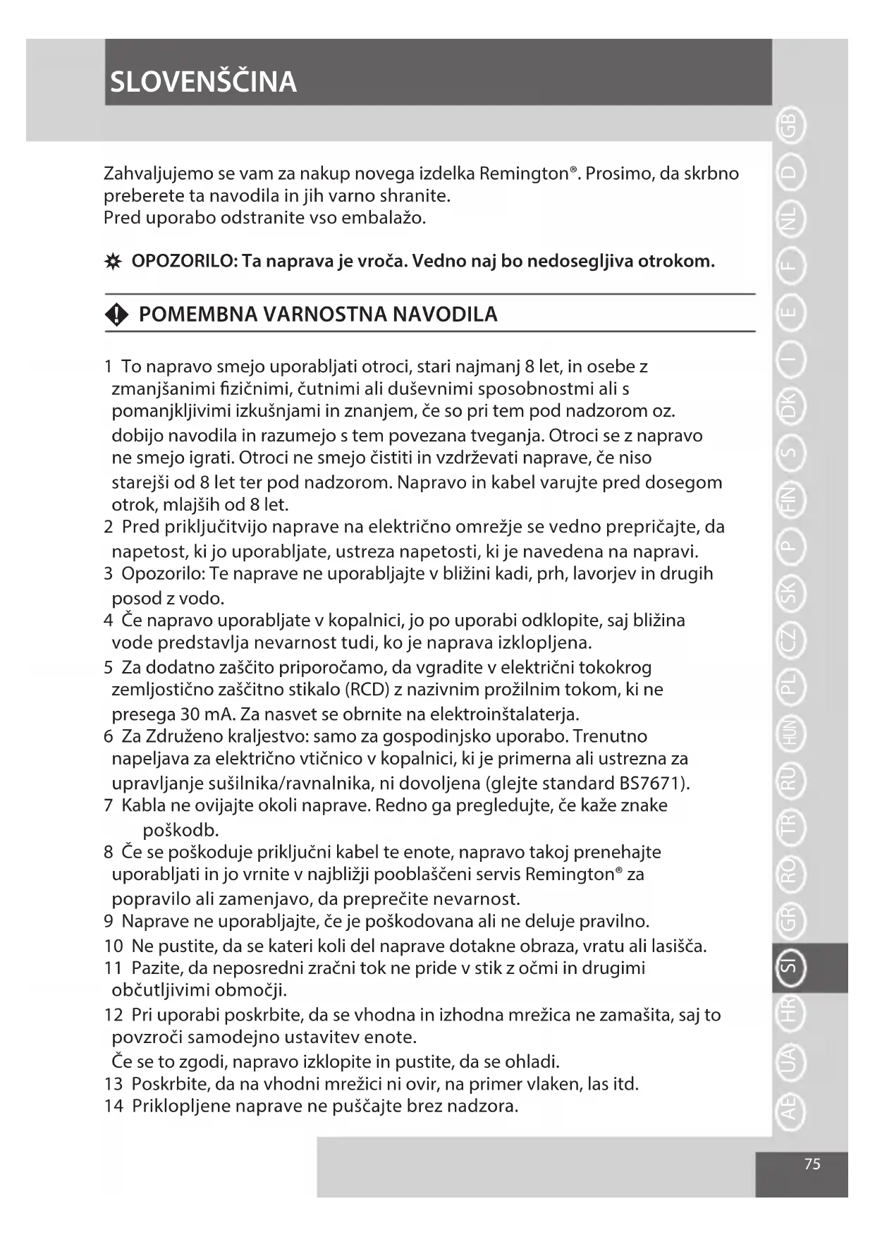 1 To napravo smejo uporabljati otroci, stari najmanj 8 let, in osebe z zmanjšanimi zičnimi, čutnimi ali duševnimi sposobnostmi ali s pomanjkljivimi izkušnjami in znanjem, če so pri tem pod nadzorom oz. dobijo navodila in razumejo s tem povezana tveganja. Otroci se z napravo ne smejo igrati. Otroci ne smejo čistiti in vzdrževati naprave, če niso starejši od 8 let ter pod nadzorom. Napravo in kabel varujte pred dosegom otrok, mlajših od 8 let. 2 Pred priključitvijo naprave na električno omrežje se vedno prepričajte, da napetost, ki jo uporabljate, ustreza napetosti, ki je navedena na napravi. 3 Opozorilo: Te naprave ne uporabljajte v bližini kadi, prh, lavorjev in drugih posod z vodo. 4 Če napravo uporabljate v kopalnici, jo po uporabi odklopite, saj bližina vode predstavlja nevarnost tudi, ko je naprava izklopljena. 5 Za dodatno zaščito priporočamo, da vgradite v električni tokokrog zemljostično zaščitno stikalo (RCD) z nazivnim prožilnim tokom, ki ne presega 30 mA. Za nasvet se obrnite na elektroinštalaterja. 6 Za Združeno kraljestvo: samo za gospodinjsko uporabo. Trenutno napeljava za električno vtičnico v kopalnici, ki je primerna ali ustrezna za upravljanje sušilnika/ravnalnika, ni dovoljena (glejte standard BS7671). 7 Kabla ne ovijajte okoli naprave. Redno ga pregledujte, če kaže znake poškodb. 8 Če se poškoduje priključni kabel te enote, napravo takoj prenehajte uporabljati in jo vrnite v najbližji pooblaščeni servis Remington® za popravilo ali zamenjavo, da preprečite nevarnost. 9 Naprave ne uporabljajte, če je poškodovana ali ne deluje pravilno. 10 Ne pustite, da se kateri koli del naprave dotakne obraza, vratu ali lasišča. 11 Pazite, da neposredni zračni tok ne pride v stik z očmi in drugimi občutljivimi območji. 12 Pri uporabi poskrbite, da se vhodna in izhodna mrežica ne zamašita, saj to povzroči samodejno ustavitev enote. Če se to zgodi, napravo izklopite in pustite, da se ohladi. 13 Poskrbite, da na vhodni mrežici ni ovir, na primer vlaken, las itd. 14 Priklopljene naprave ne puščajte brez nadzora. SLOVENŠČINA GBDNLFEIDKSFINPSKCZ HUN PLRUTRROGRSI AE HR UA76 15 Vključene naprave ne odlagajte. 16 Naprave ne postavljajte na mehko pohištvo. 17 Ne uporabljajte priključkov, ki jih ne dobavlja naše podjetje. 18 Ta naprava ni namenjena za komercialno uporabo ali salone. 19 Pred čiščenjem in shranjevanjem pustite, da se naprava ohladi.