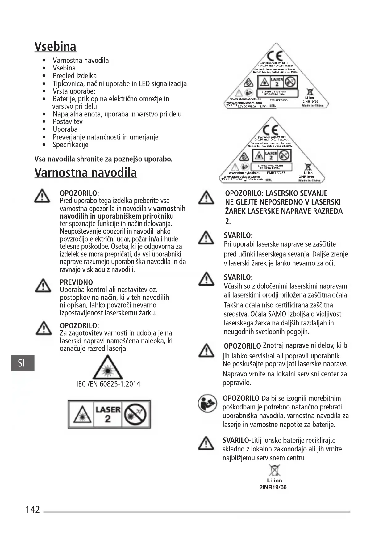 - Laserske naprave ni mogoče servisirati in jo je treba vprimeru okvare ali poškodbe vrniti pooblaščenemu trgovcu Stanley/servisnem centru. Vprimeru okvare, lahko napravo popravi le pooblaščeni serviser, ki bo uporabil originalne rezervne dele. To je zagotovilo, da se ohrani pravilno delovanje in varnost naprave.145