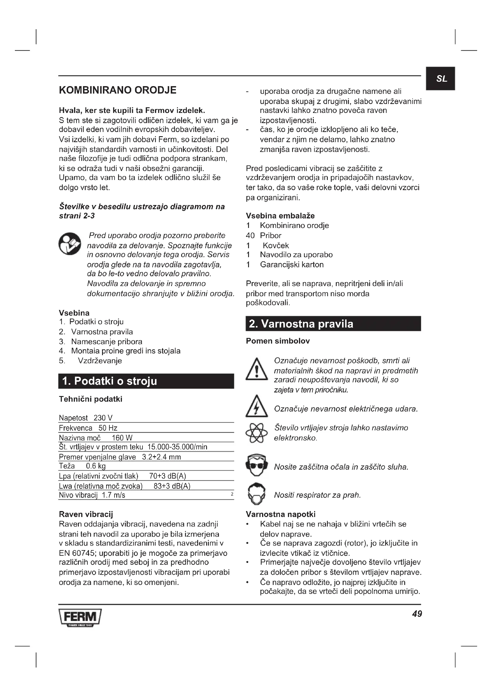 KOMBINIRANO ORODJE Hvala, ker ste kupili ta Fermov izdelek. Stemstesizagotoviliodličenizdelek,kivamgaje dobavil eden vodilnih evropskih dobaviteljev. Vsi izdelki, ki vam jih dobavi Ferm, so izdelani po najvišjihstandardihvarnostiinučinkovitosti.Del našefilozofijejetudiodličnapodporastrankam, kiseodražatudivnašiobsežnigaranciji. Upamo,davambotaizdelekodličnoslužilše dolgo vrsto let. Številke v besedilu ustrezajo diagramom na strani 2-3 Pred uporabo orodja pozorno preberite navodila za delovanje. Spoznajte funkcije in osnovno delovanje tega orodja. Servis orodja glede na ta navodila zagotavlja, da bo le-to vedno delovalo pravilno. Navodila za delovanje in spremno dokumentacijoshranjujtevbližiniorodja. Vsebina