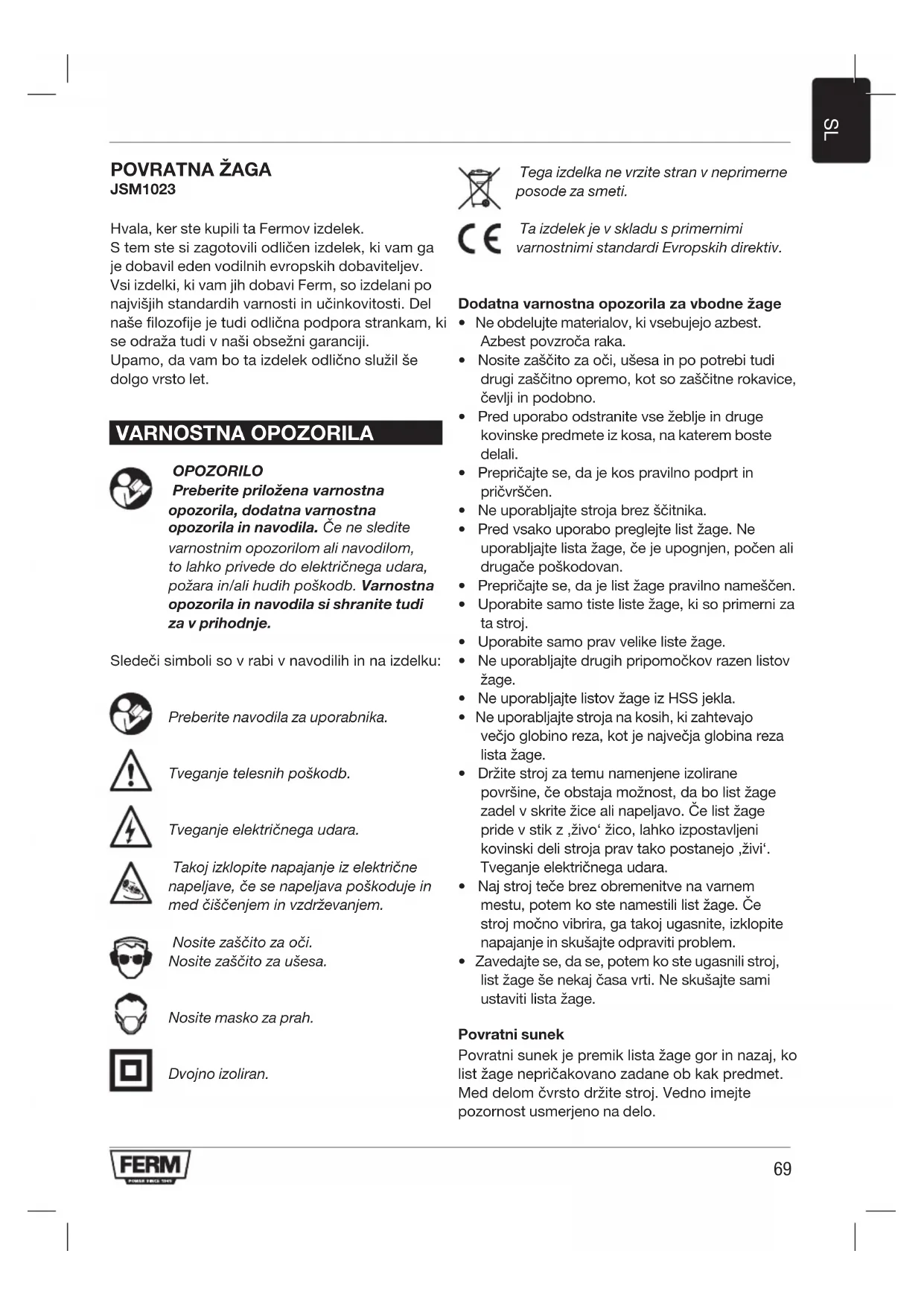 POVRATNA ŽAGA JSM1023 Hvala, ker ste kupili ta Fermov izdelek. S tem ste si zagotovili odličen izdelek, ki vam ga je dobavil eden vodilnih evropskih dobaviteljev. Vsi izdelki, ki vam jih dobavi Ferm, so izdelani po najvišjih standardih varnosti in učinkovitosti. Del naše filozofije je tudi odlična podpora strankam, ki se odraža tudi v naši obsežni garanciji. Upamo, da vam bo ta izdelek odlično služil še dolgo vrsto let. VARNOSTNA OPOZORILA OPOZORILO Preberite priložena varnostna opozorila, dodatna varnostna opozorila in navodila. Čenesledite varnostnim opozorilom ali navodilom, tolahkoprivededoelektričnegaudara, požarain/alihudihpoškodb.Varnostna opozorila in navodila si shranite tudi za v prihodnje. Sledeči simboli so v rabi v navodilih in na izdelku: Preberite navodila za uporabnika. Tveganjetelesnihpoškodb. Tveganjeelektričnegaudara. Takojizklopitenapajanjeizelektrične napeljave,česenapeljavapoškodujein medčiščenjeminvzdrževanjem. Nositezaščitozaoči. Nositezaščitozaušesa. Nosite masko za prah. Dvojno izoliran. Tega izdelka ne vrzite stran v neprimerne posode za smeti. Ta izdelek je v skladu s primernimi varnostnimi standardi Evropskih direktiv. Dodatna varnostna opozorila za vbodne žage