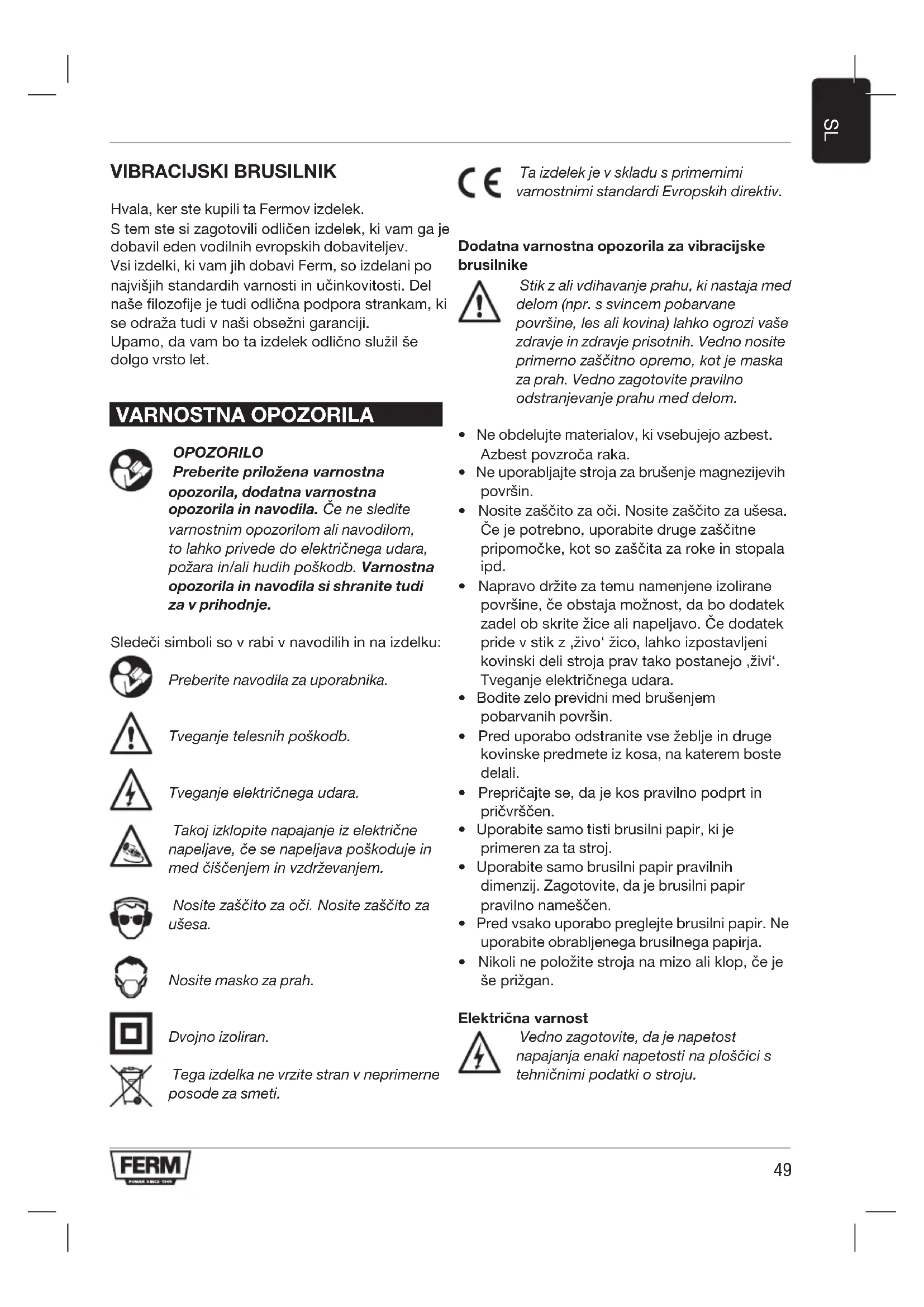 VIBRACIJSKI BRUSILNIK Hvala, ker ste kupili ta Fermov izdelek. S tem ste si zagotovili odličen izdelek, ki vam ga je dobavil eden vodilnih evropskih dobaviteljev. Vsi izdelki, ki vam jih dobavi Ferm, so izdelani po najvišjih standardih varnosti in učinkovitosti. Del naše filozofije je tudi odlična podpora strankam, ki se odraža tudi v naši obsežni garanciji. Upamo, da vam bo ta izdelek odlično služil še dolgo vrsto let. VARNOSTNA OPOZORILA OPOZORILO Preberite priložena varnostna opozorila, dodatna varnostna opozorila in navodila. Čenesledite varnostnim opozorilom ali navodilom, tolahkoprivededoelektričnegaudara, požarain/alihudihpoškodb.Varnostna opozorila in navodila si shranite tudi za v prihodnje. Sledeči simboli so v rabi v navodilih in na izdelku: Preberite navodila za uporabnika. Tveganjetelesnihpoškodb. Tveganjeelektričnegaudara. Takojizklopitenapajanjeizelektrične napeljave,česenapeljavapoškodujein medčiščenjeminvzdrževanjem. Nositezaščitozaoči.Nositezaščitoza ušesa. Nosite masko za prah. Dvojno izoliran. Tega izdelka ne vrzite stran v neprimerne posode za smeti. Ta izdelek je v skladu s primernimi varnostnimi standardi Evropskih direktiv. Dodatna varnostna opozorila za vibracijske brusilnike Stik z ali vdihavanje prahu, ki nastaja med delom (npr. s svincem pobarvane površine,lesalikovina)lahkoogrozivaše zdravje in zdravje prisotnih. Vedno nosite primernozaščitnoopremo,kotjemaska za prah. Vedno zagotovite pravilno odstranjevanje prahu med delom.