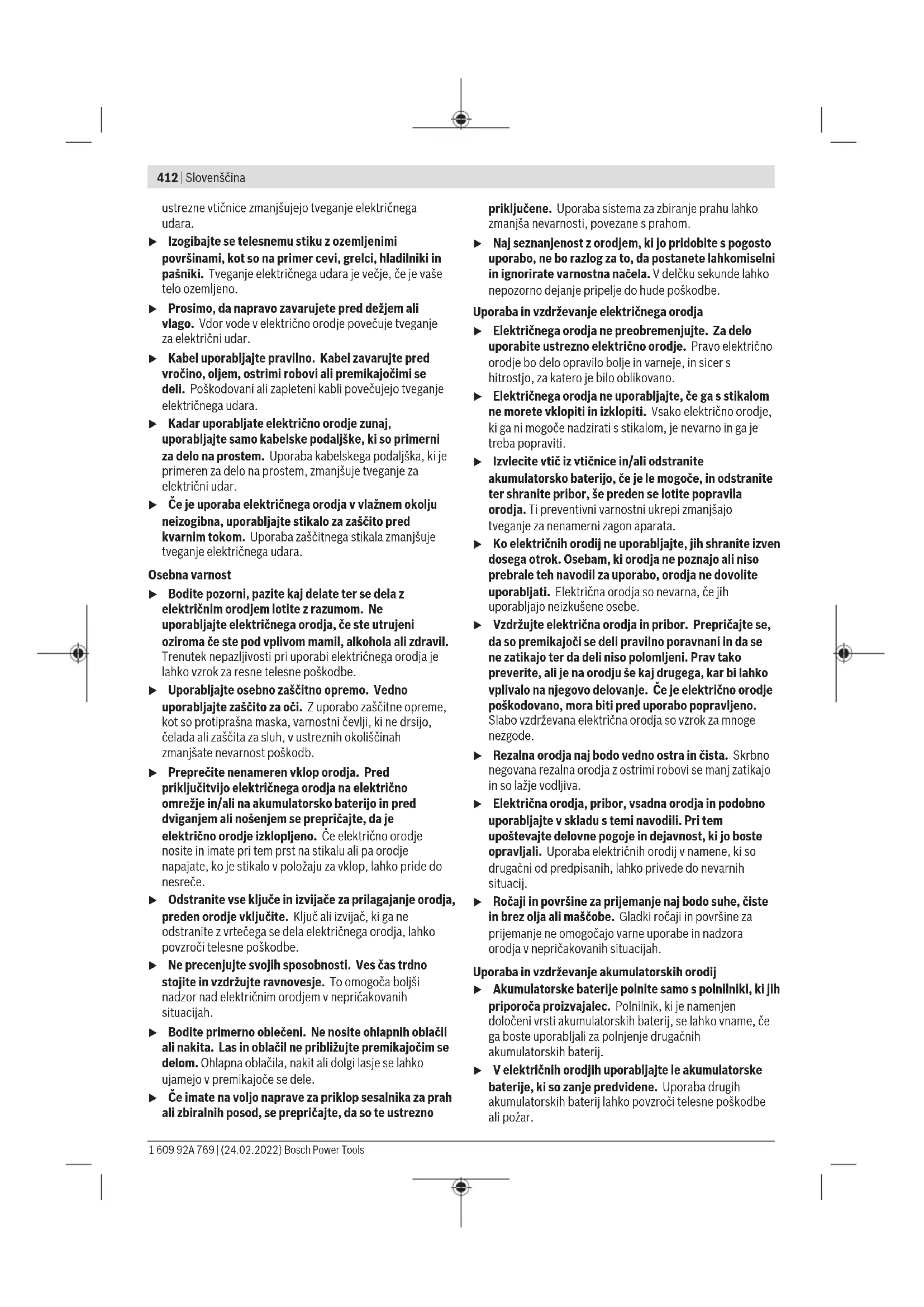 Low Energy Module GCY42 vmesnik za brezžično povezavo. Upoštevajte lokalne omejitve uporabe, npr. v letalih ali v bolnišnicah. u V območjih, na katerih tehnologije Bluetooth® ne smete uporabljati, je treba modul Bluetooth® Low EnergyGCY42 in gumbno baterijo odstraniti. Če se električno orodje naelektri s statično elektriko, vgrajena elektronika električnega orodja poskrbi za samodejni izklop. Za vklop električnega orodja morate ponovno pritisniti stikalo za vklop/izklop (6). Navodila za delo Rezalne plošče u Pri brušenju s kompozitnimi brusilnimi sredstvi uporabite vedno zaščitni pokrov za brušenje(15). u Za kosmačenje nikoli ne uporabljajte rezalnih plošč. u Pri brušenju lahko zaščitni pokrov za rezanje(16) ali zaščitni pokrov za brušenje(15) z nameščenim pokrovom za rezanje(17) trči ob obdelovanec in povzroči izgubo nadzora. Pri grobem brušenju dosežete najboljši rezultat, ko orodje postavite pod kotom od 30° do 40°. Srednje močno pritiskajte na električno orodje ter ga premikajte sem ter tja. S tem se obdelovanec ne segreje, ne spremeni barve in ne pride do nastanka brazd. u Pri uporabi kompozitnih plošč, ki so dovoljene tako za rezanje kot za brušenje, je treba uporabiti zaščitni pokrov za rezanje(16) oz. zaščitni pokrov za brušenje(15) z nameščenim pokrovom za rezanje(17). Površinsko brušenje z lamelnimi brusilnimi ploščami u Pri brušenju z lamelno brusilno ploščo vedno uporabljajte zaščitni pokrov za brušenje(15). Z lamelno brusilno ploščo (pribor) lahko obdelujete tudi zaobljene površine in profile. Lamelne brusilne plošče imajo v primerjavi z običajnimi brusilnimi ploščami bistveno daljšo življenjsko dobo, nižjo raven hrupa in nižje temperature brušenja. Površinsko brušenje z brusilnim krožnikom u Za delo z gumijastim brusilnim krožnikom (30) je treba vedno namestiti zaščito za roke (28). Brušenje z brusilnim krožnikom lahko izvajate brez zaščitnega pokrova. Vrstni red pri montaži je prikazan na strani z grafičnim prikazom. Privijte okroglo matico(32) in jo zategnite s ključem za dve luknji. Lončasta ščetka/kolutna ščetka/stožčasta ščetka u Pri ščetkanju s kolutnimi ščetkami uporabite vedno zaščitni pokrov za brušenje(15). Ščetkanje z lončastimi ščetkami/stožčastimi ščetkami se lahko izvede brez zaščitnega pokrova. u Za delo z lončasto ščetko ali stožčasto ščetko je treba vedno namestiti zaščito za roke(28). u Žične krtače se lahko ujamejo za zaščitni pokrov in prelomijo, če se največja dovoljena velikost kolutne ščetke prekorači. Vrstni red pri montaži je prikazan na strani z grafičnim prikazom. Lončasto ščetko/stožčasto ščetko/kolutno ščetko z navojem M10/M14 je treba priviti tako globoko na brusilno vreteno, da bo prirobnica brusilnega vretena na koncu navoja brusilnega vretena nameščena tesno ob nastavku. Zategnite lončasto ščetko/kolutno ščetko/stožčasto ščetko z viličastim ključem. Za pritrditev kolutne ščetke s premerom 16mm (M10) ali 22,22mm (M14) namestite prijemalno prirobnico s tesnilnim obročkom(18) na brusilno vreteno(27), privijte okroglo matico(32) in jo zategnite s ključem za dve luknji. 1 609 92A 769 | (24.02.2022) Bosch Power ToolsSlovenščina | 425 Rezanje kovine u Za rezanje kovine s kompozitnimi rezalnimi ploščami ali diamantnimi rezalnimi ploščami uporabite zaščitni pokrov za rezanje(16) oz. zaščitni pokrov za brušenje(15) z nameščenim pokrovom za rezanje(17). u Pri uporabi zaščitnega pokrova za brušenje(15) za kosmačenje s kompozitnimi rezalnimi ploščami obstaja povečano tveganje izpostavljenosti iskram in delcem ter delcem plošče ob odlomu. Pri rezanju orodje srednje močno potiskajte in silo prilagajajte obdelovancu. Na rezalno ploščo ne pritiskajte premočno, se ne zatikajte z njo in ne oscilirajte. Rezalne plošče, ki se ne vrti enakomerno, ne skušajte izravnati s pritiskanjem na drugo stran. Električno orodje je treba ves čas voditi proti smeri delovanja. Sicer obstaja nevarnost, da ga nenadzorovano potisnete iz reza. Pri rezanju profilov in štirirobih cevi je najbolje, da začnete z rezanjem na mestu z najmanjšim premerom. Rezanje kamna u Pri rezanju kamna s kompozitnimi rezalnimi ploščami ali diamantnimi rezalnimi ploščami za kamen/beton uporabite vedno odsesovalni pokrov za rezanje z vodili(29) ali zaščitni pokrov za rezanje(16) ali zaščitni pokrov za brušenje (15) z nameščenim pokrovom za rezanje(17). u Pri rezanju kamna morate poskrbeti za zadostno odsesavanje prahu. u Nosite zaščitno masko proti prahu. u Električno orodje je dovoljeno uporabljati zgolj za suho rezanje/suho brušenje. u Pri uporabi zaščitnega pokrova za rezanje(16), zaščitnega pokrova za brušenje(15) ali zaščitnega pokrova za brušenje(15) z nameščenim pokrovom za rezanje(17) za rezanje in brušenje betona ali zidu obstaja povečana obremenitev s prahu ter povečano tveganje za izgubo nadzora nad električnim orodjem, kar lahko vodi do povratnega udarca. Pri rezanju kamna morate vedno uporabiti diamantno rezalno ploščo. Pri uporabi pokrova za odsesavanje za rezanje z vodili(29) mora biti sesalnik primeren za odsesavanje kamenega prahu. Bosch ponuja ustrezne sesalnike. Vklopite električno orodje in ga s sprednjim delom vodila namestite na obdelovanec. Potiskanje električnega orodja prilagodite obdelovancu. Pri rezanju posebej trdih obdelovancev, npr. betona z visoko vsebnostjo proda, se lahko diamantna rezalna plošča pregreje in tako poškoduje. Jasen znak za to je močno iskrenje, ki spremlja rezanje z diamantno rezalno ploščo. V tem primeru rezanje prekinite in pustite, da diamantna rezalna plošča nekaj časa deluje v prostem teku z najvišjim številom vrtljajev, da se ohladi. Občutno počasnejše rezanje ali izrazitejše iskrenje sta znak, da je diamantna rezalna plošča otopela. Ploščo v takšnem primeru naostrite s kratkimi rezi v abrazivne materiale, kot 