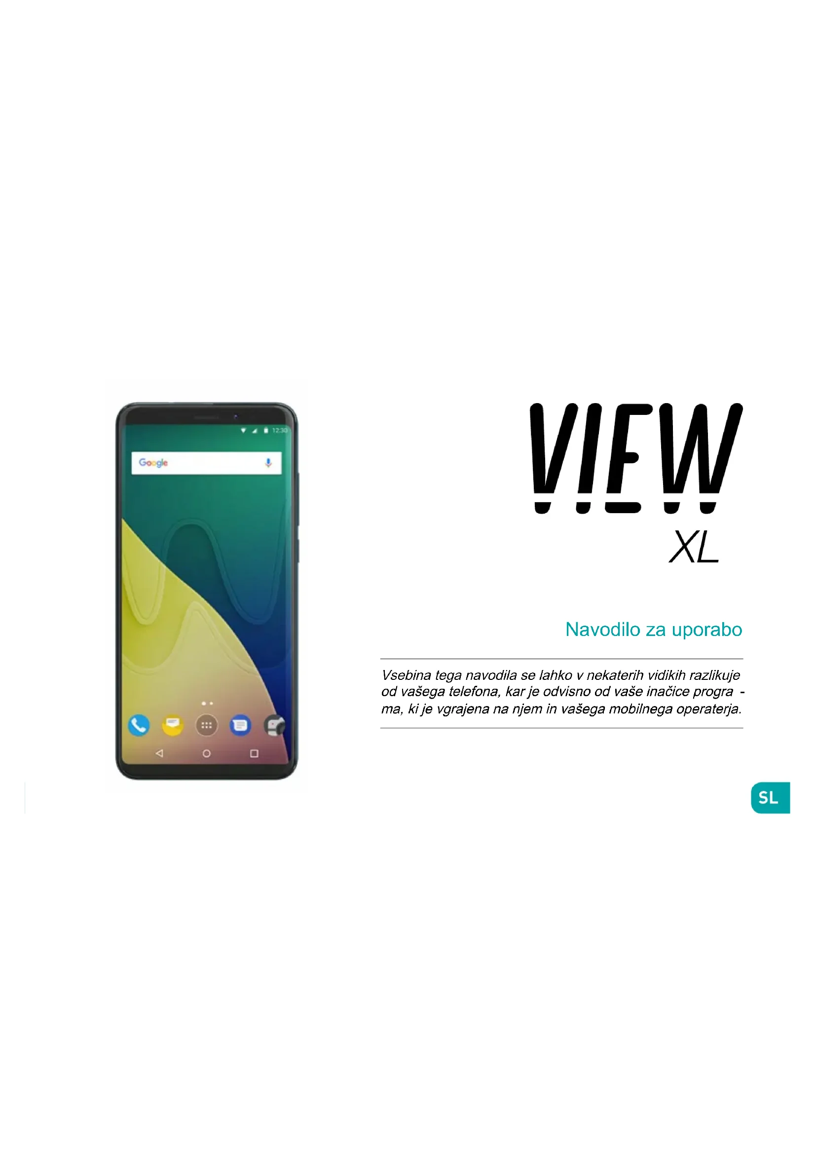 ma, ki je vgrajena na njem in vašega mobilnega operaterja. Navodilo za uporaboČESTITAMO! Pravkar ste kupili WIKO VIEW XL mobilni telefon. Ta vodič za uporabnike vsebuje vse potrebne informaci- je za uporabo telefona, da se boste, upajmo, lahko zelo hitro seznanili s svetom WIKO mobilnih naprav. Polna verzija, varnostnih navodil in navodil za upora- bo vaše naprave so dostopne na naši spletni strani: www.wikomobile.com. Lahko jih zahtevate tudi pisno preko naslova navedenega na koncu teh navodil. Copyright © 2017 WIKO Informacije, ki jih vsebuje to uporabniško navodilo je prepovedano razkrivati tretjim osebam in jih razmnože- vati v katerikoli obliki, če družba WIKO k temu ni dala svojega pisnega soglasja. Zaščitni znaki WIKO je registrirani zaščitni znak družbe WIKO SAS. Odrekanje odgovornosti To navodilo je sestavljeno zelo marljivo in pozorno in je namenjeno, da ga boste rabili kot vodič skozi funkcije in lastnosti vaše naprave. Vendar pa informacij in pri- poročil iz tega navodila ne gre razlagati kot jamstva v skladu z uporabnim zakonom. WIKO zadržuje pravico, da v katerem koli trenutku spremeni informacije, ki jih vsebuje to navodilo. Omejitev odgovornosti Vsa vsebina in servisi, ki so vam dosegljivi s to napra- vo, so ekskluzivna last tretjih oseb in so zavarovani z ustreznimi predpisi )zakoni o avtorskih pravicah, patent- nimi pravicami, licencami in/ali drugimi pravicami intel- ektualne lastnine(. Ti servisi so namenjeni izključno za osebno nekomercialno uporabo. Prepovedano je upo- rabljati katero koli vsebino ali servis, ne da bi se poprej pridobilo pisno dovoljenje lastnika te vsebine. Prepove- dano je kopirati, objavljati, posredovati, prodajati vsebi- no ali servise kot tudi ustvarjati izpeljanke vsebinskih delov ali servisov, ki so dosegljivi po tej napravi in te izkoriščati na kateri koli način ali s katerimi koli sredstvi. VSEBINA IN SERVISI, KI JIH IZVAJAJO TRETJE OSEBE SO DANI „V VIDENEM STANJU“. WIKO NE DAJE JAMSTVA, BODISI IZRECNO BODISI MOLČE, GLEDE TAKE VSEBINE ALI SERVISA ZA KATERIKOLI NAMEN. WIKO IZRECNO ODREKA ODGOV- ORNOST GLEDE DAJANJA JAMSTEV ZA IZTRŽENJE IZDELKA ALI NJEGOVO PRIMERNOST ZA DOLOČEN NAMEN. WIKO NE DAJE JAMSTVA ZA TOČNOST,