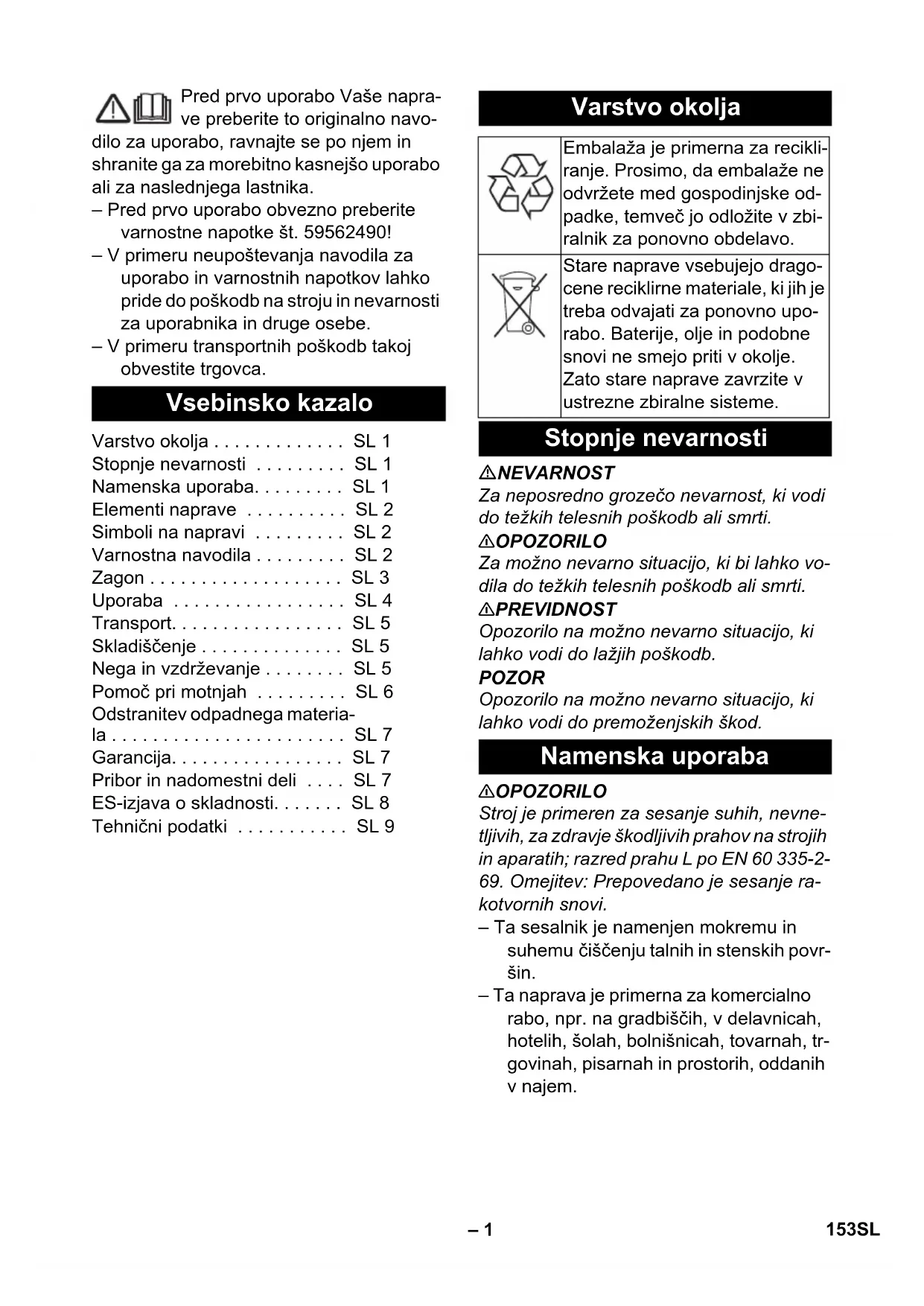 kotvornih snovi. – Ta sesalnik je namenjen mokremu in suhemu čiščenju talnih in stenskih povr- šin. – Ta naprava je primerna za komercialno rabo, npr. na gradbiščih, v delavnicah, hotelih, šolah, bolnišnicah, tovarnah, tr- govinah, pisarnah in prostorih, oddanih v najem. Vsebinsko kazalo Varstvo okolja . . . . . . . . . . . . . SL 1 Stopnje nevarnosti . . . . . . . . . SL 1 Namenska uporaba. . . . . . . . . SL 1 Elementi naprave . . . . . . . . . . SL 2 Simboli na napravi . . . . . . . . . SL 2 Varnostna navodila . . . . . . . . . SL 2 Zagon . . . . . . . . . . . . . . . . . . . SL 3 Uporaba . . . . . . . . . . . . . . . . . SL 4 Transport. . . . . . . . . . . . . . . . . SL 5 Skladiščenje . . . . . . . . . . . . . . SL 5 Nega in vzdrževanje . . . . . . . . SL 5 Pomoč pri motnjah . . . . . . . . . SL 6 Odstranitev odpadnega materia- la . . . . . . . . . . . . . . . . . . . . . . . SL 7 Garancija. . . . . . . . . . . . . . . . . SL 7 Pribor in nadomestni deli . . . . SL 7 ES-izjava o skladnosti. . . . . . . SL 8 Tehnični podatki . . . . . . . . . . . SL 9 Varstvo okolja Embalaža je primerna za recikli- ranje. Prosimo, da embalaže ne odvržete med gospodinjske od- padke, temveč jo odložite v zbi- ralnik za ponovno obdelavo. Stare naprave vsebujejo drago- cene reciklirne materiale, ki jih je treba odvajati za ponovno upo- rabo. Baterije, olje in podobne snovi ne smejo priti v okolje. Zato stare naprave zavrzite v ustrezne zbiralne sisteme. Stopnje nevarnosti Namenska uporaba 153SL– 2 1 Elektrode 2 Gibka sesalna cev 3 Kljuka za kabel 4 Izstop zraka, delovni zrak 5 Blokiranje sesalne glave 6 Univerzalni adapter 7 Vstop zraka, hladilni zrak motorja 8 Zbiralnik umazanije 9 Sesalna glava 10 Vrtljiva kolesca 11 Sesalni nastavek 12 Talna šoba (ni del dobavnega obsega) 13 Sesalna cev (ni del dobavnega obsega) 14 Nosilni ročaj 15 Pokrov filtra 16 Koleno (ni del dobavnega obsega) 17 Regulator sesalne moči (brezstopenj- ski) 18 Vrtljivi regulator za moč sesanja (min- max) 19 Kontrolna lučka 20 Vtičnica 21 Avtomatsko čiščenje filtra 22 Glavno stikalo 23 Ploščato naguban filter 24 Čiščenje filtra 25 Nosilec za talno šobo 26 Držalo za šobo za čiščenje fug 27 Držalo za sesalne cevi 28 Omrežni kabel 29 Tipska tablica 몇 OPOZORILO – Če se odvajan zrak vrača v prostor, mora v prostoru obstajajti zadostna sto- pnja izmenjave zraka L. Za ohranjanje zahtevanih mejnih vrednosti sme vrnje- ni volumski tok znašati največ 50% vo- lumskega toka svežega zraka (prostor- ni volumen V