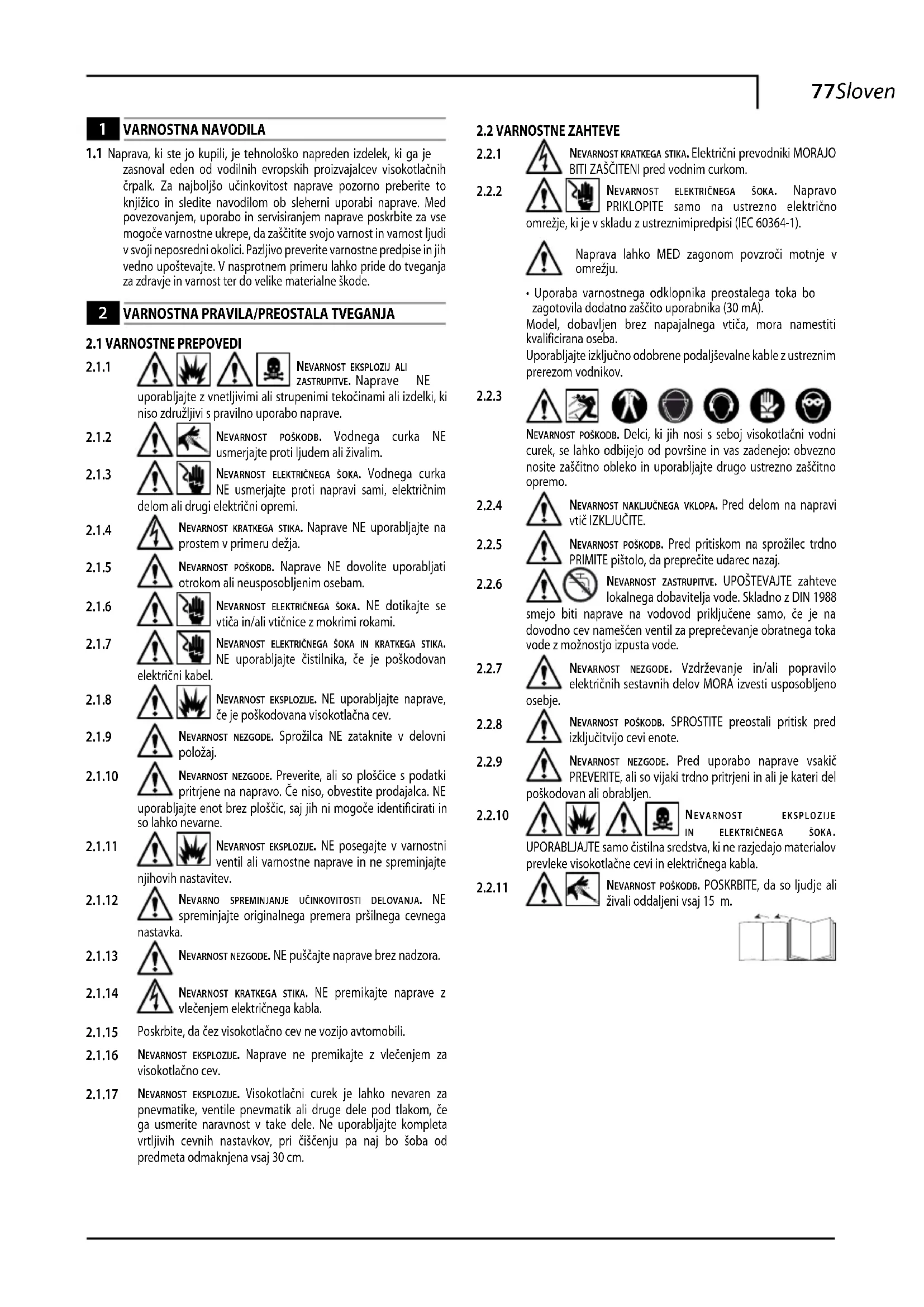 zasnoval eden od vodilnih evropskih proizvajalcev visokotlačnih črpalk. Za najboljšo učinkovitost naprave pozorno preberite to knjižico in sledite navodilom ob sleherni uporabi naprave. Med povezovanjem, uporabo in servisiranjem naprave poskrbite za vse mogoče varnostne ukrepe, da zaščitite svojo varnost in varnost ljudi v svoji neposredni okolici. Pazljivo preverite varnostne predpise in jih vedno upoštevajte. V nasprotnem primeru lahko pride do tveganja za zdravje in varnost ter do velike materialne škode.