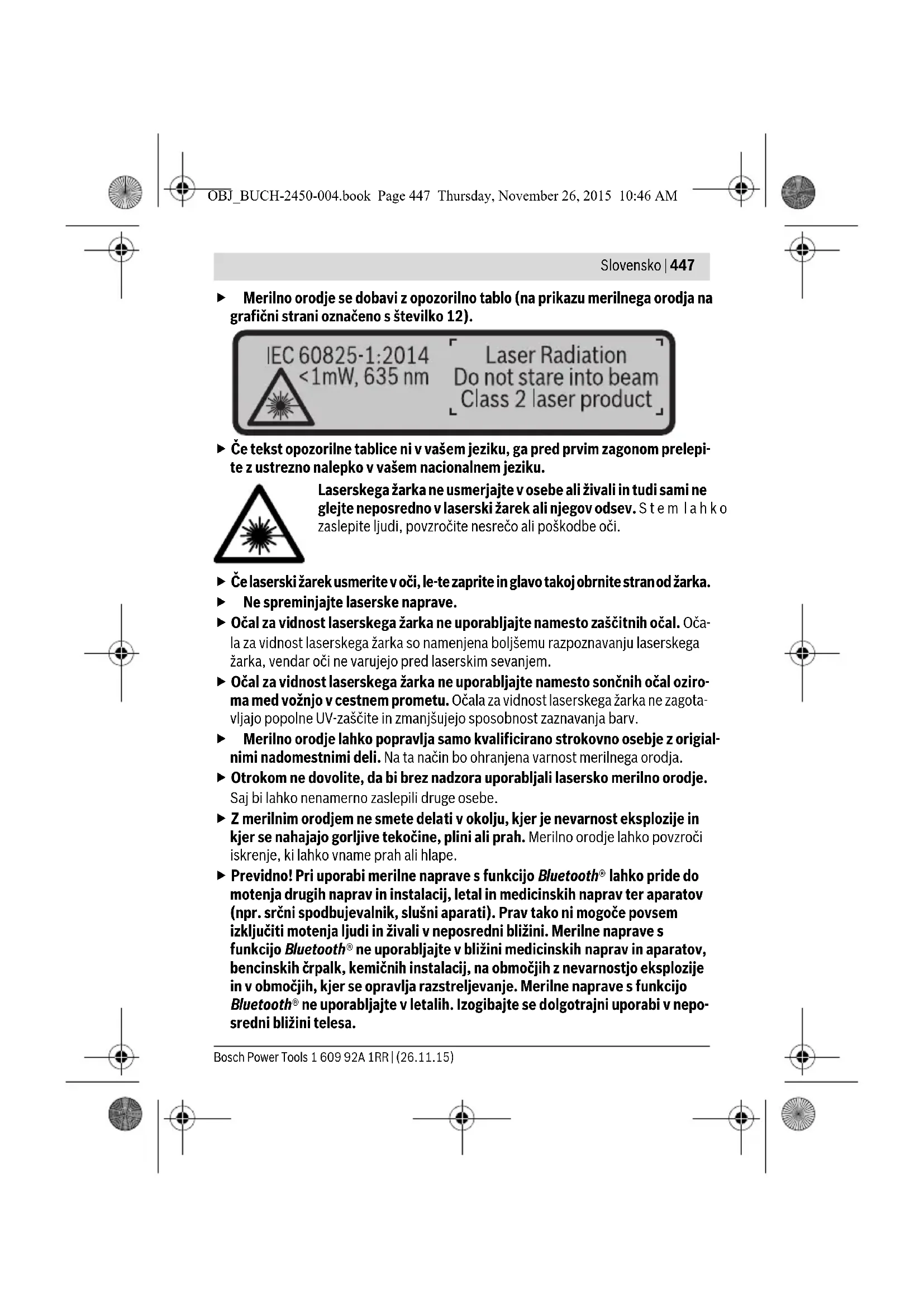 Jasno identifikacijo Vašega merilnega orodja omogoča serijska številka 11 na tipski ploščici. Digitalni laserski merilnik razdalj GLM 50 C OBJ_BUCH-2450-004.book Page 449 Thursday, November 26, 2015 10:46 AM450 | Slovensko 1 609 92A 1RR | (26.11.15) Bosch Power Tools Izjava o skladnosti Z izključno odgovornostjo izjavljamo, da je izdelek, opisan v „Tehničnih podatkih“ v skladu z vsemi relevantnimi določili direktiv 1999/5/ES in 2011/65/EU, vključno z njihovimi spremembami in ustreza naslednjim normam: EN 61010-1: 2010-10, EN 60825-1: 2014-08, EN 300 328 V1.8.1: 2012-06, EN 301 489-1 V1.8.1: 2008-04, EN 301 489-1 V1.9.2: 2011-09, EN 301 489-17 V2.2.1: 2012-09, EN 62479: 2010-09, EN 50581: 2012. Tehnična dokumentacija pri: Robert Bosch GmbH, PT/ETM9, 70764 Leinfelden-Echterdingen, GERMANY Robert Bosch GmbH, Power Tools Division 70764 Leinfelden-Echterdingen, GERMANY Leinfelden, 10.11.2015 Komponente na sliki Oštevilčenje naslikanih komponent se nanaša na prikaz merilnega orodja na strani z grafiko. 1 Zaslon 2 Tipka za merjenje[ ] 3 Tipka plus[+] 4 Tipka za izbiro referenčne ravnine 5 Vklopno/izklopna tipka[ ] 6 Tipka Bluetooth® 7 Funkcijska tipka[Func] 8 Tipka minus[–] 9 Pokrov predalčka za baterije 10 Aretiranje pokrova predalčka za baterije 11 Serijska številka 12 Opozorilna ploščica laserja 13 Navoj stojala 1/4" Henk Becker Executive Vice President Engineering Helmut Heinzelmann Head of Product Certification PT/ETM9 OBJ_BUCH-2450-004.book Page 450 Thursday, November 26, 2015 10:46 AMSlovensko | 451 Bosch Power Tools 1 609 92A 1RR | (26.11.15) 14 Sprejemna leča 15 Izhod laserskega žarka 16 Zaščitna torba 17 Laserska ciljna tabla* 18 Očala za vidnost laserskega žarka* 19 Stativ*
