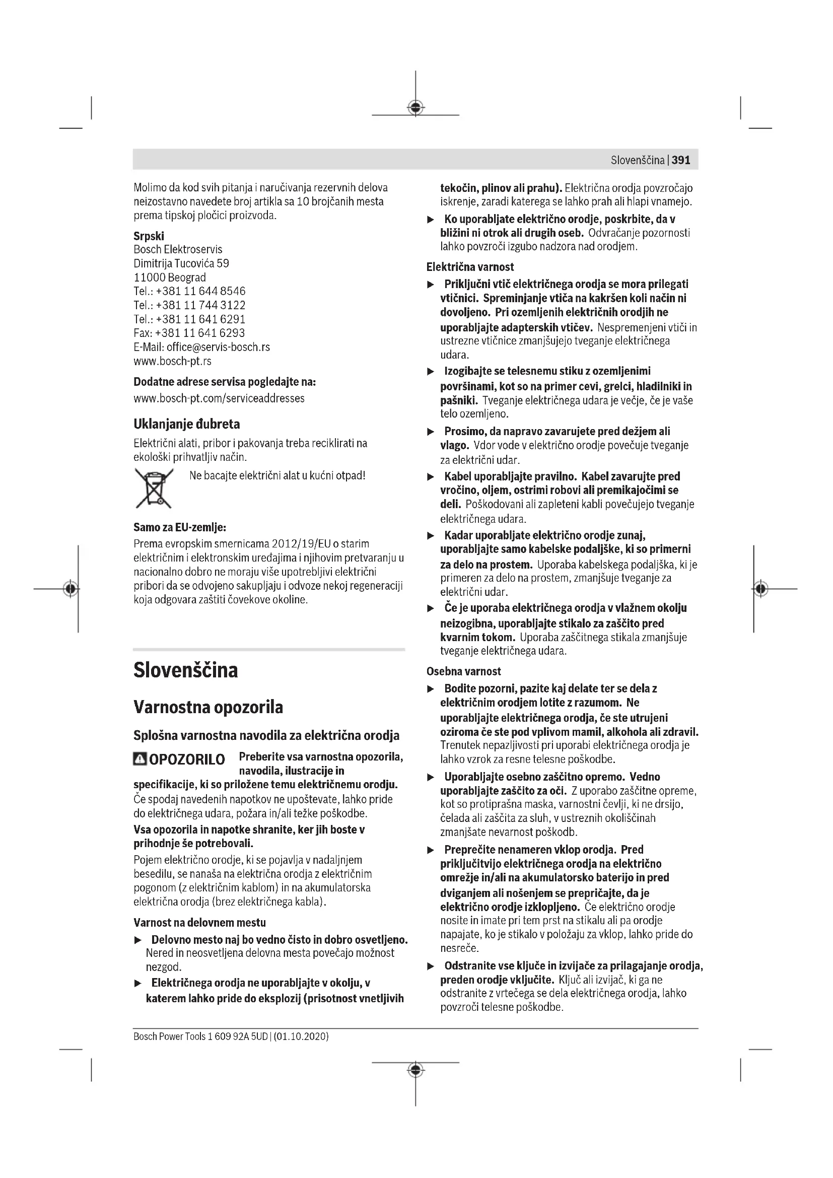 - List testere 254x30 mm, 40 zuba 2 608 640 443 List testere 254x30 mm, 60 zuba 2 608 640 444 Važi za sledeće tipove: 3 601 M30 442/ B2 List testere 254x25,4 mm, 40 zuba 2 608 640 901 List testere 254x25,4 mm, 60 zuba 2 608 640 902 Servis i saveti za upotrebu Servis odgovara na vaša pitanja u vezi sa popravkom i održavanjem vašeg proizvoda kao i u vezi sa rezervnim delovima. Šematske prikaze i informacije u vezi rezervnih delova naći ćete i pod: www.bosch-pt.com Bosch tim za konsultacije vam rado pomaže tokom primene, ukoliko imate pitanja o našim proizvodima i njihovom priboru. 1 609 92A 5UD | (01.10.2020) Bosch Power ToolsSlovenščina | 391 Molimo da kod svih pitanja i naručivanja rezervnih delova neizostavno navedete broj artikla sa 10brojčanih mesta prema tipskoj pločici proizvoda. Srpski Bosch Elektroservis Dimitrija Tucovića 59 11000 Beograd Tel.: +381 11 644 8546 Tel.: +381 11 744 3122 Tel.: +381 11 641 6291 Fax: +381 11 641 6293 E-Mail: office@servis-bosch.rs www.bosch-pt.rs Dodatne adrese servisa pogledajte na: www.bosch-pt.com/serviceaddresses Uklanjanje đubreta Električni alati, pribor i pakovanja treba reciklirati na ekološki prihvatljiv način. Ne bacajte električni alat u kućni otpad! Samo za EU‑zemlje: Prema evropskim smernicama 2012/19/EU o starim električnim i elektronskim uređajima i njihovim pretvaranju u nacionalno dobro ne moraju više upotrebljivi električni pribori da se odvojeno sakupljaju i odvoze nekoj regeneraciji koja odgovara zaštiti čovekove okoline. Slovenščina Varnostna opozorila Splošna varnostna navodila za električna orodja OPOZORILO Preberite vsa varnostna opozorila, navodila, ilustracije in specifikacije, ki so priložene temu električnemu orodju. Če spodaj navedenih napotkov ne upoštevate, lahko pride do električnega udara, požara in/ali težke poškodbe. Vsa opozorila in napotke shranite, ker jih boste v prihodnje še potrebovali. Pojem električno orodje, ki se pojavlja v nadaljnjem besedilu, se nanaša na električna orodja z električnim pogonom (z električnim kablom) in na akumulatorska električna orodja (brez električnega kabla). Varnost na delovnem mestu u Delovno mesto naj bo vedno čisto in dobro osvetljeno. Nered in neosvetljena delovna mesta povečajo možnost nezgod. u Električnega orodja ne uporabljajte v okolju, v katerem lahko pride do eksplozij (prisotnost vnetljivih tekočin, plinov ali prahu). Električna orodja povzročajo iskrenje, zaradi katerega se lahko prah ali hlapi vnamejo. u Ko uporabljate električno orodje, poskrbite, da v bližini ni otrok ali drugih oseb. Odvračanje pozornosti lahko povzroči izgubo nadzora nad orodjem. Električna varnost u Priključni vtič električnega orodja se mora prilegati vtičnici. Spreminjanje vtiča na kakršen koli način ni dovoljeno. Pri ozemljenih električnih orodjih ne uporabljajte adapterskih vtičev. Nespremenjeni vtiči in ustrezne vtičnice zmanjšujejo tveganje električnega udara. u Izogibajte se telesnemu stiku z ozemljenimi površinami, kot so na primer cevi, grelci, hladilniki in pašniki. Tveganje električnega udara je večje, če je vaše telo ozemljeno. u Prosimo, da napravo zavarujete pred dežjem ali vlago. Vdor vode v električno orodje povečuje tveganje za električni udar. u Kabel uporabljajte pravilno. Kabel zavarujte pred vročino, oljem, ostrimi robovi ali premikajočimi se deli. Poškodovani ali zapleteni kabli povečujejo tveganje električnega udara. u Kadar uporabljate električno orodje zunaj, uporabljajte samo kabelske podaljške, ki so primerni za delo na prostem. Uporaba kabelskega podaljška, ki je primeren za delo na prostem, zmanjšuje tveganje za električni udar. u Če je uporaba električnega orodja v vlažnem okolju neizogibna, uporabljajte stikalo za zaščito pred kvarnim tokom. Uporaba zaščitnega stikala zmanjšuje tveganje električnega udara. Osebna varnost u Bodite pozorni, pazite kaj delate ter se dela z električnim orodjem lotite z razumom. Ne uporabljajte električnega orodja, če ste utrujeni oziroma če ste pod vplivom mamil, alkohola ali zdravil. Trenutek nepazljivosti pri uporabi električnega orodja je lahko vzrok za resne telesne poškodbe. u Uporabljajte osebno zaščitno opremo. Vedno uporabljajte zaščito za oči. Z uporabo zaščitne opreme, kot so protiprašna maska, varnostni čevlji, ki ne drsijo, čelada ali zaščita za sluh, v ustreznih okoliščinah zmanjšate nevarnost poškodb. u Preprečite nenameren vklop orodja. Pred priključitvijo električnega orodja na električno omrežje in/ali na akumulatorsko baterijo in pred dviganjem ali nošenjem se prepričajte, da je električno orodje izklopljeno. Če električno orodje nosite in imate pri tem prst na stikalu ali pa orodje napajate, ko je stikalo v položaju za vklop, lahko pride do nesreče. u Odstranite vse ključe in izvijače za prilagajanje orodja, preden orodje vključite. Ključ ali izvijač, ki ga ne odstranite z vrtečega se dela električnega orodja, lahko povzroči telesne poškodbe. Bosch Power Tools 1 609 92A 5UD | (01.10.2020)392 | Slovenščina u Ne precenjujte svojih sposobnosti. Ves čas trdno stojite in vzdržujte ravnovesje. To omogoča boljši nadzor nad električnim orodjem v nepričakovanih situacijah. u Bodite primerno oblečeni. Ne nosite ohlapnih oblačil ali nakita. Las in oblačil ne približujte premikajočim se delom. Ohlapna oblačila, nakit ali dolgi lasje se lahko ujamejo v premikajoče se dele. u Če imate na voljo naprave za priklop sesalnika za prah ali zbiralnih posod, se prepričajte, da so te ustrezno priključene. Uporaba sistema za zbiranje prahu lahko zmanjša nevarnosti, povezane s prahom. u Naj seznanjenost z orodjem, ki jo pridobite s pogosto uporabo, ne bo razlog za to, da postanete lahkomiselni in ignorirate varnostna načela. V delčku sekunde lahko nepozorno dejanje pripelje do hude poškodbe. Uporaba in vzdrževanje električnega orodja u Električnega orodja ne preobremenjujte. 
