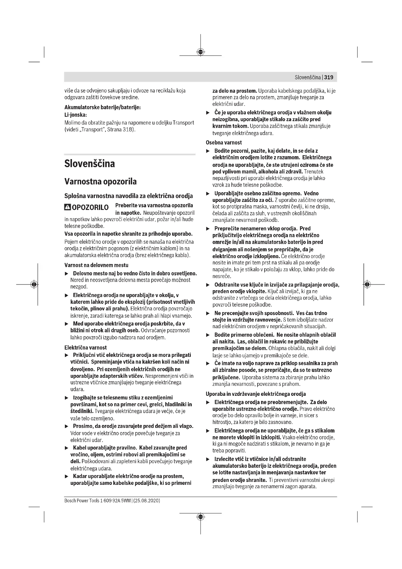 ] [m/s] 125 7 22,2 9000 80 125 – – 9000 80 75 30 M 14 9000 45 82 – M 14 9000 80 Vrtenje glave gonila (GWS 18V-10 PC) u Pred začetkom kakršnihkoli del na električnem orodju (na primer vzdrževanje, zamenjava orodja in podobno) kakor tudi med transportiranjem in shranjevanjem je treba iz električnega orodja odstraniti akumulatorsko baterijo. Prinenamernem Bosch Power Tools 1 609 92A 5WM | (25.08.2020)328 | Slovenščina aktiviranju vklopno/izklopnega stikala obstaja nevarnost telesnih poškodb. Glavo gonila lahko vrtite v korakih po 90°. Tako lahko stikalo za vklop/izklop v posebnih primerih namestite v ugodnejši položaj za uporabo, npr. za levičarje. Popolnoma odvijte vse 4vijake. Glavo gonila v novi položaj previdno nastavite tako, da je ne snamete z ohišja. Ponovno zategnite 4 vijake. Odsesavanje prahu/ostružkov Prah nekaterih materialov, npr. svinčenega premaza, nekaterih vrst lesa, mineralov in kovin lahko škoduje zdravju. Dotik ali vdihavanje tega prahu lahko povzroči alergične reakcije in/ali obolenja dihal uporabnika ali drugih prisotnih oseb. Določene vrste prahu, kot je npr. prah hrastovine ali bukovja, so rakotvorne, še posebej skupaj z dodatnimi snovmi za obdelavo lesa (kromat, zaščitno sredstvo za les). Material z vsebnostjo azbesta smejo obdelovati le strokovnjaki. – Poskrbite za dobro zračenje delovnega mesta. – Priporočamo, da nosite zaščitno masko za prah s filtrirnim razredom P2. Upoštevajte veljavne nacionalne predpise za obdelovane materiale. u Preprečite nabiranje prahu na delovnem mestu. Prah se lahko hitro vname. Delovanje Uporaba Namestitev akumulatorske baterije Napolnjeno akumulatorsko baterijo (8) od spredaj potisnite v podnožje električnega orodja, pri čemer se mora akumulatorska baterija trdno zaskočiti. Vklop/izklop Za zagon električnega orodja sprostitveno ročico (10) potisnite naprej, nato pa stikalo za vklop/izklop (6) potisnite navzgor. Za izklop električnega orodja izpustite stikalo za vklop/izklop (6). u Pred uporabo preverite brusilne nastavke. Brusilni nastavek mora biti brezhibno nameščen, tako da se lahko prosto vrti. Izvedite preizkusni tek orodja tako, da ga pustite delovati vsaj 1 minuto brez obremenitve. Ne uporabljajte poškodovanih brusilnih nastavkov ali takšnih, ki niso okrogli ali se tresejo. Poškodovani brusilni pripomočki se lahko razletijo in povzročijo poškodbe. Izklop pri povratnem udarcu Če pride do nenadnega povratnega udarca električnega orodja (npr. zaradi blokade pri rezanju), elektronika prekine napajanje motorja. Pri tem LED-svetilka (4) utripa v beli barvi, prikaz stanja (37) pa v rdeči. Za ponovni zagon stikalo za vklop/izklop (6) najprej namestite v izklopljen položaj in nato električno orodje ponovno vklopite. Zaščita pred ponovnim zagonom Zaščita pred ponovnim zagonom prepreči nenadzorovan vklop električnega orodja po prekinitvi električnega napajanja. Pri aktivirani zaščiti pred ponovnim zagonom prikaz stanja (37) utripa rdeče. Za ponovni zagon stikalo za vklop/izklop (6) najprej namestite v izklopljeni položaj in nato električno orodje ponovno vklopite. Uporabniški vmesnik (glejte sliko D) Uporabniški vmesnik (5) je namenjen predizbiri števila vrtljajev in prikazu stanja električnega orodja. Predizbira števila vrtljajev (GWS 18V-10 PSC) S tipko za predizbiro števila vrtljajev (36) lahko potrebno število vrtljajev izberete tudi med delovanjem. Podatki v spodnji razpredelnici so priporočene vrednosti. Material Uporaba Nastavek Stopnja predizbire števila vrtljajev