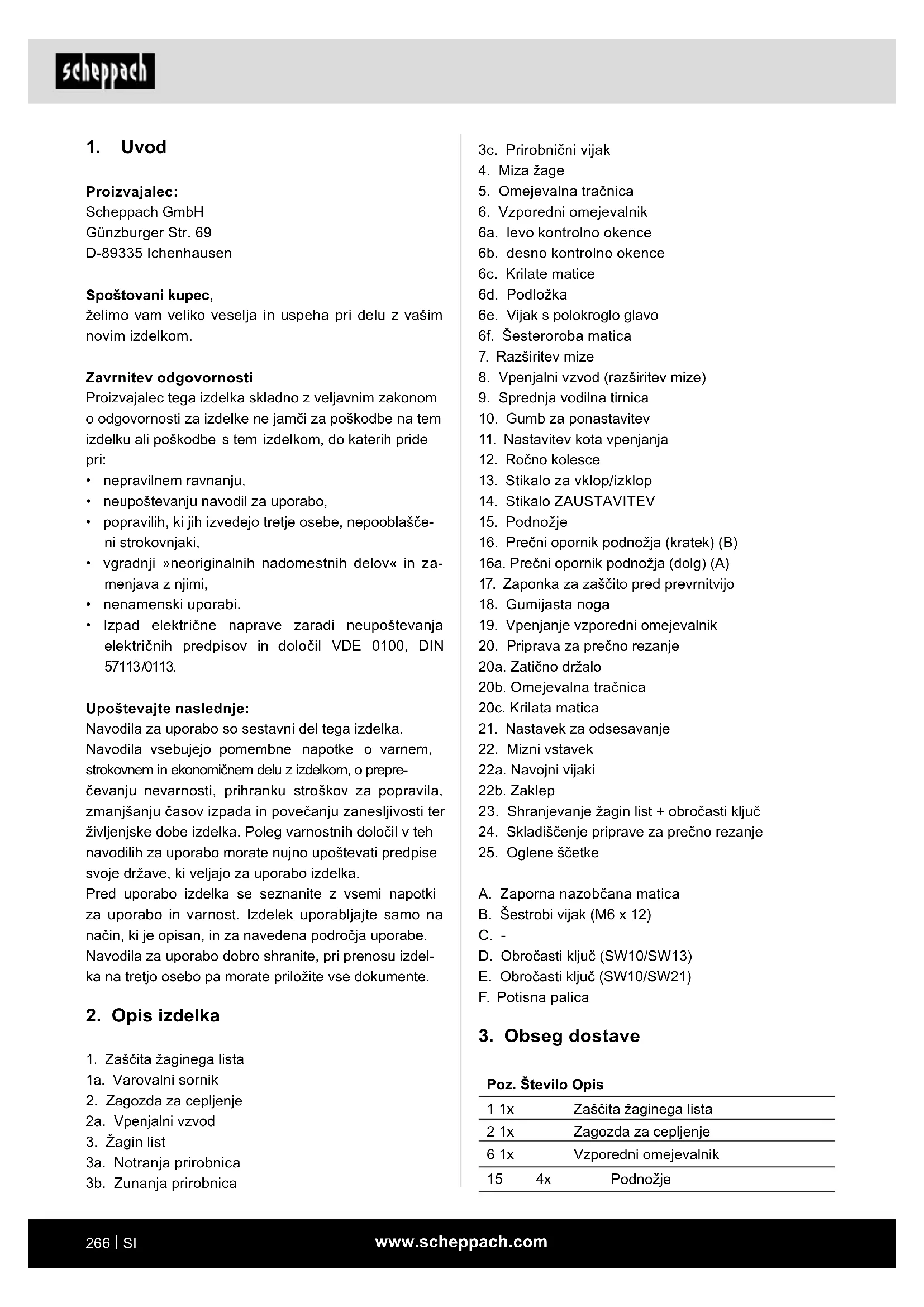 Poz. Število Opis 1 1x Zaščita žaginega lista 2 1x Zagozda za cepljenje 6 1x Vzporedni omejevalnik 15 4x Podnožje