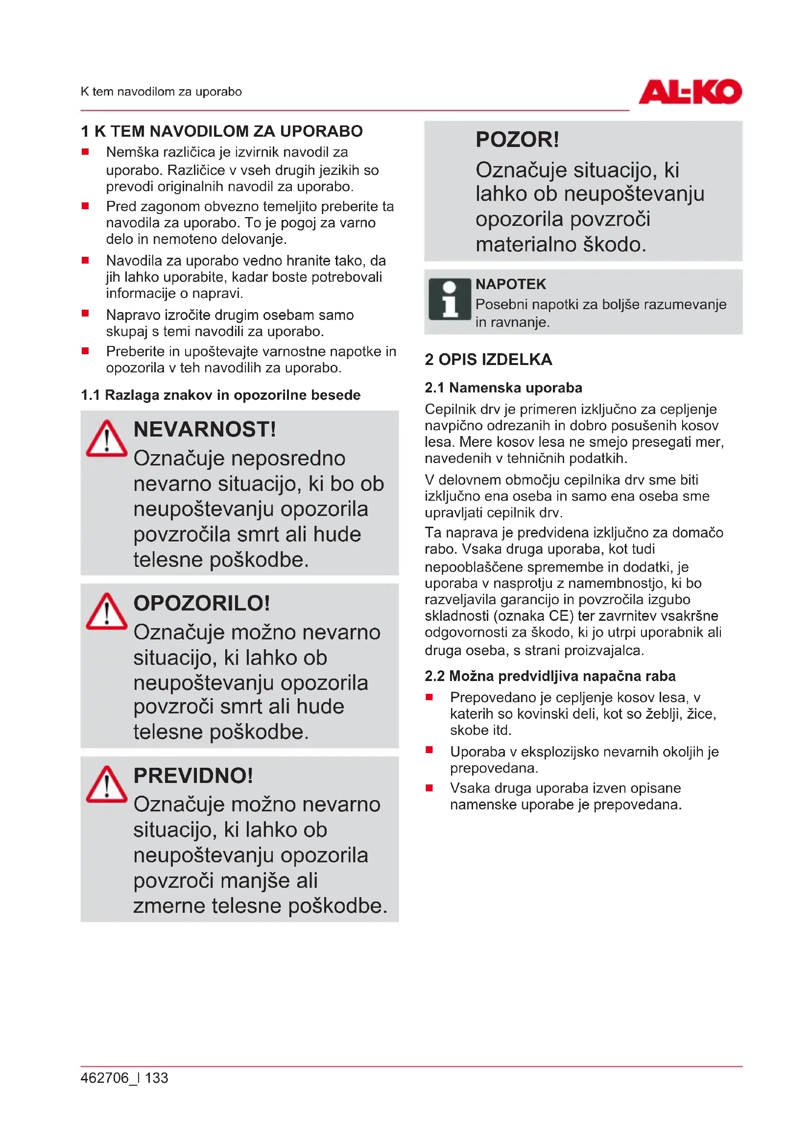 NEVARNOST! Označuje neposredno nevarno situacijo, ki bo ob neupoštevanju opozorila povzročila smrt ali hude telesne poškodbe. OPOZORILO! Označuje možno nevarno situacijo, ki lahko ob neupoštevanju opozorila povzroči smrt ali hude telesne poškodbe. PREVIDNO! Označuje možno nevarno situacijo, ki lahko ob neupoštevanju opozorila povzroči manjše ali zmerne telesne poškodbe. POZOR! Označuje situacijo, ki lahko ob neupoštevanju opozorila povzroči materialno škodo. NAPOTEK Posebni napotki za boljše razumevanje in ravnanje. 2 OPIS IZDELKA
