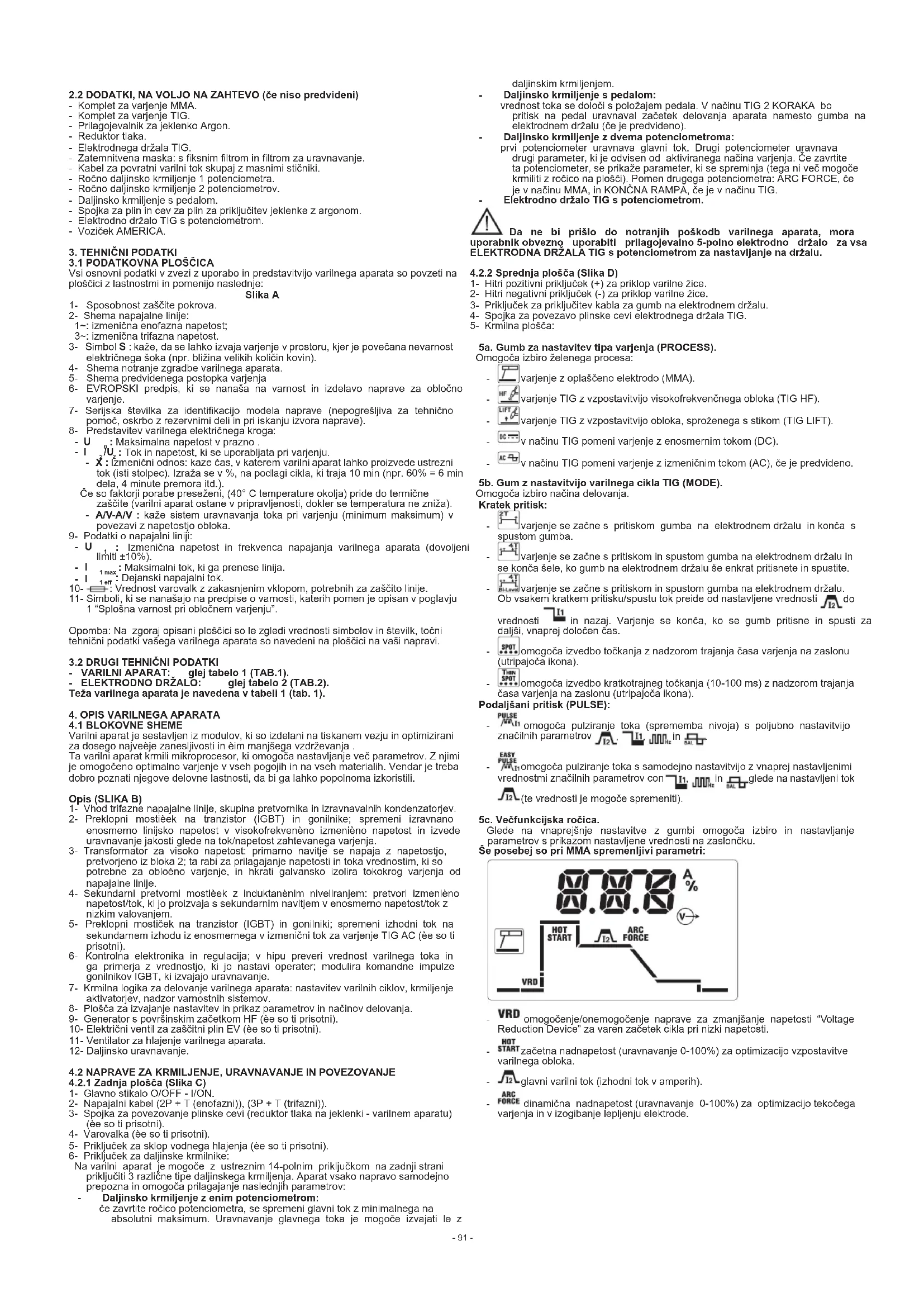 omogoča pulziranje toka s samodejno nastavitvijo z vnaprej nastavljenimi vrednostmi značilnih parametrov con , in glede na nastavljeni tok (te vrednosti je mogoče spremeniti). 5c.Večfunkcijskaročica. Glede na vnaprejšnje nastavitve z gumbi omogoča izbiro in nastavljanje parametrov s prikazom nastavljene vrednosti na zaslončku. ŠeposebejsopriMMAspremenljiviparametri: - omogočenje/onemogočenje naprave za zmanjšanje napetosti “Voltage Reduction Device” za varen začetek cikla pri nizki napetosti.