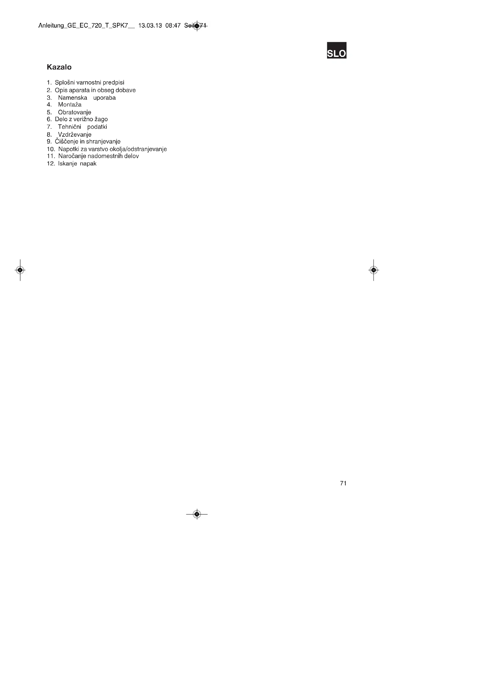 SLO Anleitung_GE_EC_720_T_SPK7__ 13.03.13 08:47 Seite 71Pakiranje: Naprava se nahaja v embalaži, da ne bi prišlo do poškodb med transportom. Ta embalaža je surovina in s tem ponovno uporabna ali pa jo je možno reciklirati. Pri uporabi naprav je potrebno upoštevati nekaj varnostnih ukrepov, da bi preprečili poškodbe in materialno škodo. 앬 Skrbno preberite navodila za uporabo in upoštevajte napotke. S pomočjo teh navodil za uporabo se seznanite s to napravo, njeno pravilno uporabo kot tudi z varnostnimi navodili. 앬 Le-te dobro shranite tako, da boste imeli zmeraj pri roki potrebne informacije. 앬 Če bi napravo izročili drugim osebam, Vas prosimo, da jim izročite tudi ta navodila za uporabo. Ne prevzemamo nobene odgovornosti za nezgode ali škodo, ki bi nastale zaradi neupoštevanja teh navodil za uporabo in varnostnih napotkov.
