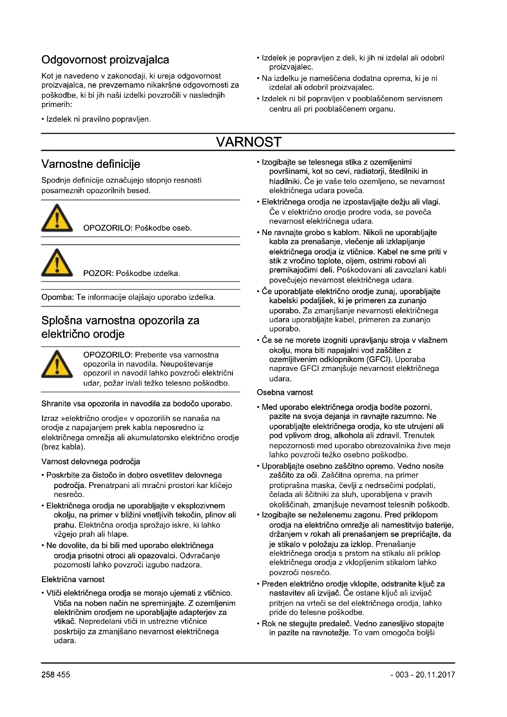 - Sledite navodilom v tem priročniku. Upoštevajte varnostne simbole in navodila. Če uporabnik ne upošteva navodil in simbolov, lahko pride do poškodb ali smrti.