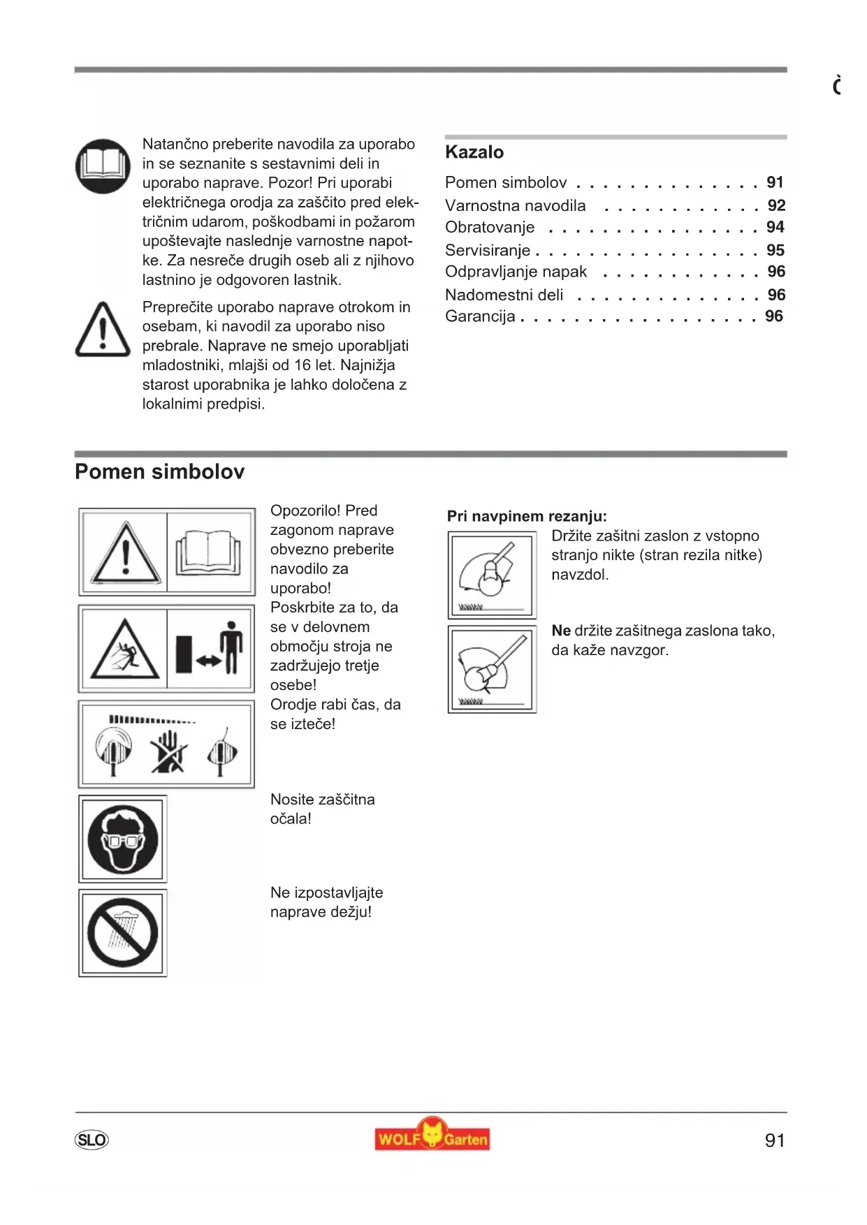 - Garancija Pomen simbolov Natanno preberite navodila za uporabo in se seznanite s sestavnimi deli in uporabo naprave. Pozor! Pri uporabi elektrinega orodja za zašito pred elek- trinim udarom, poškodbami in požarom upoštevajte naslednje varnostne napot- ke. Za nesree drugih oseb ali z njihovo lastnino je odgovoren lastnik. Prepreite uporabo naprave otrokom in osebam, ki navodil za uporabo niso prebrale. Naprave ne smejo uporabljati mladostniki, mlajši od 16 let. Najnižja starost uporabnika je lahko doloena z lokalnimi predpisi. Opozorilo! Pred zagonom naprave obvezno preberite navodilo za uporabo! Poskrbite za to, da se v delovnem obmoju stroja ne zadržujejo tretje osebe! Orodje rabi as, da se iztee! Nosite zašitna oala! Ne izpostavljajte naprave dežju! Pri navpinem rezanju: Držite zašitni zaslon z vstopno stranjo nikte (stran rezila nitke) navzdol. Ne držite zašitnega zaslona tako, da kaže navzgor. Izvirno navodilo za obratovanje92 p. 96