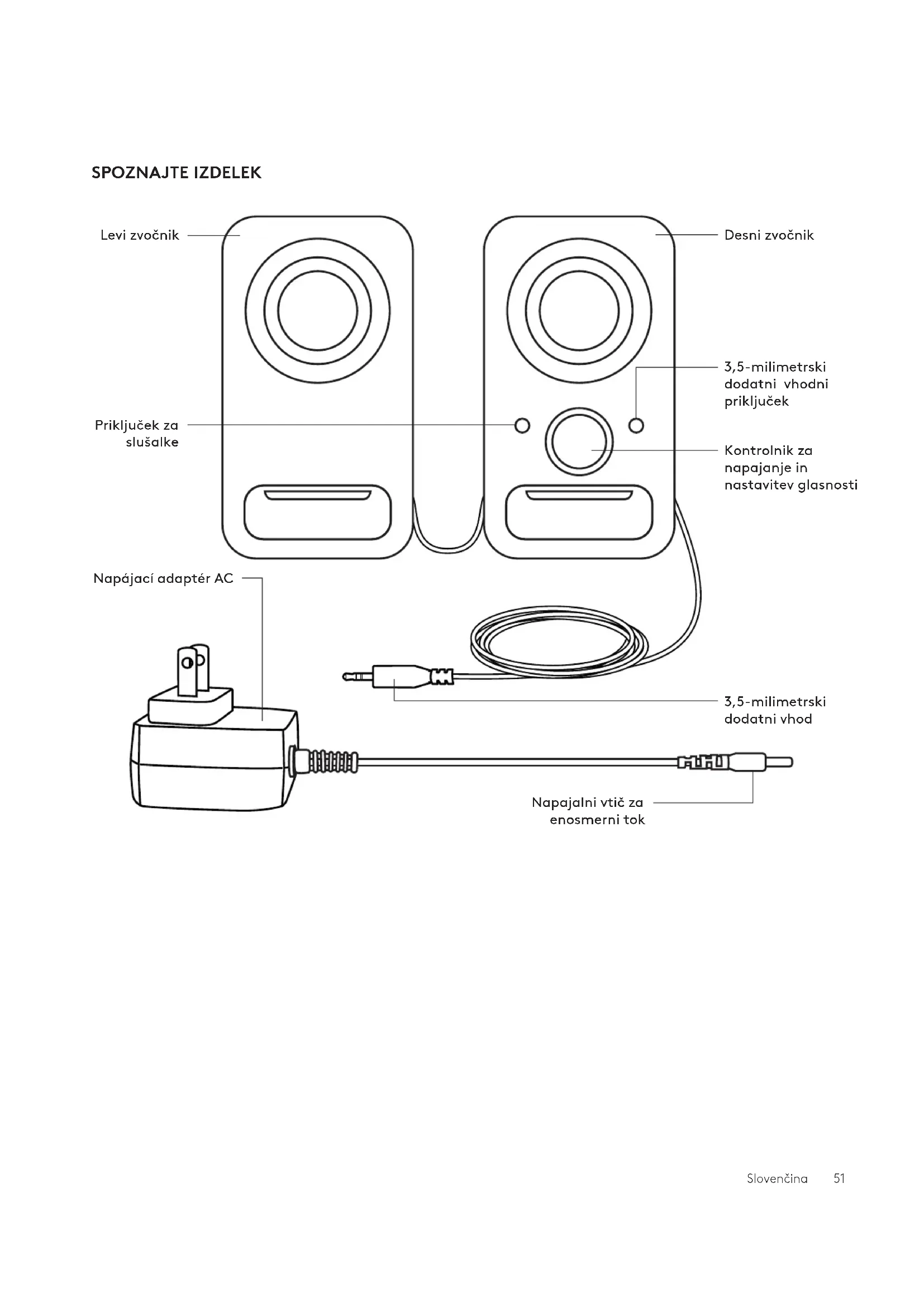 1. Priključite napajalni vtič za enosmerni tok v priključek na zadnji strani desnega zvočnika,