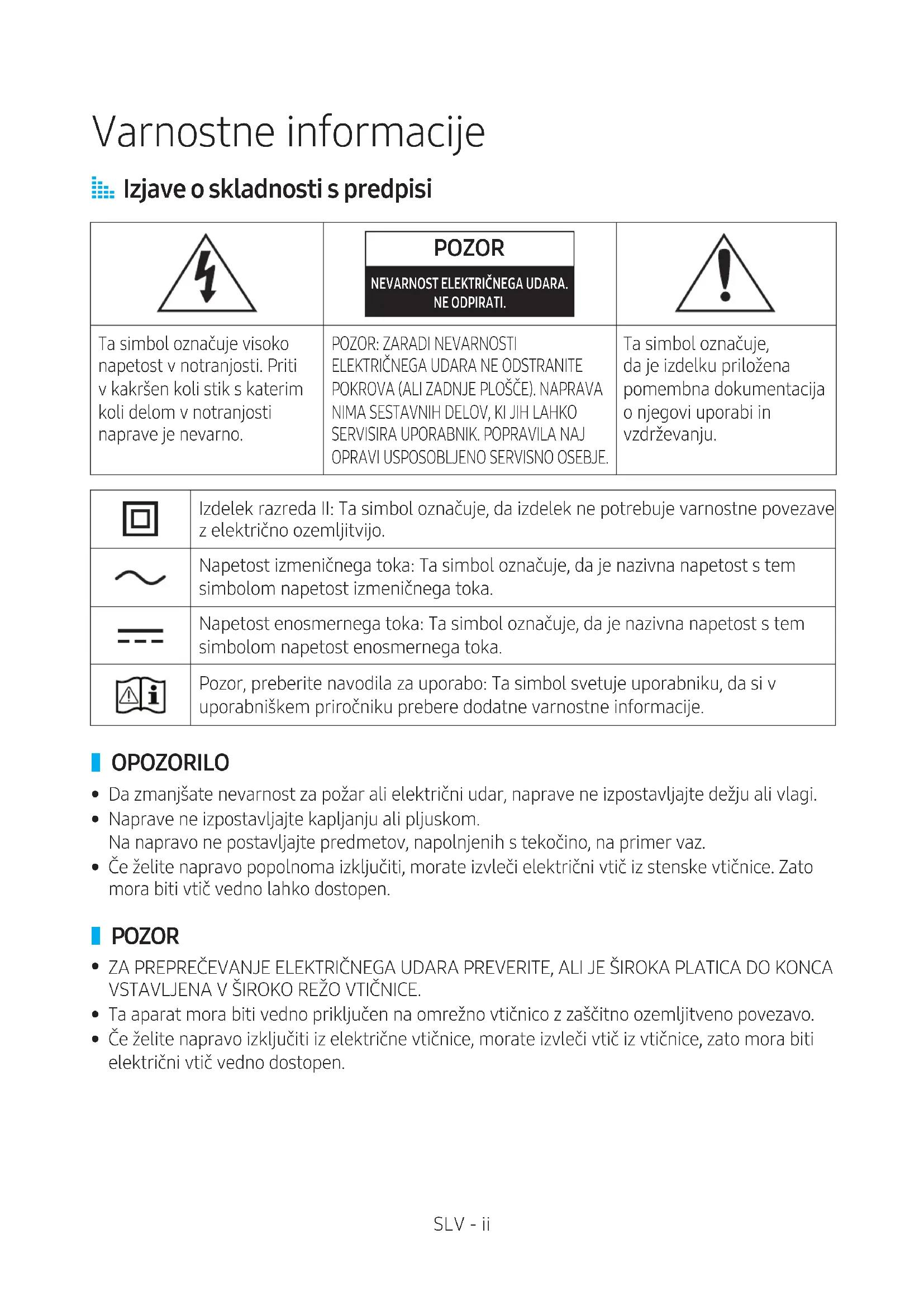 OPRAVI USPOSOBLJENO SERVISNO OSEBJE. Ta simbol označuje, da je izdelku priložena pomembna dokumentacija o njegovi uporabi in vzdrževanju. Izdelek razreda II: Ta simbol označuje, da izdelek ne potrebuje varnostne povezave z električno ozemljitvijo. Napetost izmeničnega toka: Ta simbol označuje, da je nazivna napetost s tem simbolom napetost izmeničnega toka. Napetost enosmernega toka: Ta simbol označuje, da je nazivna napetost s tem simbolom napetost enosmernega toka. Pozor, preberite navodila za uporabo: Ta simbol svetuje uporabniku, da si v uporabniškem priročniku prebere dodatne varnostne informacije.
