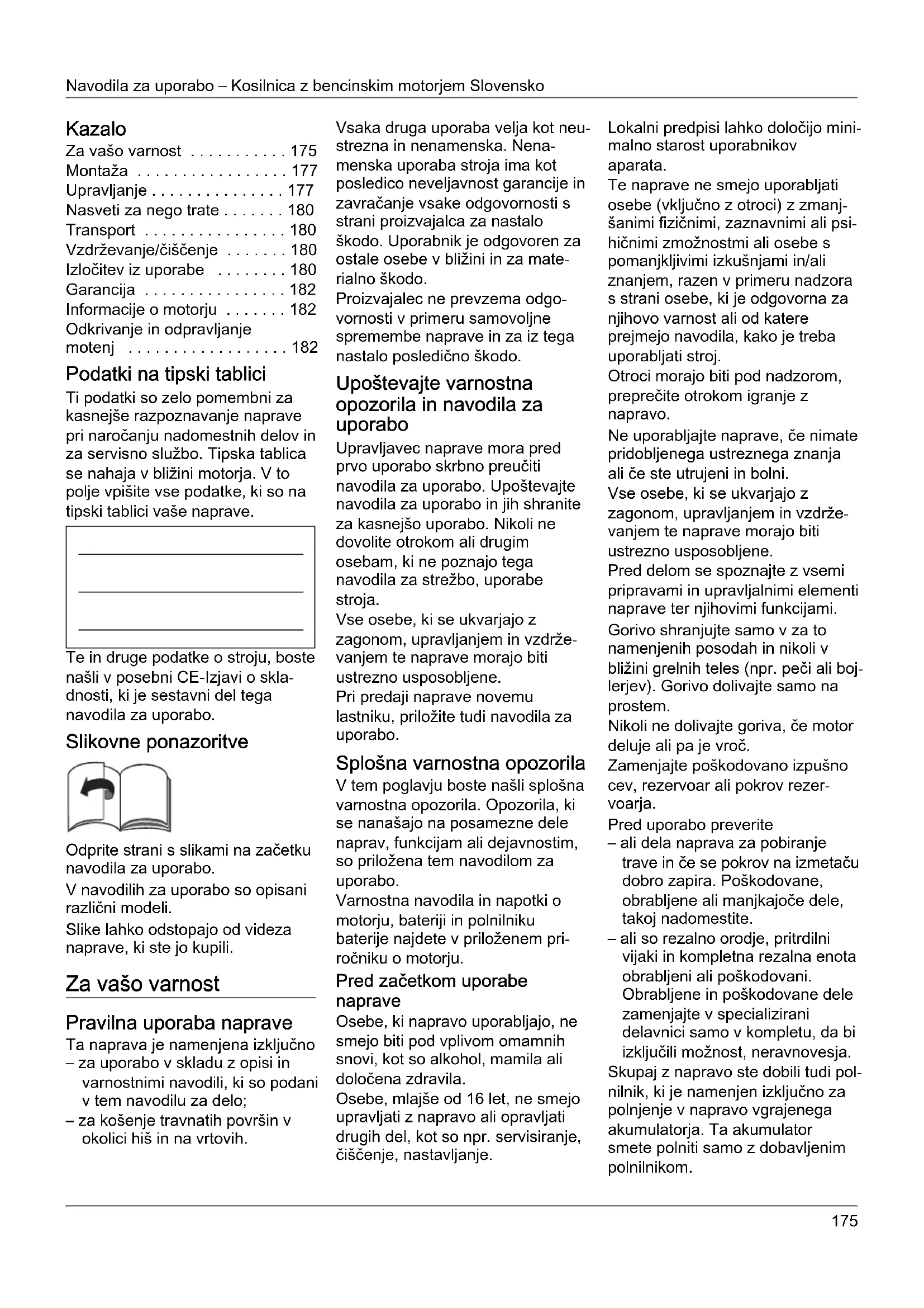 - Odkrivanje in odpravljanje motenj Podatki na tipski tablici Ti podatki so zelo pomembni za kasnejše razpoznavanje naprave pri naročanju nadomestnih delov in za servisno službo. Tipska tablica se nahaja v bližini motorja. V to polje vpišite vse podatke, ki so na tipski tablici vaše naprave. Te in druge podatke o stroju, boste našli v posebni CE-Izjavi o skla- dnosti, ki je sestavni del tega navodila za uporabo. Slikovne ponazoritve Odprite strani s slikami na začetku navodila za uporabo. V navodilih za uporabo so opisani različni modeli. Slike lahko odstopajo od videza naprave, ki ste jo kupili. Za vašo varnost Pravilna uporaba naprave Ta naprava je namenjena izključno – za uporabo v skladu z opisi in varnostnimi navodili, ki so podani v tem navodilu za delo; – za košenje travnatih površin v okolici hiš in na vrtovih. Vsaka druga uporaba velja kot neu- strezna in nenamenska. Nena- menska uporaba stroja ima kot posledico neveljavnost garancije in zavračanje vsake odgovornosti s strani proizvajalca za nastalo škodo. Uporabnik je odgovoren za ostale osebe v bližini in za mate- rialno škodo. Proizvajalec ne prevzema odgo- vornosti v primeru samovoljne spremembe naprave in za iz tega nastalo posledično škodo. Upoštevajte varnostna opozorila in navodila za uporabo Upravljavec naprave mora pred prvo uporabo skrbno preučiti navodila za uporabo. Upoštevajte navodila za uporabo in jih shranite za kasnejšo uporabo. Nikoli ne dovolite otrokom ali drugim osebam, ki ne poznajo tega navodila za strežbo, uporabe stroja. Vse osebe, ki se ukvarjajo z zagonom, upravljanjem in vzdrže- vanjem te naprave morajo biti ustrezno usposobljene. Pri predaji naprave novemu lastniku, priložite tudi navodila za uporabo. Splošna varnostna opozorila V tem poglavju boste našli splošna varnostna opozorila. Opozorila, ki se nanašajo na posamezne dele naprav, funkcijam ali dejavnostim, so priložena tem navodilom za uporabo. Varnostna navodila in napotki o motorju, bateriji in polnilniku baterije najdete v priloženem pri- ročniku o motorju. Pred začetkom uporabe naprave Osebe, ki napravo uporabljajo, ne smejo biti pod vplivom omamnih snovi, kot so alkohol, mamila ali določena zdravila. Osebe, mlajše od 16 let, ne smejo upravljati z napravo ali opravljati drugih del, kot so npr. servisiranje, čiščenje, nastavljanje. Lokalni predpisi lahko določijo mini- malno starost uporabnikov aparata. Te naprave ne smejo uporabljati osebe (vključno z otroci) z zmanj- šanimi fizičnimi, zaznavnimi ali psi- hičnimi zmožnostmi ali osebe s pomanjkljivimi izkušnjami in/ali znanjem, razen v primeru nadzora s strani osebe, ki je odgovorna za njihovo varnost ali od katere prejmejo navodila, kako je treba uporabljati stroj. Otroci morajo biti pod nadzorom, preprečite otrokom igranje z napravo. Ne uporabljajte naprave, če nimate pridobljenega ustreznega znanja ali če ste utrujeni in bolni. Vse osebe, ki se ukvarjajo z zagonom, upravljanjem in vzdrže- vanjem te naprave morajo biti ustrezno usposobljene. Pred delom se spoznajte z vsemi pripravami in upravljalnimi elementi naprave ter njihovimi funkcijami. Gorivo shranjujte samo v za to namenjenih posodah in nikoli v bližini grelnih teles (npr. peči ali boj- lerjev). Gorivo dolivajte samo na prostem. Nikoli ne dolivajte goriva, če motor deluje ali pa je vroč. Zamenjajte poškodovano izpušno cev, rezervoar ali pokrov rezer- voarja. Pred uporabo preverite – ali dela naprava za pobiranje trave in če se pokrov na izmetaču dobro zapira. Poškodovane, obrabljene ali manjkajoče dele, takoj nadomestite. – ali so rezalno orodje, pritrdilni vijaki in kompletna rezalna enota obrabljeni ali poškodovani. Obrabljene in poškodovane dele zamenjajte v specializirani delavnici samo v kompletu, da bi izključili možnost, neravnovesja. Skupaj z napravo ste dobili tudi pol- nilnik, ki je namenjen izključno za polnjenje v napravo vgrajenega akumulatorja. Ta akumulator smete polniti samo z dobavljenim polnilnikom.Slovensko Navodila za uporabo – Kosilnica z bencinskim motorjem p. 182