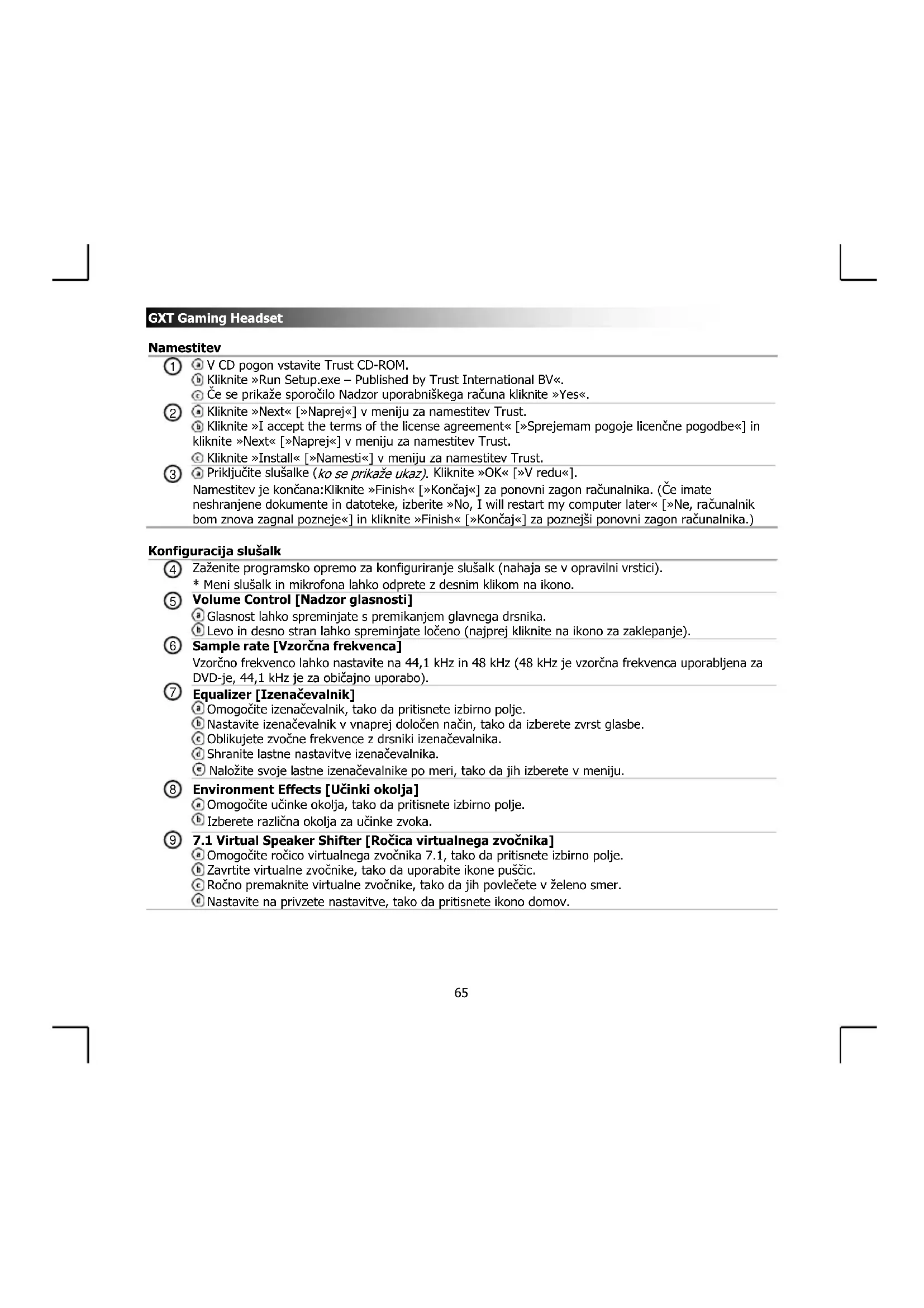 V CD pogon vstavite Trust CD-ROM. Kliknite »Run Setup.exe – Published by Trust International BV«. Če se prikaže sporočilo Nadzor uporabniškega računa kliknite »Yes«. Kliknite »Next« [»Naprej«] v meniju za namestitev Trust. Kliknite »I accept the terms of the license agreement« [»Sprejemam pogoje licenčne pogodbe«] in kliknite »Next« [»Naprej«] v meniju za namestitev Trust. Kliknite »Install« [»Namesti«] v meniju za namestitev Trust. Priključite slušalke ( ko se prikaže ukaz). Kliknite »OK« [»V redu«]. Namestitev je končana:Kliknite »Finish« [»Končaj«] za ponovni zagon računalnika. (Če imate neshranjene dokumente in datoteke, izberite »No, I will restart my computer later« [»Ne, računalnik bom znova zagnal pozneje«] in kliknite »Finish« [»Končaj«] za poznejši ponovni zagon računalnika.)