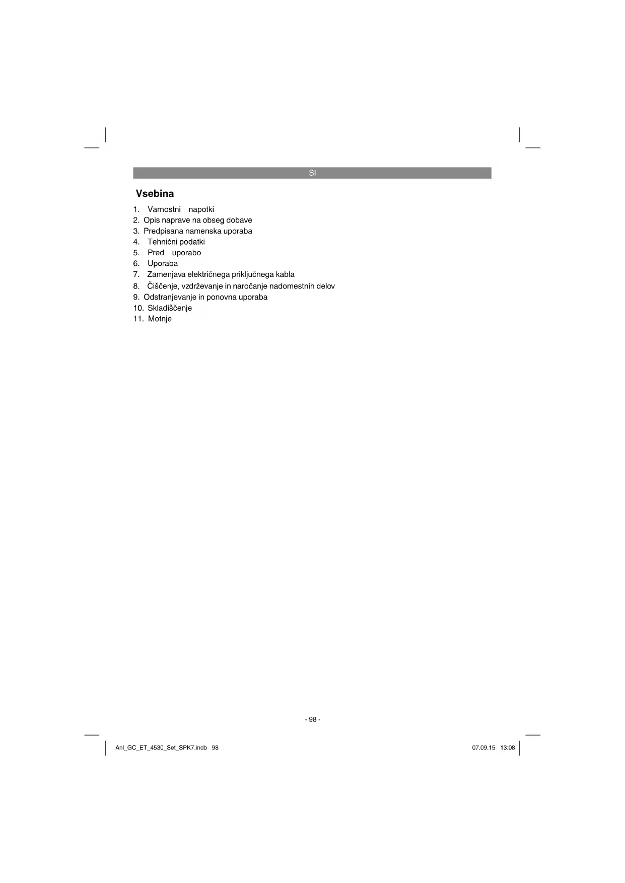 Naprava je primerna za obrezovanje trate in manjših travnih površin na vrtu zasebnih hiš in ljubiteljskih vrtov. Naprave za zasebni domač in ljubiteljski vrt so tis- te naprave, ki se ne uporabljajo v javnih nasadih, parkih, na športnih igriščih ter v kmetijstvu in goz- darstvu. Upoštevanje priloženih proizvajalčevih navodil za uporabo je pogoj za pravilno uporabo naprave. Nevarnost! Zaradi nevarnosti poškodovanja oseb ali materialne škode naprave ne upora- bljajte za sesekljanje materiala za komposti- ranje. Anl_GC_ET_4530_Set_SPK7.indb 99Anl_GC_ET_4530_Set_SPK7.indb 99 07.09.15 13:0807.09.15 13:08SI