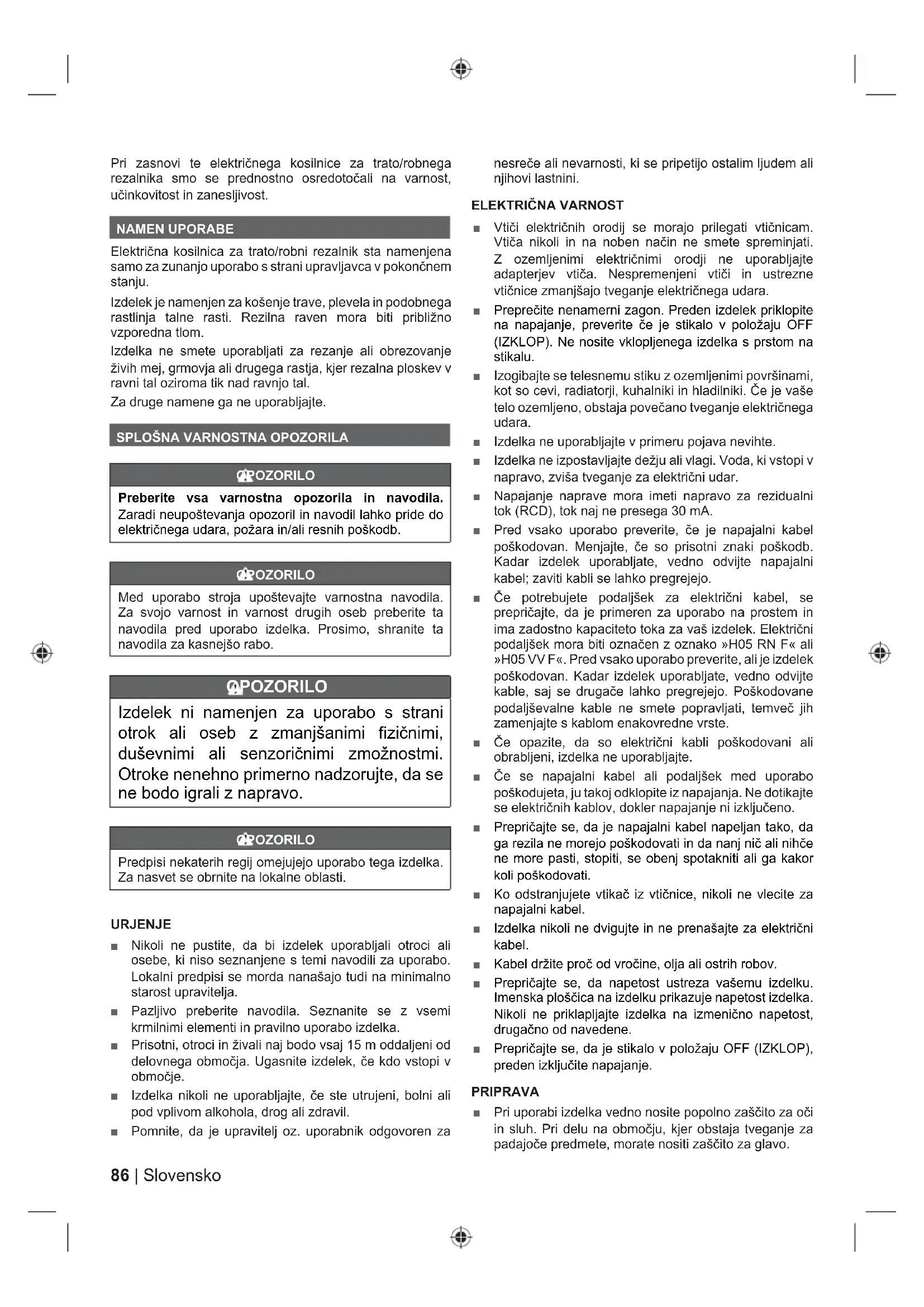 Priključite u utičnicu za napajanje Isključite iz utičnice za napajanje Dijelovi ili pribor prodan odvojeno Napomena Upozorenje86 | Slovensko Pri zasnovi te električnega kosilnice za trato/robnega rezalnika smo se prednostno osredotočali na varnost, učinkovitost in zanesljivost. NAMEN UPORABE Električna kosilnica za trato/robni rezalnik sta namenjena samo za zunanjo uporabo s strani upravljavca v pokončnem stanju. Izdelek je namenjen za košenje trave, plevela in podobnega rastlinja talne rasti. Rezilna raven mora biti približno vzporedna tlom. Izdelka ne smete uporabljati za rezanje ali obrezovanje živih mej, grmovja ali drugega rastja, kjer rezalna ploskev v ravni tal oziroma tik nad ravnjo tal. Za druge namene ga ne uporabljajte.