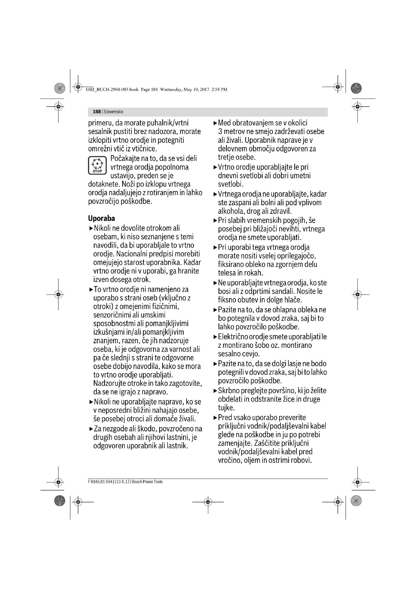 Cilj rukovanja Slika Strana Simptomi Mogući uzroci Pomoć Baštenski uredjaj ne radi Komponente nisu ispravno montirane pogledajte „montaža“ Nema mrežnog napona Prokontrolisati i uključiti Neispravna mrežna utičnica Koristite drugu utičnicu Oštećen produžni kabl Ispitajte i zamenite kabl ako je oštećen Osigurač je izbio Promeniti osigurač Motorna zaštita je reagovala Motor ohladiti i ispitati da li duvaljka blokira Baštenski uredjaj radi sa prekidima Oštećen produžni kabl Ispitajte i zamenite kabl ako je oštećen Interni kablovi baštenskog uredjaja su u kvaru Potražiti ovlašćeni servis Prekidač za uključivanje/isključivanje je u kvaru Potražiti ovlašćeni servis Motorna zaštita je reagovala Motor ohladiti i ispitati da li duvaljka blokira Jake vibracije/šumovi Baštenski uredjaj je u kvaru Potražiti ovlašćeni servis Baštenski uredjaj duva/ne usisava Mlaznica/usisna cev blokira Osloboditi mlaznicu/usisnu cev Mlaznica/usisna cev se ne može montirati Pogrešna montaža pogledajte „montaža“ Intenzitet usisavanja popušta Prihvatni džak je pun Isprazniti džak za prihvat Priključna štucna džaka za prihvat blokira Oslobodite priključnu štucnu džaka za prihvat Duvaljka ne rotira Duvaljka blokira Isključiti baštenski uredjaj i ukloniti blokiranje (nosite zaštitne rukavice) OBJ_BUCH-2968-003.book Page 186 Wednesday, May 10, 2017 2:58 PMSlovensko | 187 Bosch Power Tools F 016 L81 594 | (10.5.17) Servisna služba i savetovanje o upotrebi www.bosch-garden.com Molimo navedie kod svih pitanja i naručivanje rezervnih delova neizostavno broj predmeta sa 10 mesta prema tipskoj tablici baštenskog uredjaja. Srpski Bosch Elektroservis Dimitrija Tucovića 59 11000 Beograd Tel.: +381 11 644 8546 Tel.: +381 11 744 3122 Tel.: +381 11 641 6291 Fax: +381 11 641 6293 E-Mail: office@servis-bosch.rs www.bosch-pt.rs Keller d.o.o. Ljubomira Nikolica 29 18000 Nis Tel./Fax: +381 18 274 030 Tel./Fax: +381 18 531 798 E-Mail: office@keller-nis.com www.bosch-pt.rs Uklanjanje djubreta Baštenski uredjaji, pribor i pakovanja treba da se odvoze nekojh regeneraciji koja odgovara zaštiti čovekove okoline. Ne bacajte baštenski uredjaj u kućno djubre! Samo za EU-zemlje: Prema evropskoj smernici 2012/19/EU o starim električnim i elektronskim uredjajima i njijhovom pretvaranju u nacionalno dobro ne moraju više neupotrebljivi električni i elektronski uredjaji da se odvojeno sakupljaju i odvoze reciklaži koja odgovara zaštiti čovekove sredine. Zadržavamo pravo na promene. Slovensko Varnostna navodila Pozor! Skrbno si preberite naslednja navodila. Seznanite se z upravljalnimi elementi in s pravilno uporabo vrtnega orodja. Prosimo, da to navodilo za obratovanje varno shranite za kasnejšo uporabo. Razlaga simbolov na vrtnem orodju Splošno opozorilo na nevarnost. Preberite si to navodilo za obratovanje. Pazite, da predmeti, ki bi odleteli od škarij, ne bodo poškodovali oseb, ki stojijo v bližini. Opozorilo: Ko vrtno orodje obratuje, držite varno razdaljo do slednjega. Rotirajoč ventilator. Med tekom vrtnega orodja z rokami in nogami ne smete priti v odprtine. Med tekom vrtnega orodja z rokami in nogami ne smete priti v odprtine. Pazite na to, da se osebe v bližini ne bodo poškodovale zaradi okrog letečih tujkov od vrtnega orodja. Pri drugih osebah pazite na to, da se bodo nahajale v varni razdalji do vrtnega orodja. Nosite zaščito sluha in zaščitna očala. Ne uporabljajte naprave, ko dežuje in med dežjem ne puščajte puhalnika/vrtnega sesalnika na prostem. Preden želite opraviti nastavitve ali vzdrževalna dela na vrtnem orodju ali preden ga želite občistiti ali če se je zamotal, prerezal ali poškodoval kabel oziroma v OBJ_BUCH-2968-003.book Page 187 Wednesday, May 10, 2017 2:58 PM188 | Slovensko F 016 L81 594 | (10.5.17) Bosch Power Tools primeru, da morate puhalnik/vrtni sesalnik pustiti brez nadozora, morate izklopiti vrtno orodje in potegniti omrežni vtič iz vtičnice. Počakajte na to, da se vsi deli vrtnega orodja popolnoma ustavijo, preden se je dotaknete. Noži po izklopu vrtnega orodja nadaljujejo z rotiranjem in lahko povzročijo poškodbe. Uporaba Nikoli ne dovolite otrokom ali osebam, ki niso seznanjene s temi navodili, da bi uporabljale to vrtno orodje. Nacionalni predpisi morebiti omejujejo starost uporabnika. Kadar vrtno orodje ni v uporabi, ga hranite izven dosega otrok. To vrtno orodje ni namenjeno za uporabo s strani oseb (vključno z otroki) z omejenimi fizičnimi, senzoričnimi ali umskimi sposobnostmi ali pomanjkljivimi izkušnjami in/ali pomanjkljivim znanjem, razen, če jih nadzoruje oseba, ki je odgovorna za varnost ali pa če slednji s strani te odgovorne osebe dobijo navodila, kako se mora to vrtno orodje uporabljati. Nadzorujte otroke in tako zagotovite, da se ne igrajo z napravo. Nikoli ne uporabljajte naprave, ko se v neposredni bližini nahajajo osebe, še posebej otroci ali domače živali. Za nezgode ali škodo, povzročeno na drugih osebah ali njihovi lastnini, je odgovoren uporabnik ali lastnik. Med obratovanjem se v okolici 3 metrov ne smejo zadrževati osebe ali živali. Uporabnik naprave je v delovnem območju odgovoren za tretje osebe. Vrtno orodje uporabljajte le pri dnevni svetlobi ali dobri umetni svetlobi. Vrtnega orodja ne uporabljajte, kadar ste zaspani ali bolni ali pod vplivom alkohola, drog ali zdravil. Pri slabih vremenskih pogojih, še posebej pri bližajoči nevihti, vrtnega orodja ne smete uporabljati. Pri uporabi tega vrtnega orodja morate nositi vselej oprilegajočo, fiksirano obleko na zgornjem delu telesa in rokah. Ne uporabljajte vrtnega orodja, ko ste bosi ali z odprtimi sandali. Nosite le fiksno obutev in dolge hlače. Pazite na to, da se ohlapna obleka ne bo potegnila v dovod zraka, saj bi to lahko povzročilo poškodbe. Električno orodje smete uporabljati le z montirano šobo oz. montirano sesalno cevjo. Pazite na to, da se dolgi lasje ne bodo potegnili v dovod zraka, saj bi to lahko povz
