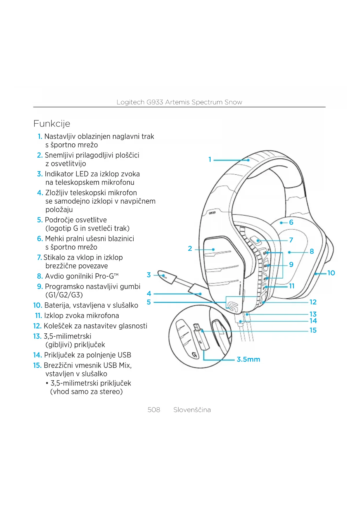 - 3,5-milimetrski priključek (vhod samo za stereo)Logitech G933 Artemis Spectrum Snow 509 Slovenščina Prikaz gumbov na slušalkah z mikrofonom