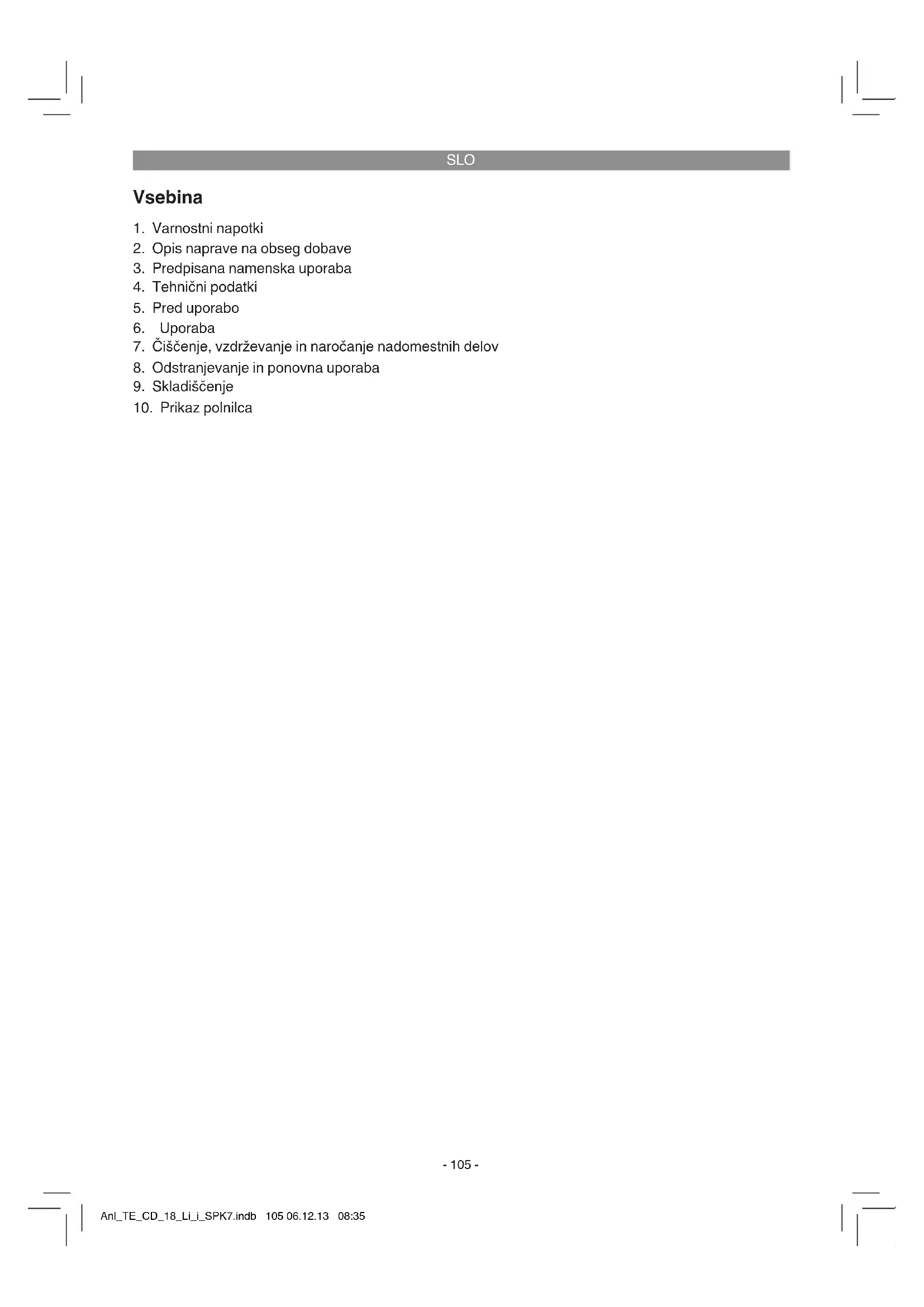 Samo za dežele EU Električnega orodja ne mečite med gospodinjske odpadke! V skladu z evropsko smernico 2002/96/EG o starih električnih in elektronskih napravah in v skladu z iz- vajanjem nacionalne zakonodaje morate ločeno zbirati izrabljena električna orodja in jih predati v okoljs- ko varno ponovno predelavo. Reciklažna alternativa za poziv za vračanje: Lastnik električne naprave je alternativno zavezan, da namesto vračanja sodeluje pri pri strokovno ustreznem recikliranju v primeru predaje lastnine. Staro napravo se lahko v ta namen tudi prepusti na odvzemnem mestu, ki izvaja odstranjevanje v smislu nacionalne zakonodaje o odstranjevanju takšnih odpadkov. To se ne nanaša na starim napravam priložene dele pribora in opreme brez električnih kom- ponent. Ponatis ali kakršnokoli razmnoževanje dokumentacije in spremljajočih papirjev o proizvodu, tudi po izvlečkih, je dovoljeno samo z izrecnim soglasjem ISC GmbH. Pridržana pravica do tehničnih sprememb Anl_TE_CD_18_Li_i_SPK7.indb 113 06.12.13 08:35SLO