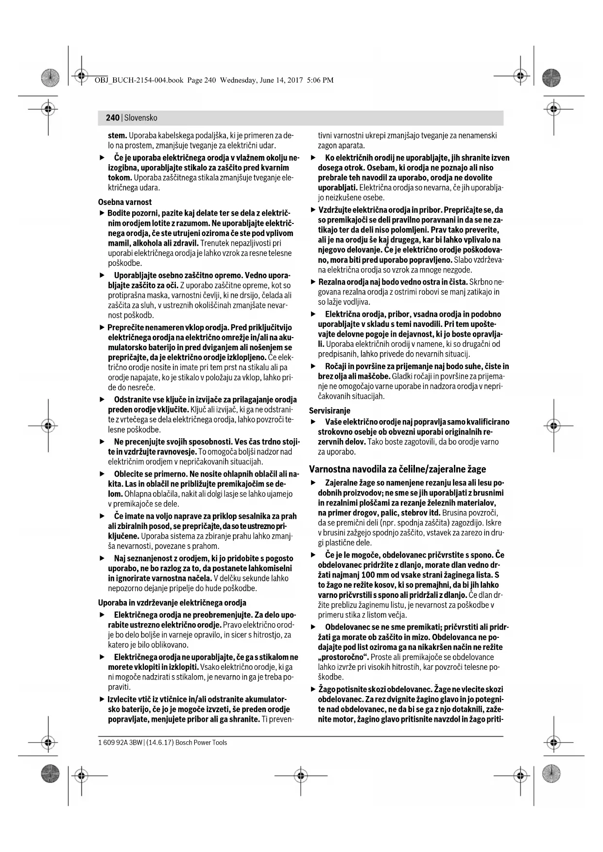 drževa- na električna orodja so vzrok za mnoge nezgode. Rezalna orodja naj bodo vedno ostra in čista. Skrbno ne- govana rezalna orodja z ostrimi robovi se manj zatikajo in so lažje vodljiva. Električna orodja, pribor, vsadna orodja in podobno uporabljajte v skladu s temi navodili. Pri tem upošte- vajte delovne pogoje in dejavnost, ki jo boste opravlja- li. Uporaba električnih orodij v namene, ki so drugačni od predpisanih, lahko privede do nevarnih situacij. Ročaji in površine za prijemanje naj bodo suhe, čiste in brez olja ali maščobe. Gladki ročaji in površine za prijema- nje ne omogočajo varne uporabe in nadzora orodja v nepri- čakovanih situacijah. Servisiranje Vaše električno orodje naj popravlja samo kvalificirano strokovno osebje ob obvezni uporabi originalnih re- zervnih delov. Tako boste zagotovili, da bo orodje varno za uporabo. Varnostna navodila za čelilne/zajeralne žage Zajeralne žage so namenjene rezanju lesa ali lesu po- dobnih proizvodov; ne sme se jih uporabljati z brusnimi in rezalnimi ploščami za rezanje železnih materialov, na primer drogov, palic, stebrov itd. Brusina povzroči, da se premični deli (npr. spodnja zaščita) zagozdijo. Iskre v brusini zažgejo spodnjo zaščito, vstavek za zarezo in dru- gi plastične dele. Če je le mogoče, obdelovanec pričvrstite s spono. Če obdelovanec pridržite z dlanjo, morate dlan vedno dr- žati najmanj 100 mm od vsake strani žaginega lista. S to žago ne režite kosov, ki so premajhni, da bi jih lahko varno pričvrstili s spono ali pridržali z dlanjo. Če dlan dr- žite preblizu žaginemu listu, je nevarnost za poškodbe v primeru stika z listom večja. Obdelovanec se ne sme premikati; pričvrstiti ali pridr- žati ga morate ob zaščito in mizo. Obdelovanca ne po- dajajte pod list oziroma ga na nikakršen način ne režite „prostoročno“. Proste ali premikajoče se obdelovance lahko izvrže pri visokih hitrostih, kar povzroči telesne po- škodbe. Žago potisnite skozi obdelovanec. Žage ne vlecite skozi obdelovanec. Za rez dvignite žagino glavo in jo potegni- te nad obdelovanec, ne da bi se ga z njo dotaknili, zaže- nite motor, žagino glavo pritisnite navzdol in žago priti- OBJ_BUCH-2154-004.book Page 240 Wednesday, June 14, 2017 5:06 PMSlovensko | 241 Bosch Power Tools 1 609 92A 3BW | (14.6.17) snite skozi obdelovanec. Pri rezanju v smeri vleka lista se lahko zgodi, da se žagin list povzpne na vrh obdelovanca in mehanizem z listom grobo izvrže proti upravljavcu. Z dlanjo nikoli ne segajte čez črto načrtovanega reza, niti pred žaginim listom niti za njim. Zelo nevarno je ob- delovanec držati „prekrižano“, t. j. če ga z levo dlanjo držite na desni strani lista in obratno. Da bi odstranili drobce lesa, ali iz katerega koli drugega vzroka med vrtenjem lista z nobeno dlanjo ne segajte za zaščito bližje od 100 mm kateri koli strani žaginega lista. Razdalje med vrtečim se žaginim listom in roko ni mo- goče jasno oceniti in se lahko resno poškodujete. Pred rezom preverite svoj obdelovanec. Če je obdelo- vanec upognjen ali zvit, ga s spono pričvrstite z zunanjo upognjeno stranjo proti zaščiti. Vsakič se prepričajte, da vzdolž reza med obdelovancem, zaščito in mizo ni prostora. Upognjeni ali zviti obdelovanci se lahko zasukajo ali premaknejo in pri rezu zagozdijo vrteč se žagin list. V ob- delovancu ne sme biti žičnikov ali tujkov. Žage ne uporabljajte, dokler z mize ne pospravite vse- ga orodja, ostankov lesa itd., razen obdelovanca. Vrteči se list lahko drobir, koščke lesa ali druge predmete, ki se ga dotikajo, izvrže z visoko hitrostjo. Režite samo en obdelovanec naenkrat. Naloženih obde- lovancev ni mogoče ustrezno pričvrstiti ali speti, med re- zom pa se lahko zataknejo ob list ali premaknejo. Pred uporabo se prepričajte, da je zajeralna žaga vpeta ali da stoji na ravni, trdni delovni površini. Na ravni in tr- dni površini je nevarnost, da zajeralna žaga izgubi stabil- nost, manjša. Svoje delo načrtujte. Vsakič ko spremenite kot reza ali zajere, se prepričajte, da je prilagodljiva zaščita pravil- no nastavljena, da podpira obdelovanec in ne ovira lista ali sistema vodil. Brez obdelovanca na mizi in ne da bi orodje vključili, pomaknite žagin list v smeri načrtovanega reza in tako zagotovite, da nič ne ovira zaščite ali da ne mo- rete zarezati vanjo. Priskrbite si primerno oporo (npr. podaljške mize, te- sarske koze itd.) za obdelovanec, ki je širši ali daljši od vrhnje stranice mize. Če obdelovancev, daljših ali širših od mize zajeralne žage, ne podprete čvrsto, se lahko prevr- nejo. Če se odrezan kos ali obdelovanec prevrne, lahko dvigne spodnje vodilo ali pa ga vrteč se list izvrže. Ne prosite druge osebe za pomoč namesto podaljška mize ali dodatne opore. Če podpora za obdelovanec ni stabilna, se lahko list zagozdi ali pa se obdelovanec med re- zom premakne in vas skupaj s pomočnikom povleče proti vrtečemu se listu. Odrezanega kosa se nikakor ne sme stisniti ali pritisniti ob vrteč se žagin list. Če ga blokirate, npr. z zaporami za dolžino, se lahko odrezan kos zagozdi ob list, ta pa ga izvr- že z veliko silo. Okrogel material, npr. palice ali cevi, vedno pričvrstite s spono ali pritrdilnim elementom, oblikovanim za ustrezno podporo. Palice se med rezom rade zavrtijo, za- radi česar se list „zagrize“ in obdelovanec skupaj z vašo dla- njo potegne k sebi. Preden se dotaknete obdelovanca, počakajte, da list doseže polno hitrost. S tem bo nevarnost, da bi obdelova- nec izvrglo, manjša. Če se obdelovanec ali list zagozdita, izključite zajeral- no žago. Počakajte, da se vsi premikajoči se deli ustavi- jo in izvlecite vtič iz vtičnice in/ali odstranite baterijo. Šele nato začnite odstranjevati zagozden material. Če nadaljujete z žaganjem kljub zagozdenem materialu, lahko izgubite nadzor ali poškodujete zajeralno žago. Po koncu reza sprostite stikalo, držite žagino glavo navzdol, počakajt