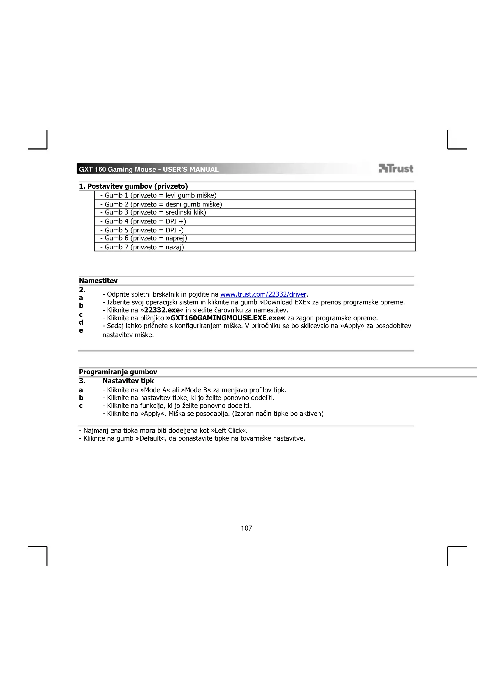 - Odprite spletni brskalnik in pojdite na www.trust.com/22332/driver. - Izberite svoj operacijski sistem in kliknite na gumb »Download EXE« za prenos programske opreme. - Kliknite na »22332.exe« in sledite čarovniku za namestitev. - Kliknite na bližnjico »GXT160GAMINGMOUSE.EXE.exe« za zagon programske opreme. - Sedaj lahko pričnete s konfiguriranjem miške. V priročniku se bo sklicevalo na »Apply« za posodobitev nastavitev miške.