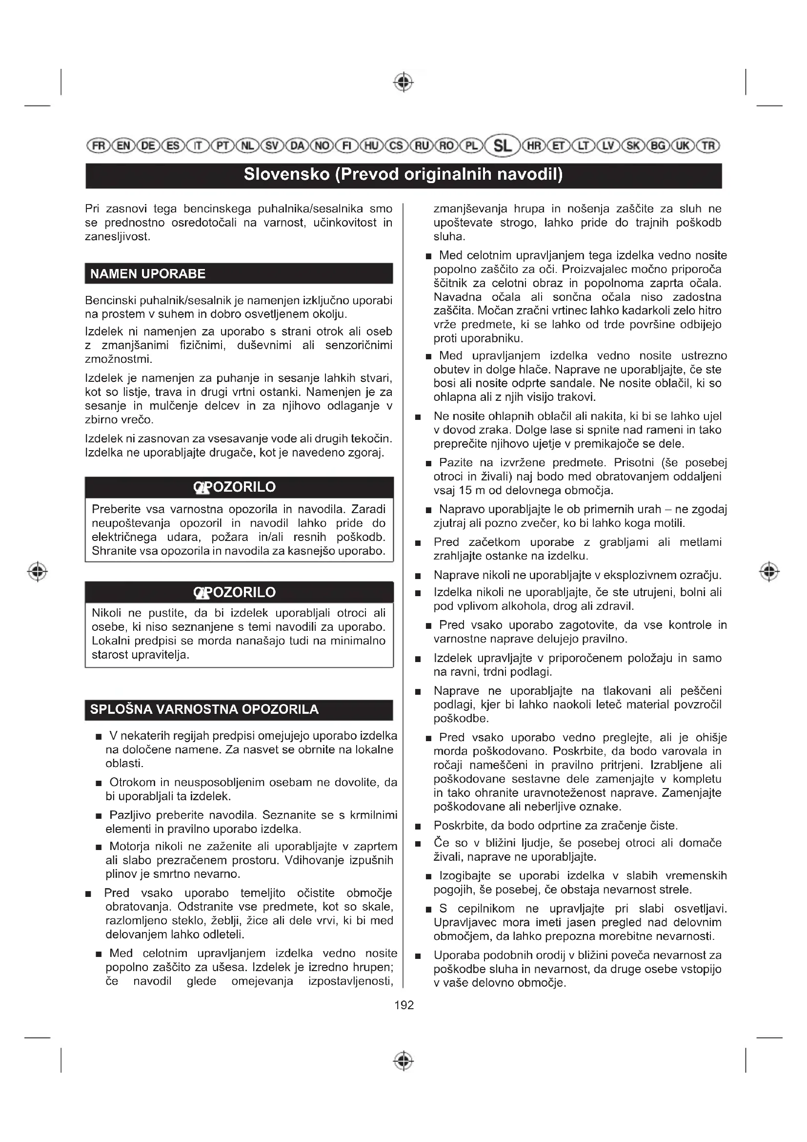 UWAGI: ■ Konserwację należy przeprowadzać częściej, gdy produkt jest użytkowany w miejscach zapylonych. ■ Jeżeli maksymalne wartości podane w tabeli zostaną przekroczone, czynności konserwacyjne należy nadal przeprowadzać w określonych odstępach.192 Slovensko (Prevod originalnih navodil) Pri zasnovi tega bencinskega puhalnika/sesalnika smo se prednostno osredotočali na varnost, učinkovitost in zanesljivost. NAMEN UPORABE Bencinski puhalnik/sesalnik je namenjen izključno uporabi na prostem v suhem in dobro osvetljenem okolju. Izdelek ni namenjen za uporabo s strani otrok ali oseb z zmanjšanimi fi zičnimi, duševnimi ali senzoričnimi zmožnostmi. Izdelek je namenjen za puhanje in sesanje lahkih stvari, kot so listje, trava in drugi vrtni ostanki. Namenjen je za sesanje in mulčenje delcev in za njihovo odlaganje v zbirno vrečo. Izdelek ni zasnovan za vsesavanje vode ali drugih tekočin. Izdelka ne uporabljajte drugače, kot je navedeno zgoraj. OPOZORILO Preberite vsa varnostna opozorila in navodila. Zaradi neupoštevanja opozoril in navodil lahko pride do električnega udara, požara in/ali resnih poškodb. Shranite vsa opozorila in navodila za kasnejšo uporabo. OPOZORILO Nikoli ne pustite, da bi izdelek uporabljali otroci ali osebe, ki niso seznanjene s temi navodili za uporabo. Lokalni predpisi se morda nanašajo tudi na minimalno starost upravitelja.