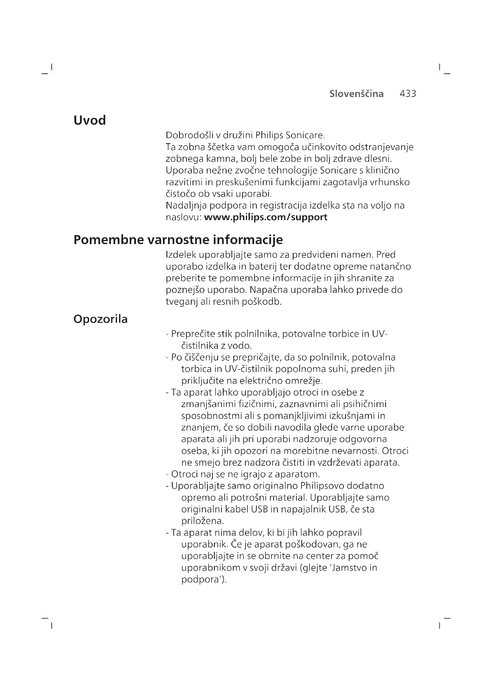 Slovenščina Uvod Dobrodošli v družini Philips Sonicare. Ta zobna ščetka vam omogoča učinkovito odstranjevanje zobnega kamna, bolj bele zobe in bolj zdrave dlesni. Uporaba nežne zvočne tehnologije Sonicare s klinično razvitimi in preskušenimi funkcijami zagotavlja vrhunsko čistočo ob vsaki uporabi. Nadaljnja podpora in registracija izdelka sta na voljo na naslovu: www.philips.com/support Pomembne varnostne informacije Izdelek uporabljajte samo za predvideni namen. Pred uporabo izdelka in baterij ter dodatne opreme natančno preberite te pomembne informacije in jih shranite za poznejšo uporabo. Napačna uporaba lahko privede do tveganj ali resnih poškodb. Opozorila - Preprečite stik polnilnika, potovalne torbice in UV- čistilnika z vodo. - Po čiščenju se prepričajte, da so polnilnik, potovalna torbica in UV-čistilnik popolnoma suhi, preden jih priključite na električno omrežje. - Ta aparat lahko uporabljajo otroci in osebe z zmanjšanimi fizičnimi, zaznavnimi ali psihičnimi sposobnostmi ali s pomanjkljivimi izkušnjami in znanjem, če so dobili navodila glede varne uporabe aparata ali jih pri uporabi nadzoruje odgovorna oseba, ki jih opozori na morebitne nevarnosti. Otroci ne smejo brez nadzora čistiti in vzdrževati aparata. - Otroci naj se ne igrajo z aparatom. - Uporabljajte samo originalno Philipsovo dodatno opremo ali potrošni material. Uporabljajte samo originalni kabel USB in napajalnik USB, če sta priložena. - Ta aparat nima delov, ki bi jih lahko popravil uporabnik. Če je aparat poškodovan, ga ne uporabljajte in se obrnite na center za pomoč uporabnikom v svoji državi (glejte 'Jamstvo in podpora').434 Slovenščina - Če je kabelUSB ali napajalnik USB poškodovan, ga ne uporabljajte. - Polnilnika, potovalne torbice in/ali UV-čistilnika ne uporabljajte na prostem ali v bližini ogrevanih površin. - Nobenega dela izdelka ne pomivajte v pomivalnem stroju. - Ta aparat je namenjen samo čiščenju zob, dlesni in jezika. - UV-čistilnik vedno hranite zunaj dosega otrok. - UV-čistilnik prenehajte uporabljati, če UV-lučka/sijalka sveti, ko je UV-čistilnik odprt. UV-svetloba lahko škoduje očem in koži. - Čistilnik uporabljajte samo z nameščenim ščitnikom. - UV-sijalke UV-čistilnika se ne dotikajte, dokler je vroča. - Ne uporabljajte glave ščetke, ki ima zmečkane ali upognjene ščetine. Glavo ščetke zamenjajte vsake tri mesece ali prej, če je izrabljena. - Izogibajte se neposrednemu stiku z izdelki, ki vsebujejo eterična olja ali kokosovo olje. Stik s temi snovmi lahko povzroči, da ščetine ščetke odpadejo. - Izdelek lahko uporabljate na največ 4500 metrih nadmorske višine. ZDRAVSTVENA OPOZORILA - Če se po uporabi pojavi čezmerna krvavitev, če se krvavitev še naprej pojavlja po enem tednu uporabe ali če občutite nelagodje ali bolečino, nehajte uporabljati aparat in se posvetujte z zobozdravnikom ali zdravnikom. - Če ste v preteklih dveh mesecih prestali operacijo v ustih ali na dlesnih, se pred uporabo tega aparata posvetujte z zobozdravnikom. - Če imate srčni spodbujevalnik ali morebitni drug vsadek, se pred začetkom uporabe aparata obrnite na zdravnika ali proizvajalca vsadka. - Če imate medicinske zadržke, se pred uporabo aparata posvetujte z zdravnikom. - Aparat je namenjen osebni negi in ne za več bolnikov v zobozdravstveni ordinaciji ali ustanovi.435 Slovenščina Varnostna navodila glede baterij - V tem aparatu so baterije, ki jih smejo odstraniti samo usposobljene osebe. - Izdelek uporabljajte samo za predvideni namen. Pred uporabo izdelka in baterij ter dodatne opreme natančno preberite te informacije in jih shranite za poznejšo uporabo. Napačna uporaba lahko privede do tveganj ali resnih poškodb. Priložena dodatna oprema se lahko razlikuje glede na izdelek. - Uporabljajte samo originalno Philipsovo dodatno opremo in potrošni material. Uporabljajte samo odstranljivi napajalnik TCBxxxx (vhodne nazivne vrednosti: ~100–240V; 50/60Hz; 1,5W), HX6100 (vhodne nazivne vrednosti: ~100–240V; 50/60Hz; 1,4W), HX6110 (vhodne nazivne vrednosti: ~100–240V; 50/60Hz; 1,5W), HX6160 (vhodne nazivne vrednosti: ~100–240V; 50/60Hz; 6W) in WAAxxxx (vhodne nazivne vrednosti: ~100–240V; 50/60Hz; 3,5W). - Izdelka in baterij ne približujte ognju in jih ne izpostavljajte neposredni sončni svetlobi ali visokim temperaturam. - Če se izdelek nenavadno močno segreje, ima močan vonj ali spremeni barvo oziroma če polnjenje traja dlje kot običajno, ga nehajte uporabljati in polniti ter se obrnite na družbo Philips. - Izdelkov in baterij ne dajajte v mikrovalovno pečico ali na indukcijska kuhališča. - Izdelka ali baterije ne odpirajte, spreminjajte, prebadajte, poškodujte ali razstavljajte, da se baterije ne bi pregrele ali začele sproščati strupenih ali nevarnih snovi. Pazite, da na baterijah ne pride do kratkega stika in jih ne polnite čezmerno ali obratno. - V tem aparatu so baterije, ki jih ni mogoče zamenjati. Ko bateriji poteče življenjska doba, je treba aparat ustrezno zavreči; glejte poglavje o recikliranju. - Če so baterije poškodovane ali puščajo, pazite, da ne pridejo v stik z očmi ali kožo. Če se to zgodi, prizadeto mesto nemudoma izperite z veliko vode in poiščite zdravniško pomoč.436 Slovenščina - Ko ravnate z baterijami, pazite, da bodo vaše roke, izdelek in baterije suhi. - Izdelek polnite in uporabljajte pri temperaturi med 0 in 40 °C. - Pazite, da priključne sponke baterij ne pridejo v stik s kovinskimi predmeti (npr. kovanci, sponkami za lase, prstani), da ne pride do nenamernega kratkega stika. Baterij ne zavijajte v aluminijasto folijo. Preden baterijo zavržete, zlepite njene kontakte ali jo dajte v plastično vrečko. - V tem aparatu je litij-ionska akumulatorska baterija.