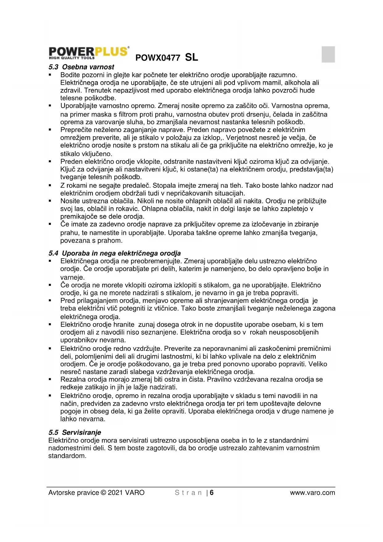 - Če morate električno orodje uporabljati na vlažnem mestu, napajanje zaščitite z napravo za zaščito pred prednapetostjo (RCD). Uporaba naprave RCD zmanjšuje tveganje električnega udara.POWX0477 SL Avtorske pravice © 2021 VARO S t r a n | 5 www.varo.comPOWX0477 SL Avtorske pravice © 2021 VARO S t r a n | 6 www.varo.com