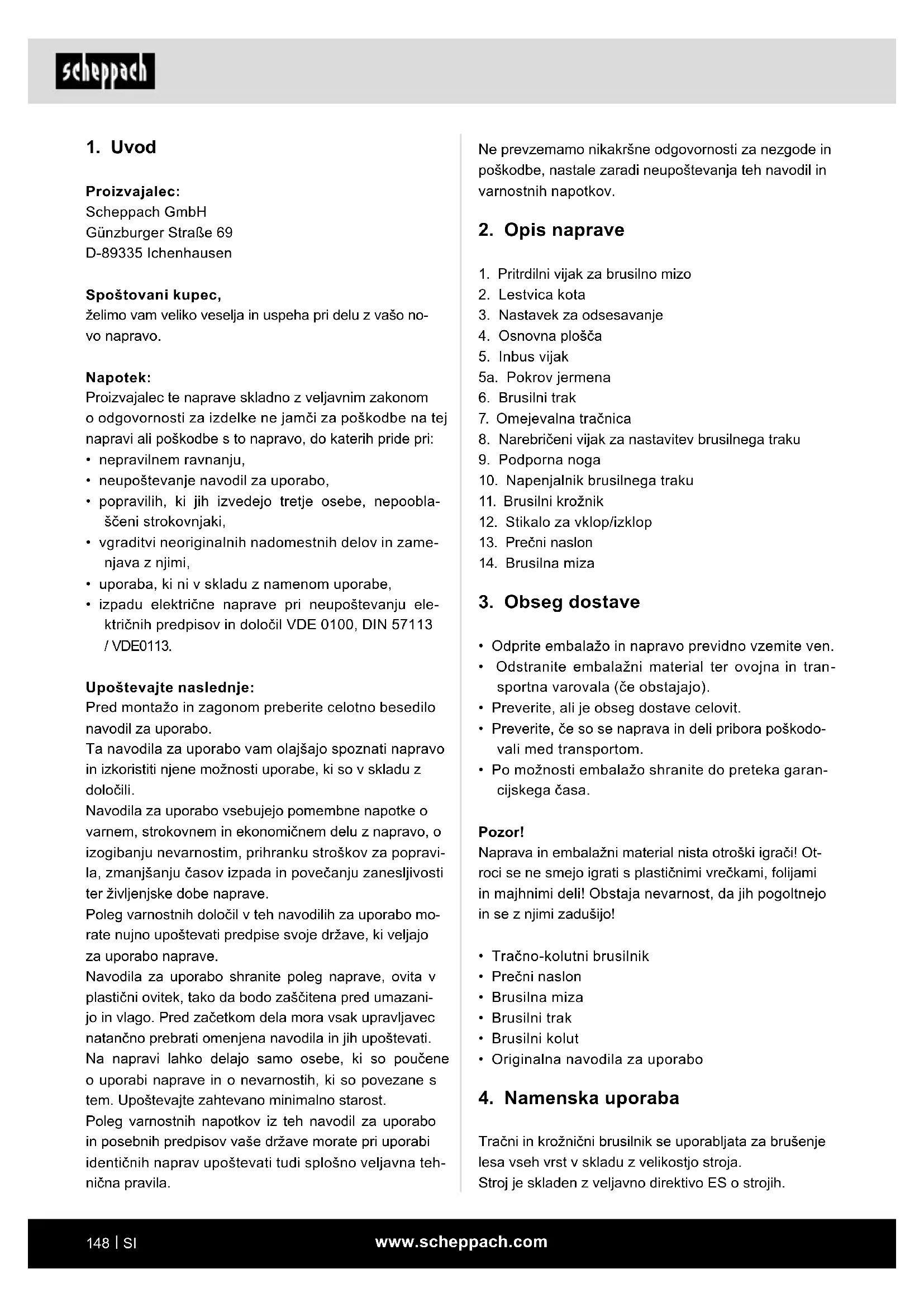 Proizvajalec: Scheppach GmbH Günzburger Straße 69 D-89335 Ichenhausen Spoštovani kupec, želimo vam veliko veselja in uspeha pri delu z vašo no- vo napravo. Napotek: Proizvajalec te naprave skladno z veljavnim zakonom o odgovornosti za izdelke ne jamči za poškodbe na tej napravi ali poškodbe s to napravo, do katerih pride pri: