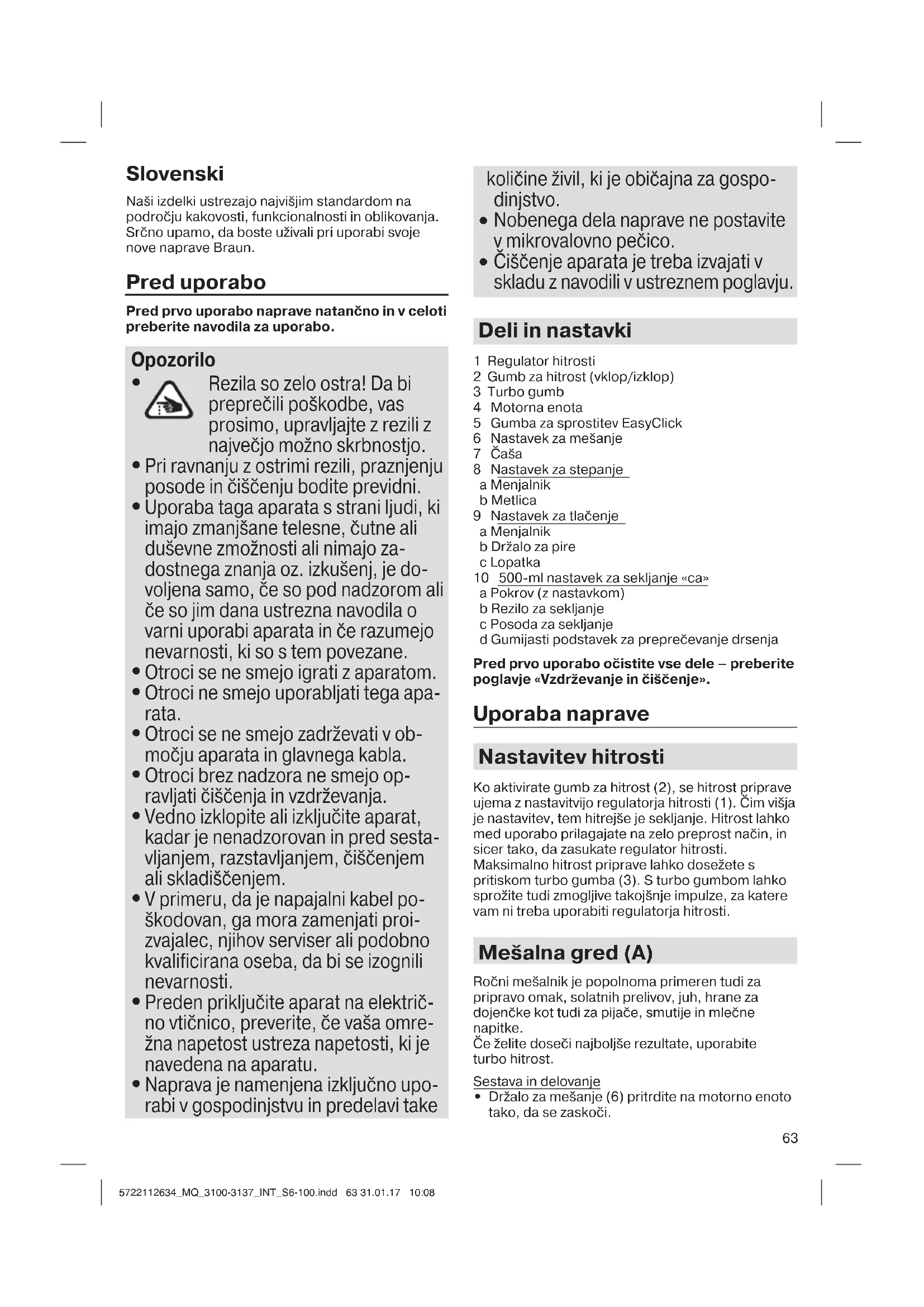Čiščenje aparata je treba izvajati v skladu z navodili v ustreznem poglavju. Deli in nastavki 1 Regulator hitrosti 2 Gumb za hitrost (vklop/izklop) 3 Turbo gumb 4 Motorna enota 5 Gumba za sprostitev EasyClick 6 Nastavek za mešanje 7 Čaša 8 Nastavek za stepanje a Menjalnik b Metlica 9 Nastavek za tlačenje a Menjalnik b Držalo za pire c Lopatka 10 500-ml nastavek za sekljanje «ca» a Pokrov (z nastavkom) b Rezilo za sekljanje c Posoda za sekljanje d Gumijasti podstavek za preprečevanje drsenja Pred prvo uporabo očistite vse dele – preberite poglavje «Vzdrževanje in čiščenje». Uporaba naprave Nastavitev hitrosti Ko aktivirate gumb za hitrost (2), se hitrost priprave ujema z nastavitvijo regulatorja hitrosti (1). Čim višja je nastavitev, tem hitrejše je sekljanje. Hitrost lahko med uporabo prilagajate na zelo preprost način, in sicer tako, da zasukate regulator hitrosti. Maksimalno hitrost priprave lahko dosežete s pritiskom turbo gumba (3). S turbo gumbom lahko sprožite tudi zmogljive takojšnje impulze, za katere vam ni treba uporabiti regulatorja hitrosti. Mešalna gred (A) Ročni mešalnik je popolnoma primeren tudi za pripravo omak, solatnih prelivov, juh, hrane za dojenčke kot tudi za pijače, smutije in mlečne napitke. Če želite doseči najboljše rezultate, uporabite turbo hitrost. Sestava in delovanje