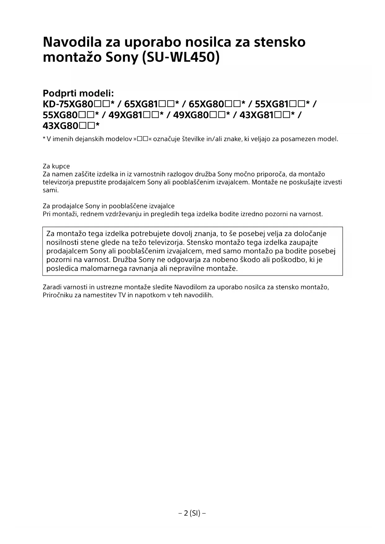 - V imenih dejanskih modelov »« označuje številke in/ali znake, ki veljajo za posamezen model. Za kupce Za namen zaščite izdelka in iz varnostnih razlogov družba Sony močno priporoča, da montažo televizorja prepustite prodajalcem Sony ali pooblaščenim izvajalcem. Montaže ne poskušajte izvesti sami. Za prodajalce Sony in pooblaščene izvajalce Pri montaži, rednem vzdrževanju in pregledih tega izdelka bodite izredno pozorni na varnost. Za montažo tega izdelka potrebujete dovolj znanja, to še posebej velja za določanje nosilnosti stene glede na težo televizorja. Stensko montažo tega izdelka zaupajte prodajalcem Sony ali pooblaščenim izvajalcem, med samo montažo pa bodite posebej pozorni na varnost. Družba Sony ne odgovarja za nobeno škodo ali poškodbo, ki je posledica malomarnega ravnanja ali nepravilne montaže. Zaradi varnosti in ustrezne montaže sledite Navodilom za uporabo nosilca za stensko montažo, Priročniku za namestitev TV in napotkom v teh navodilih.− 3 (SI) −