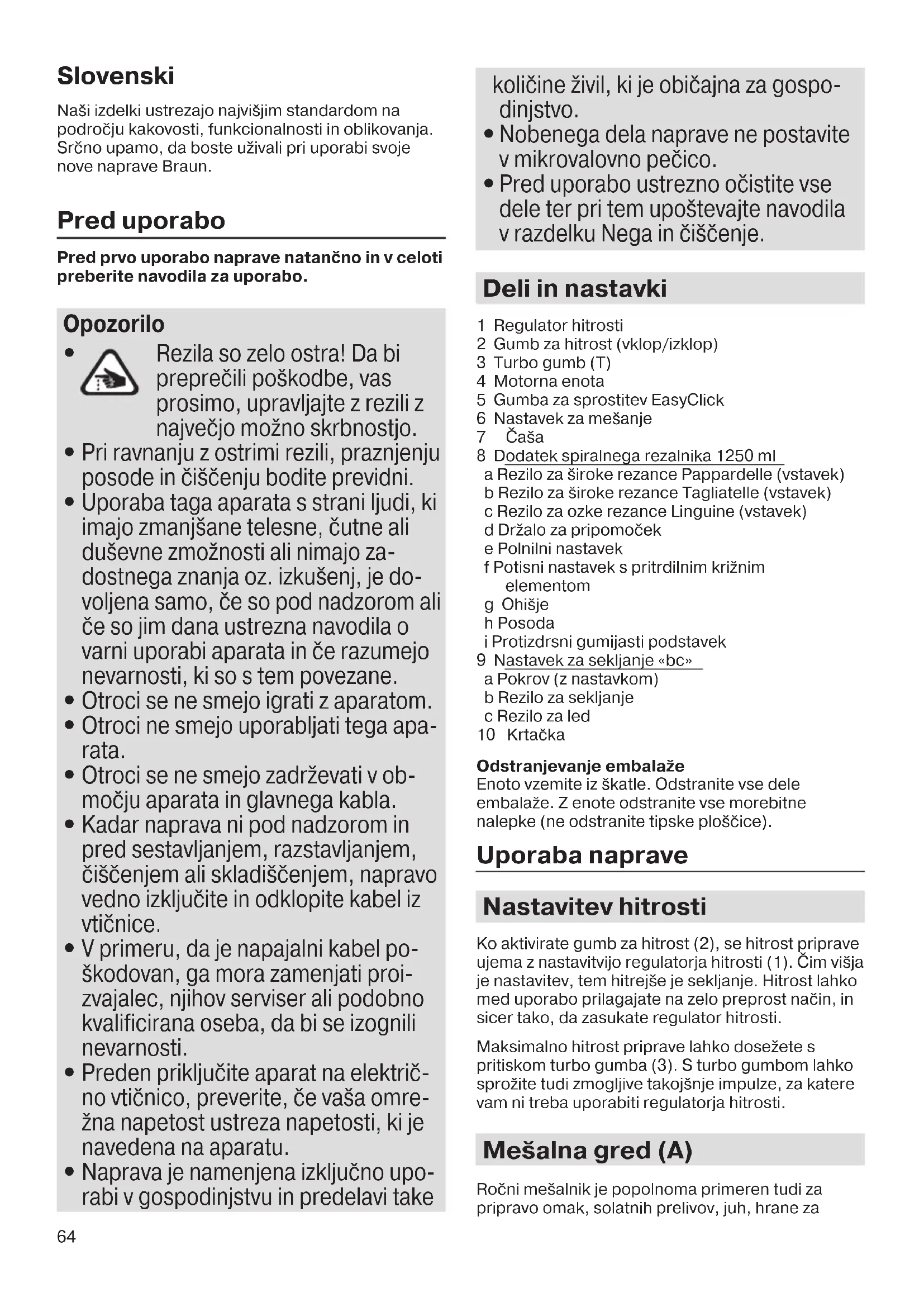 Pred uporabo ustrezno očistite vse dele ter pri tem upoštevajte navodila v razdelku Nega in čiščenje. Deli in nastavki 1 Regulator hitrosti 2 Gumb za hitrost (vklop/izklop) 3 Turbo gumb (T) 4 Motorna enota 5 Gumba za sprostitev EasyClick 6 Nastavek za mešanje 7 Čaša 8 Dodatek spiralnega rezalnika 1250 ml a Rezilo za široke rezance Pappardelle (vstavek) b Rezilo za široke rezance Tagliatelle (vstavek) c Rezilo za ozke rezance Linguine (vstavek) d Držalo za pripomoček e Polnilni nastavek f Potisni nastavek s pritrdilnim križnim elementom g Ohišje h Posoda i Protizdrsni gumijasti podstavek 9 Nastavek za sekljanje «bc» a Pokrov (z nastavkom) b Rezilo za sekljanje c Rezilo za led 10 Krtačka Odstranjevanje embalaže Enoto vzemite iz škatle. Odstranite vse dele embalaže. Z enote odstranite vse morebitne nalepke (ne odstranite tipske ploščice). Uporaba naprave Nastavitev hitrosti Ko aktivirate gumb za hitrost (2), se hitrost priprave ujema z nastavitvijo regulatorja hitrosti (1). Čim višja je nastavitev, tem hitrejše je sekljanje. Hitrost lahko med uporabo prilagajate na zelo preprost način, in sicer tako, da zasukate regulator hitrosti. Maksimalno hitrost priprave lahko dosežete s pritiskom turbo gumba (3). S turbo gumbom lahko sprožite tudi zmogljive takojšnje impulze, za katere vam ni treba uporabiti regulatorja hitrosti. Mešalna gred (A) Ročni mešalnik je popolnoma primeren tudi za pripravo omak, solatnih prelivov, juh, hrane za 5722113184_MQ_5060-5064_INT_S6-96.indd 64 24.05.18 14:2865 dojenčke kot tudi za pijače, smutije in mlečne napitke. Če želite doseči najboljše rezultate, uporabite najvišjo hitrost. Sestava in delovanje