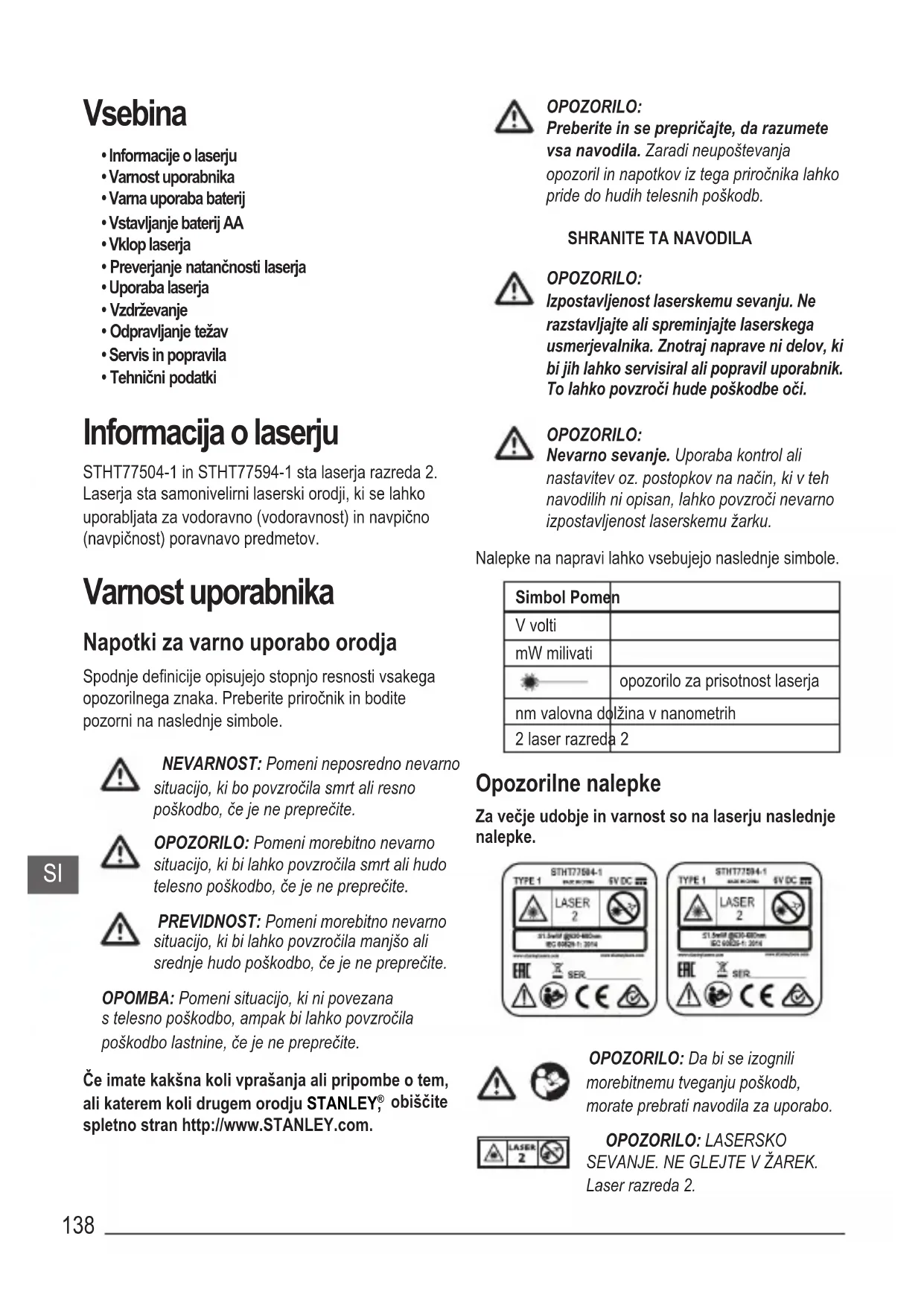 Uporabljaje le opre mo STANLEY, ki je priporočena za uporabo s tem modelom. Oprema je lahko primerna za eno vrsto laserja, vendar lahko z drugim laserjem povzroci nevarnost telesnih poskodb.