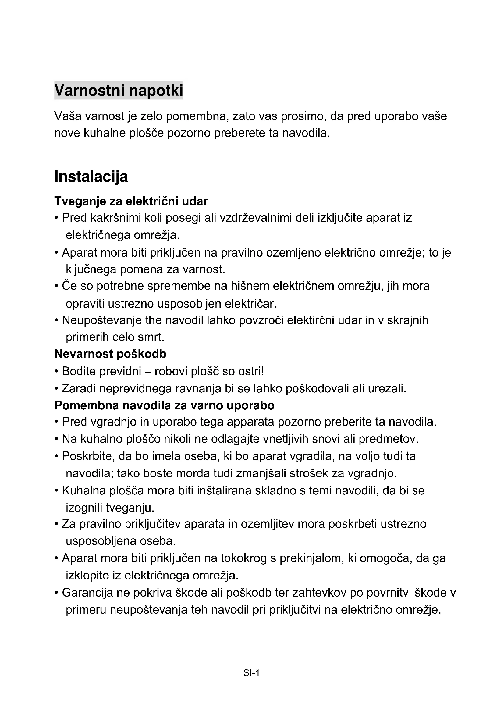 - Kuhalna plošča ni namenjena upravljanju s pomočjo zunanje programske ure ali zunanjega sistema za daljinsko upravljanje. SI-4Spoštovani kupec, hvala, da ste se odločili za nakup naše indukcijske kuhalne plošče. Prosimo, da pred uporabo kuhalne plošče pozorno preberete navodila za inštalacijo in za uporabo. Knjižico z navodili preberite v celoti, nato pa jo shranite na varno, saj jo boste morda še potrebovali.