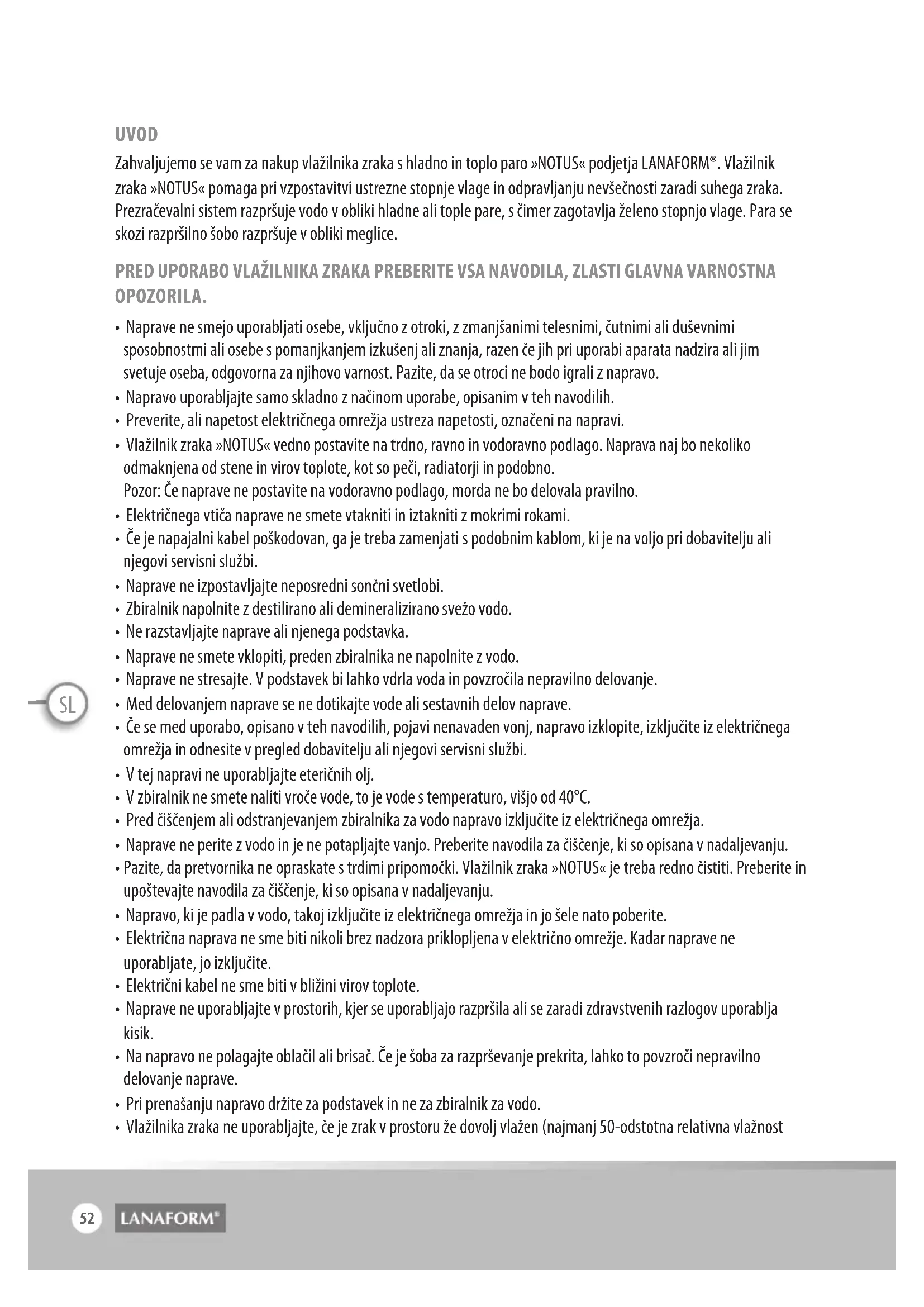 UVOD Zahvaljujemo se vam za nakup vlažilnika zraka s hladno in toplo paro »NOTUS« podjetja LANAFORM®. Vlažilnik zraka »NOTUS« pomaga pri vzpostavitvi ustrezne stopnje vlage in odpravljanju nevšečnosti zaradi suhega zraka. Prezračevalni sistem razpršuje vodo v obliki hladne ali tople pare, s čimer zagotavlja želeno stopnjo vlage. Para se skozi razpršilno šobo razpršuje v obliki meglice. PRED UPORABO VLAŽILNIKA ZRAKA PREBERITE VSA NAVODILA, ZLASTI GLAVNA VARNOSTNA OPOZORILA.